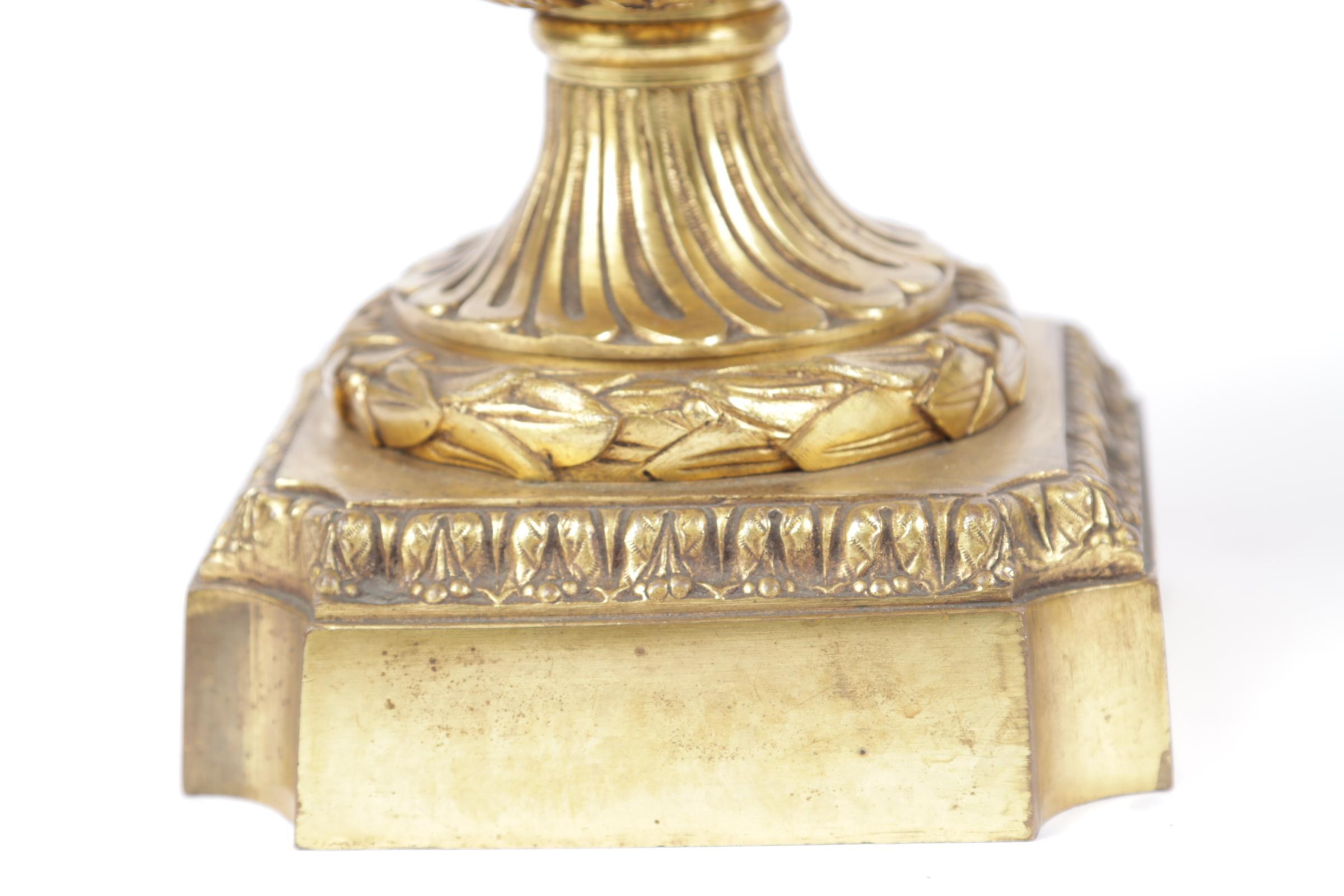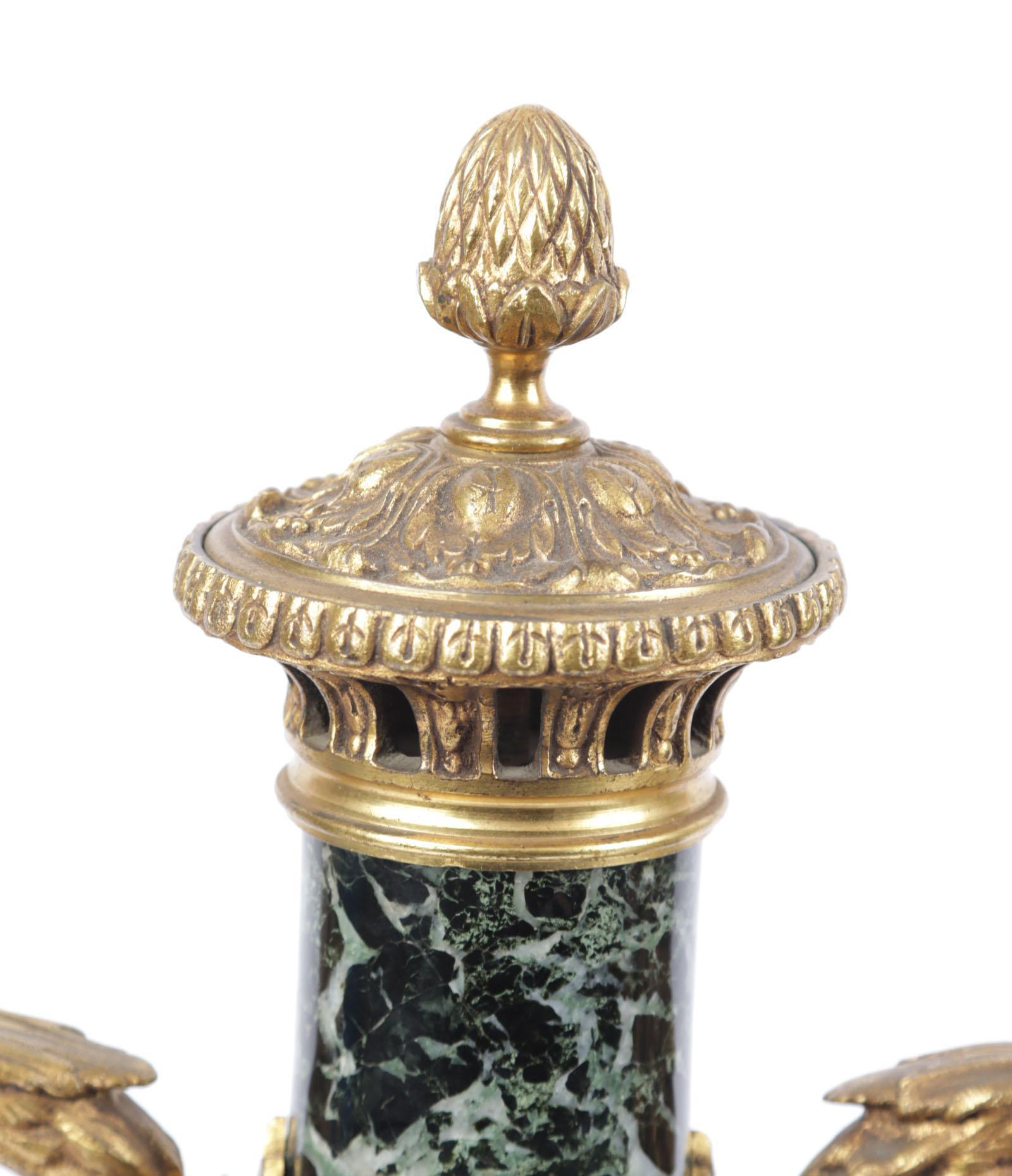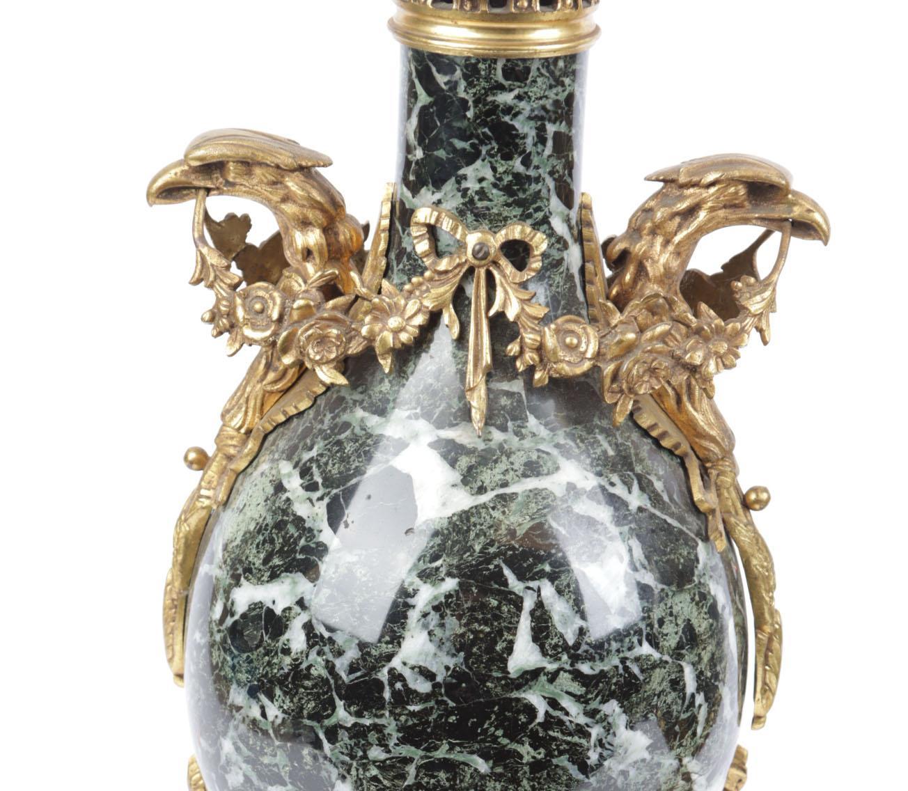 Twee groen marmeren cassolettes met brons afgezet en met gieren koppen, 19e eeuw, h.50 cm.