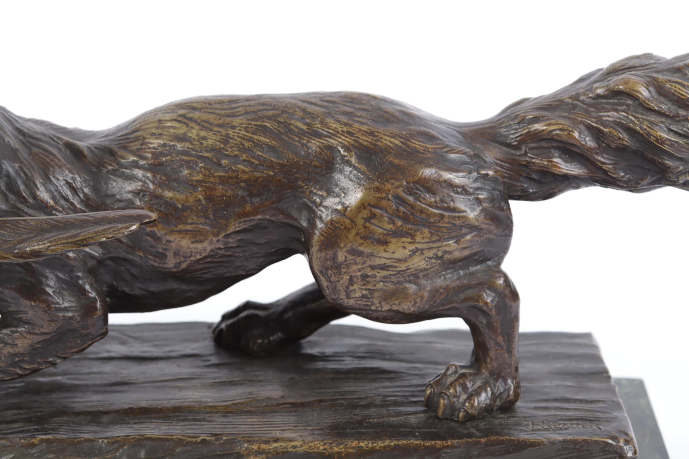Joseph Emile Renier (1887-1966), Renard Avec sa proie, bronzen sculptuur rustend op marmeren voetstuk, h.27 x b.18 x L.70 cm.