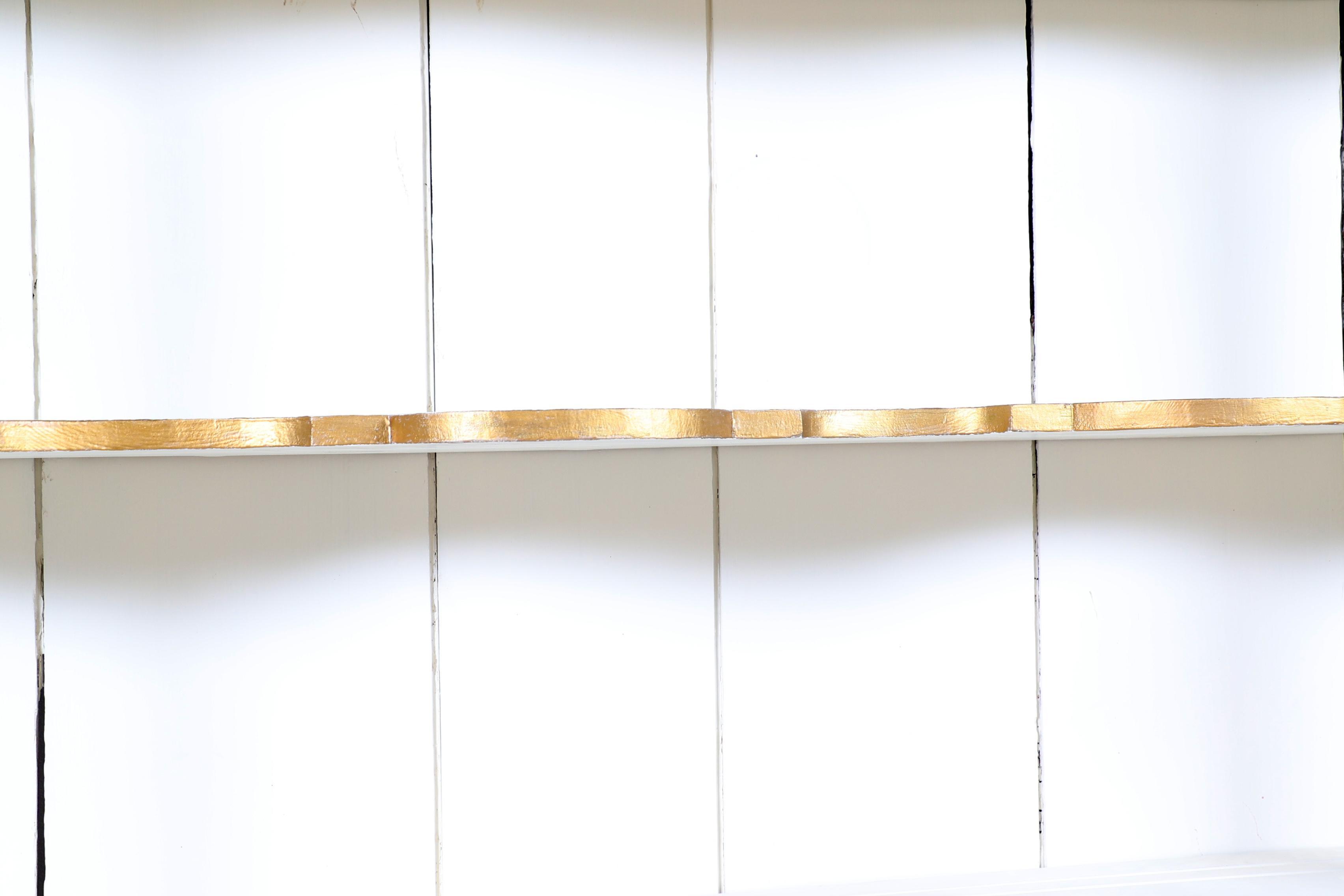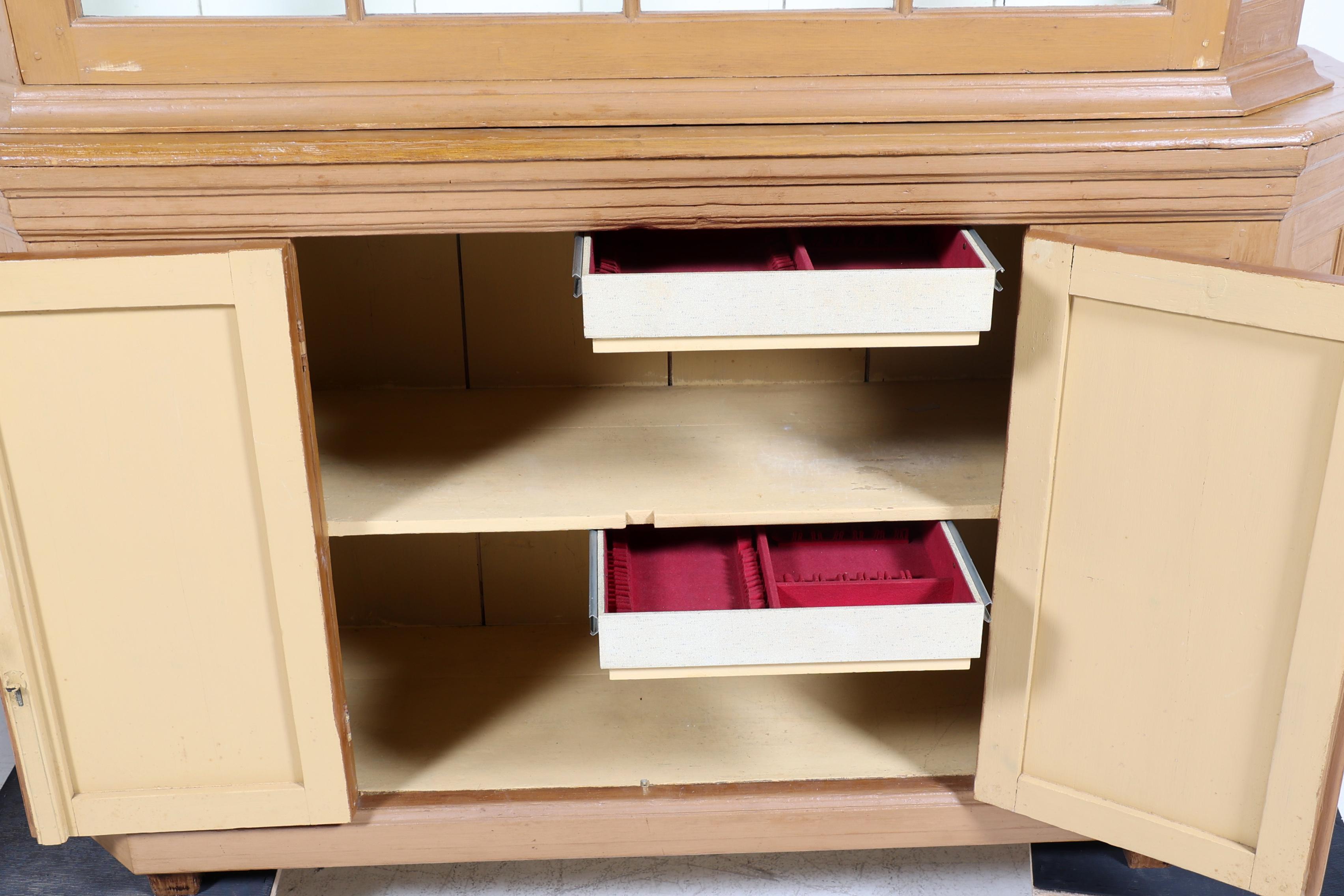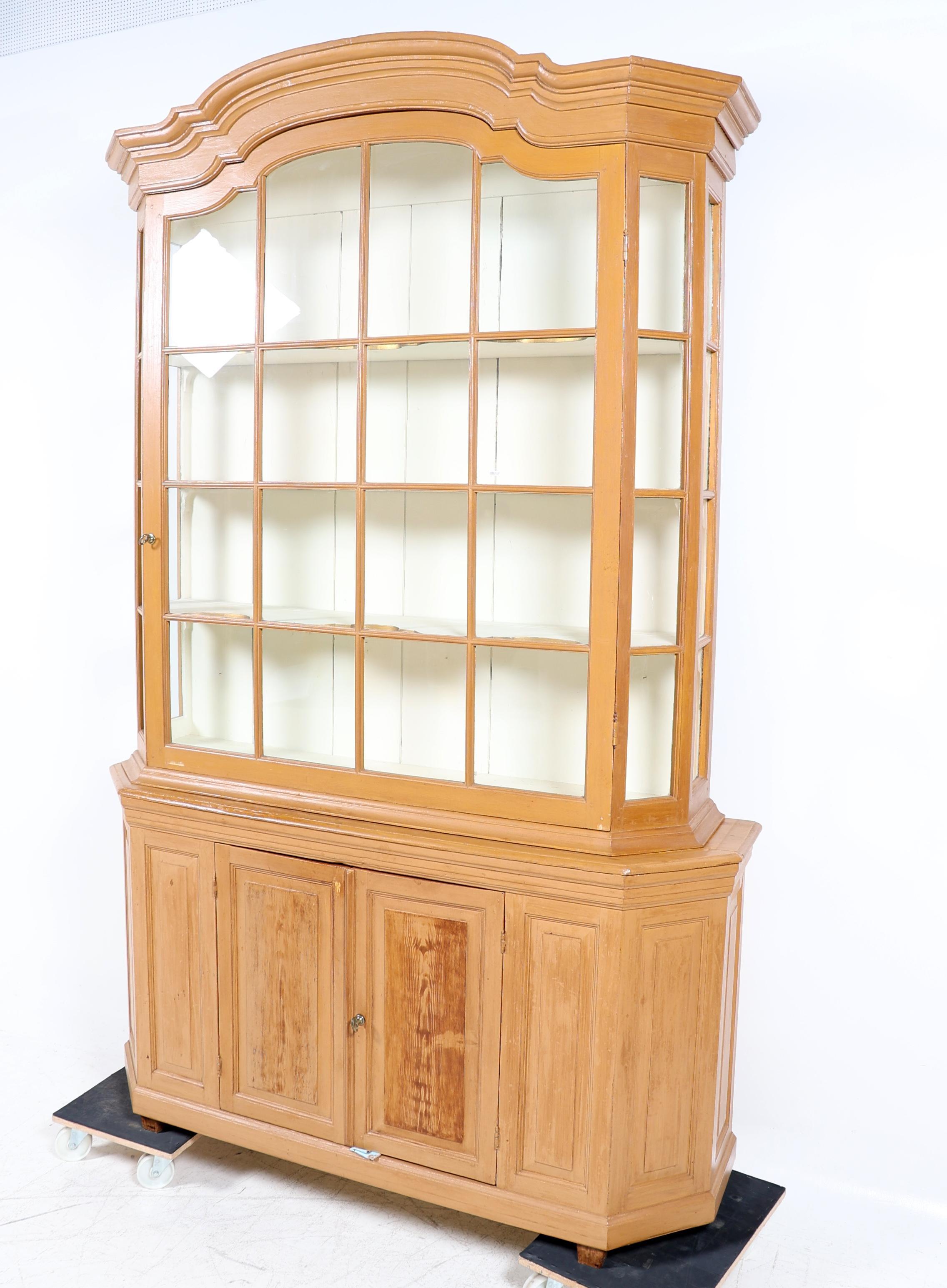 Antieke beschilderde vitrinekast met 2 dichte deuren in de onderkast, h.269 x b.175 x d.48 cm.