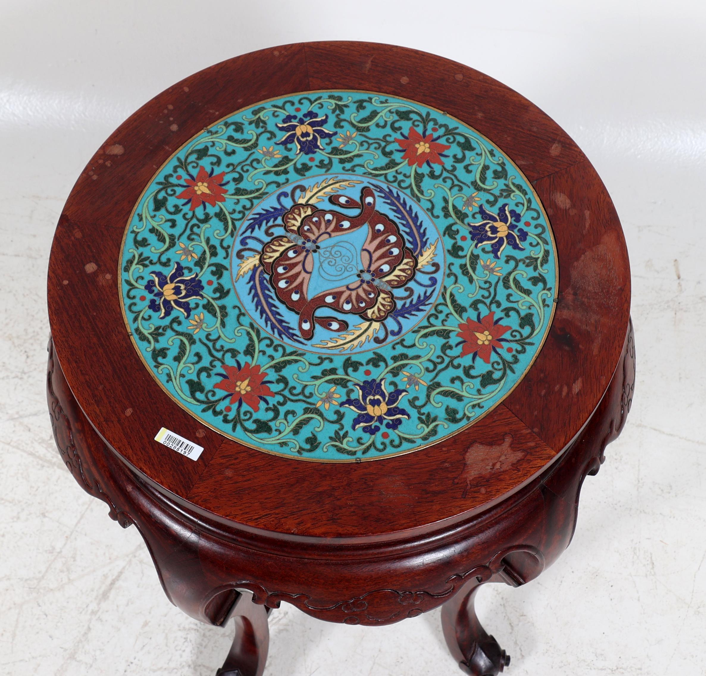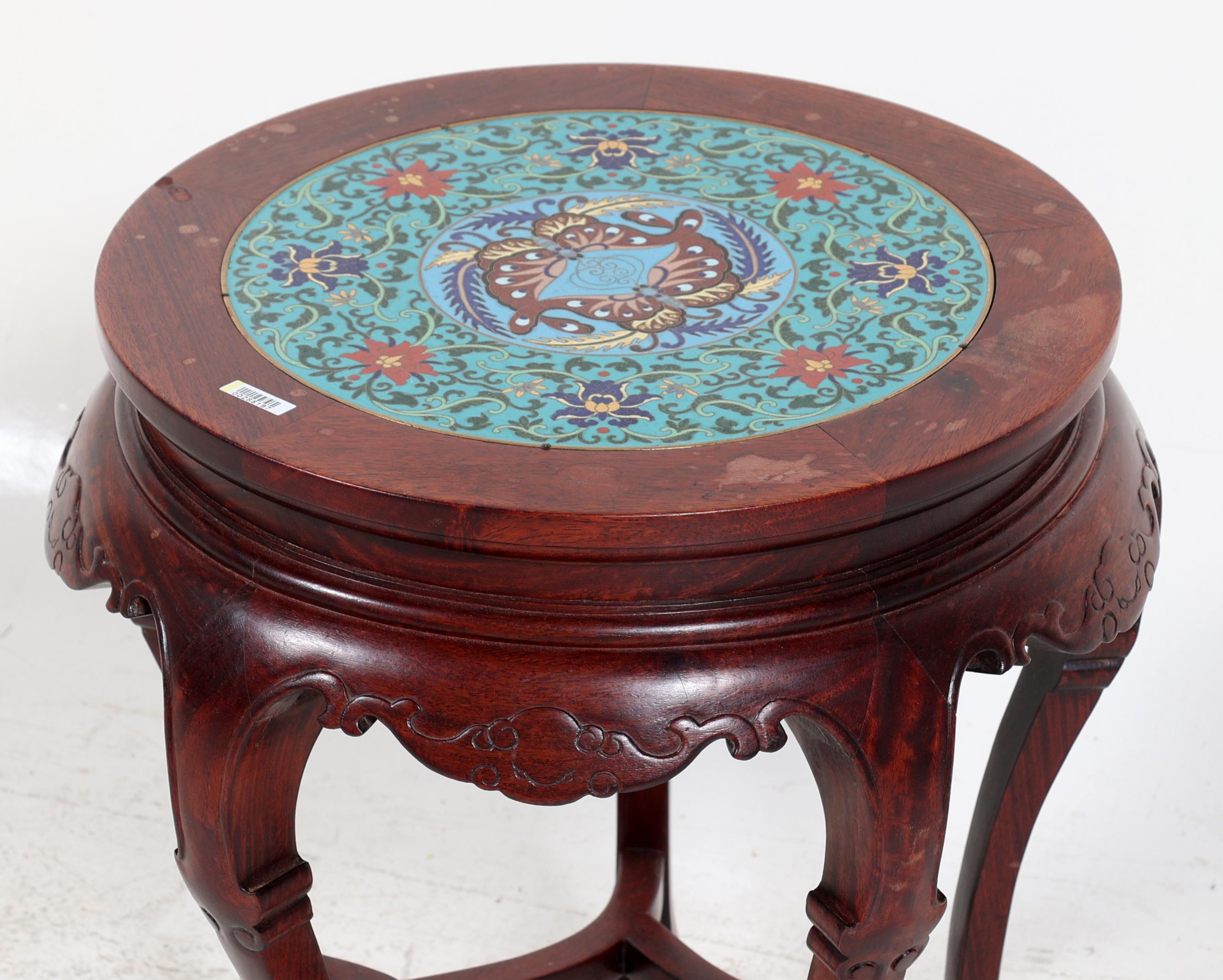 Chinese hardhouten bijzettafel met cloisonné blad, h.52 x diam.41 cm.