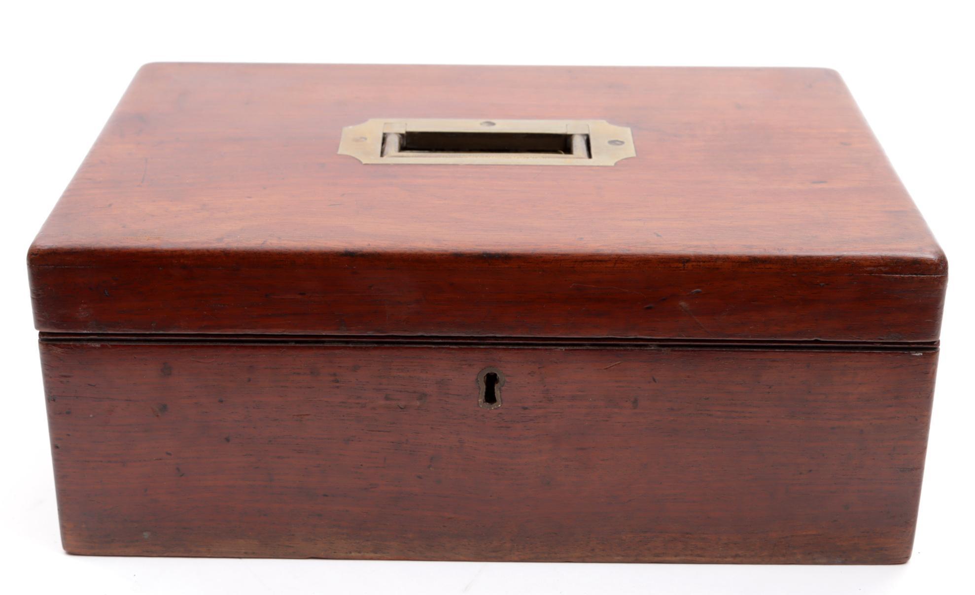 Antieke Engelse mahoniehouten scheepsschrijfkist met messing handvat