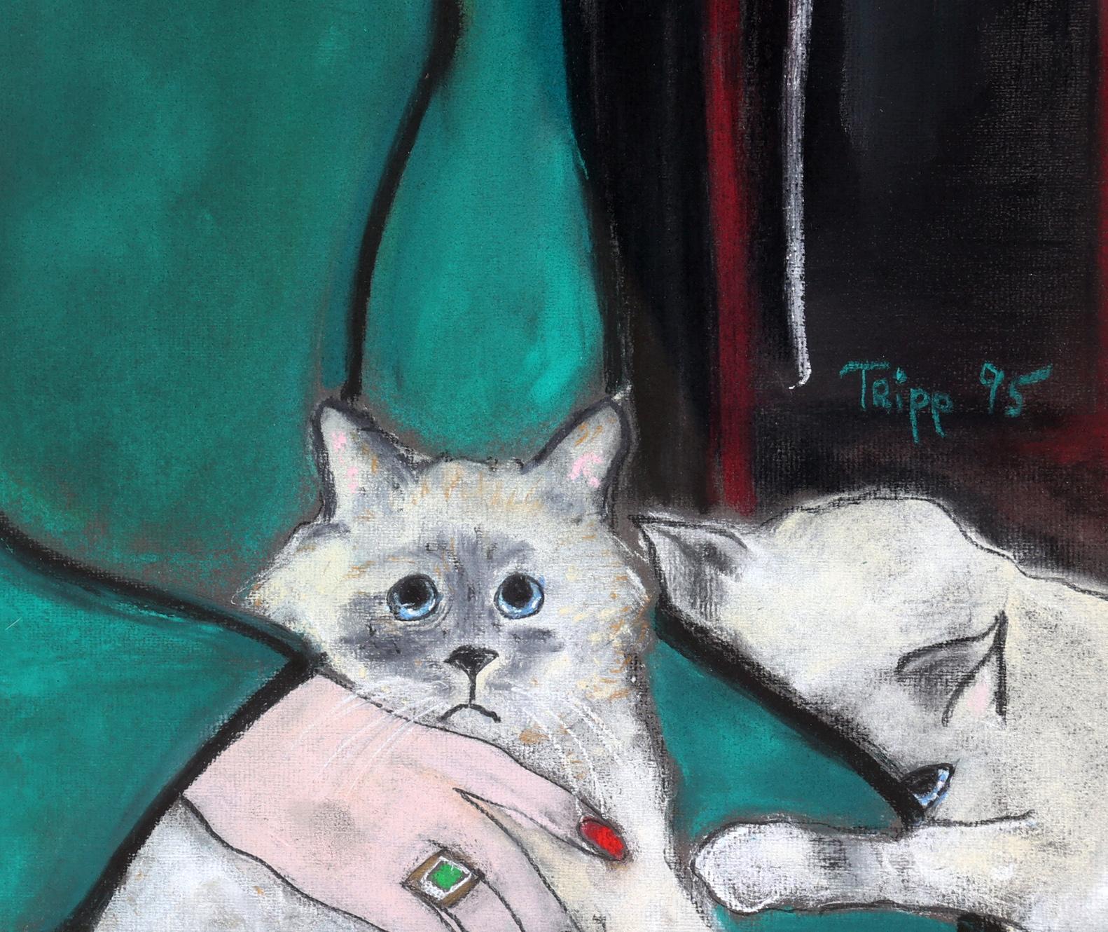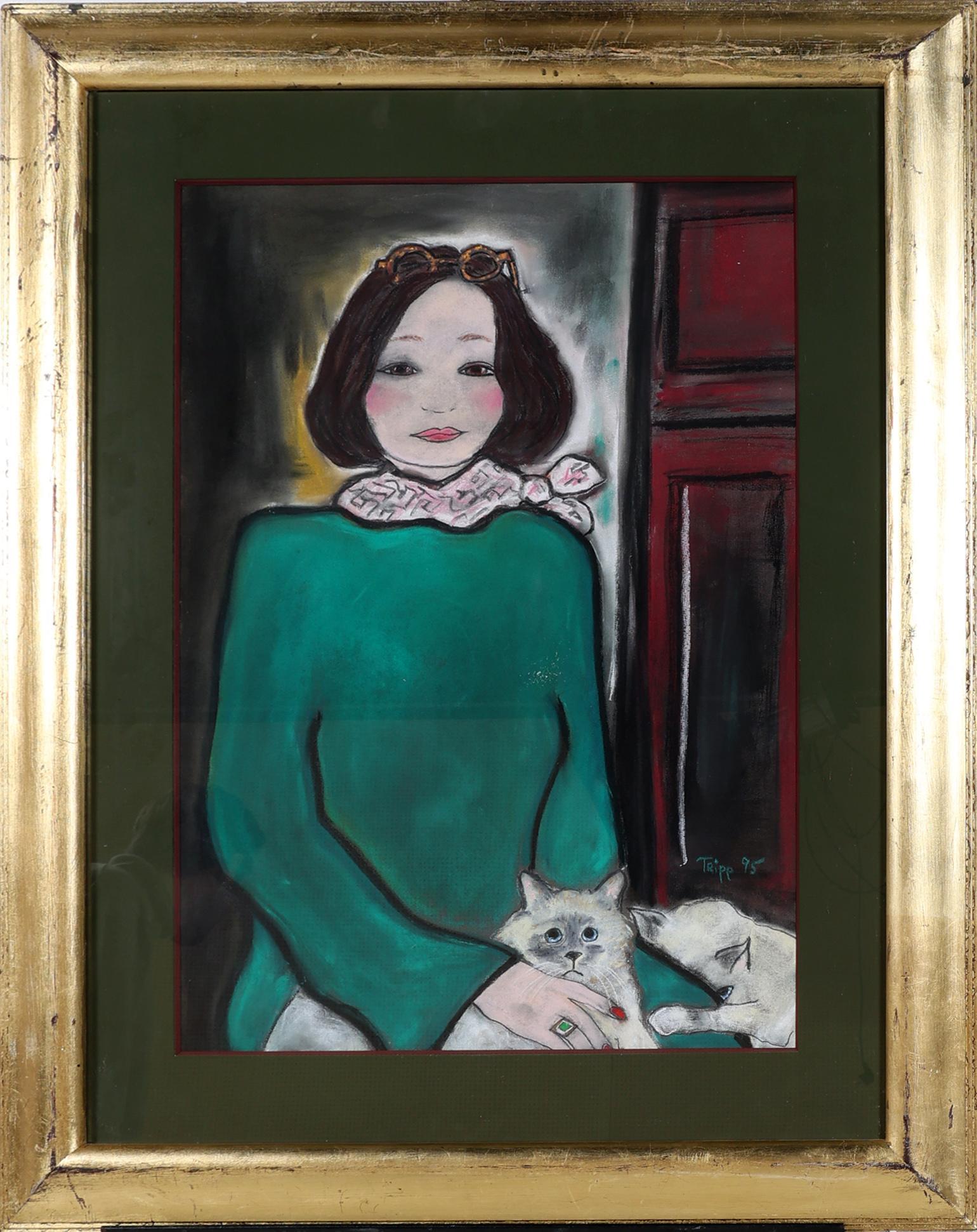Denise Tripp, Dame met poezen in interieur, pasteltekening, gedateerd '95, 69 x 49 cm. of 98 x 78 (incl. lijst). Provenance: collectie Kunsthandel Elisabeth den Bieman de Haas, Amsterdam