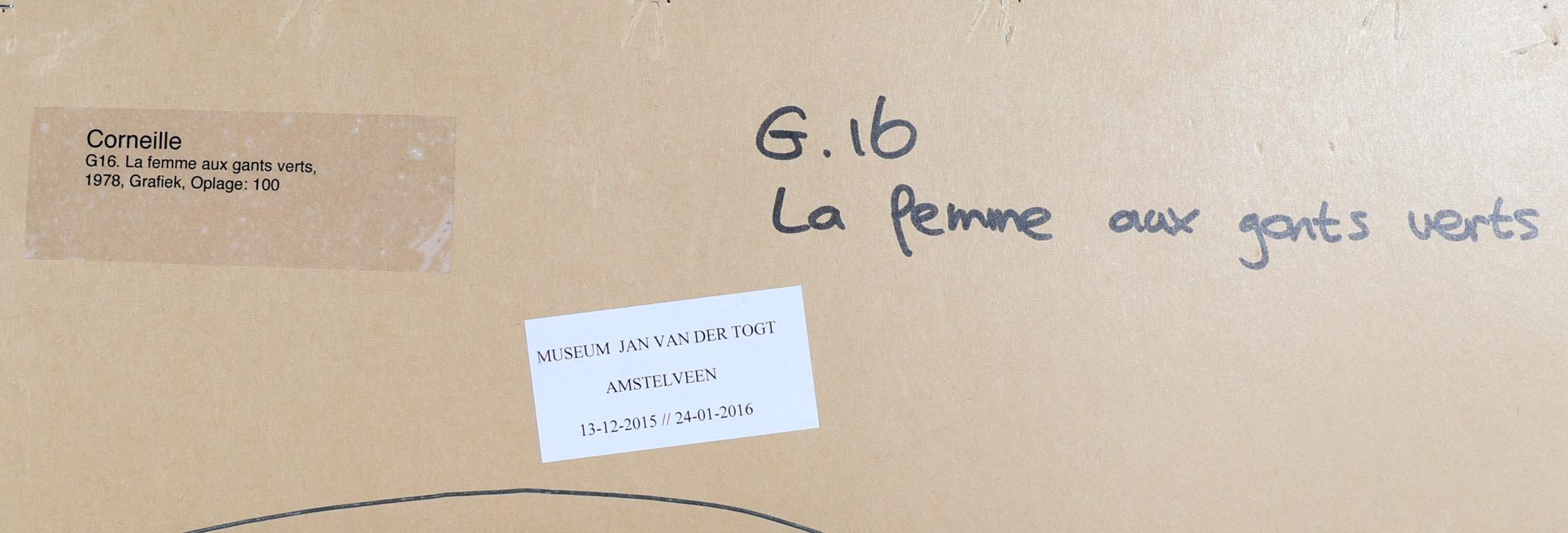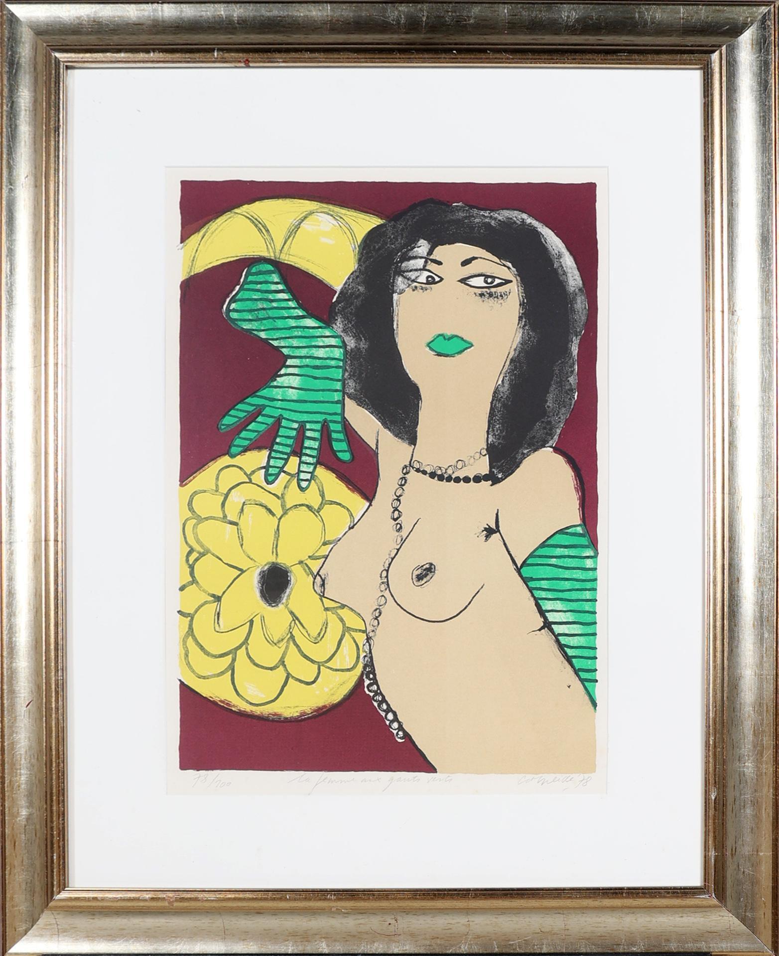 'Corneille', alias van Cornelis Guillaume van Beverloo (1922- 2010), La femme aux gants verts, handgesigneerde zeefdruk, gedateerd 1978 en genummerd 78/100, 55 x 39 cm. of 85 x 68. cm. (incl. lijst), lijst heeft beschadiging. Provenance: collectie Kunsthandel Elisabeth den Bieman de Haas, Amsterdam. Tentoonstelling: Museum Jan van der Togt, Amstelveen 2015 / 2016