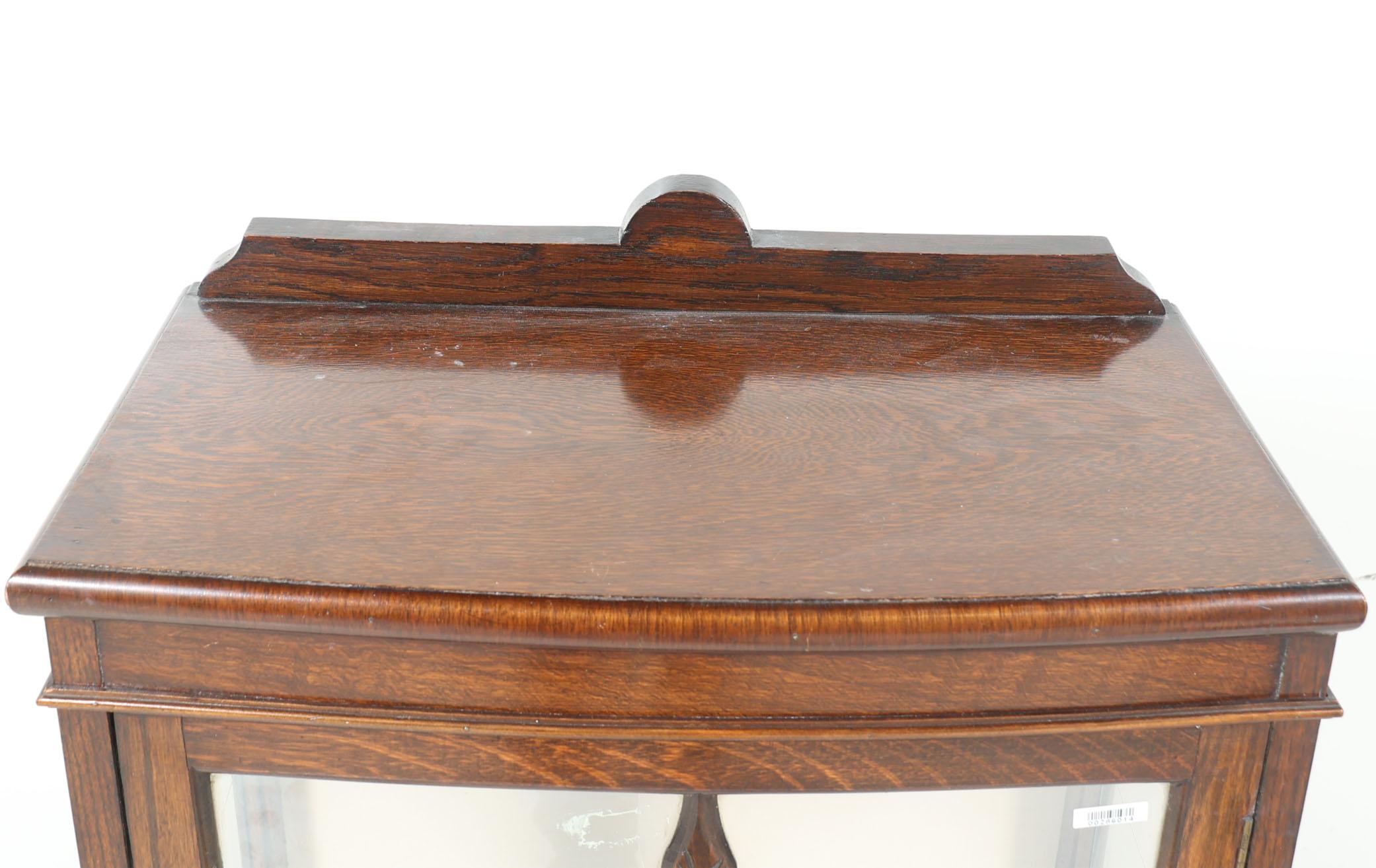 Eikenhouten 1-deurs vitrinekast rustend op cabriole poten, h.120 x b.54 x d.28 cm. (barstje in ruit)