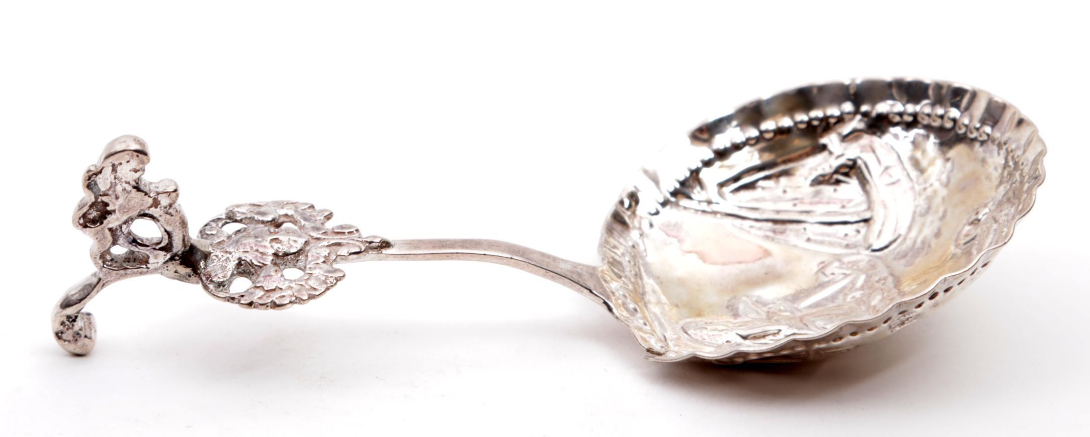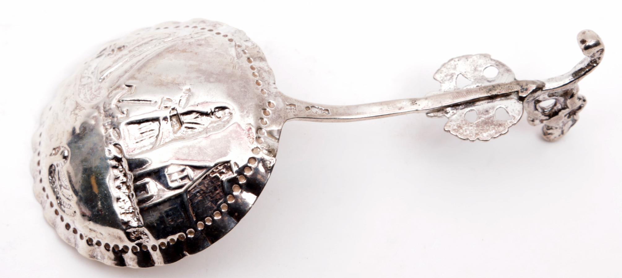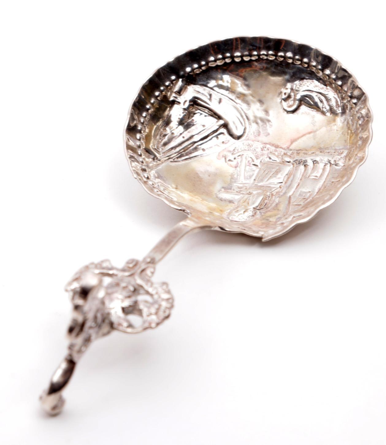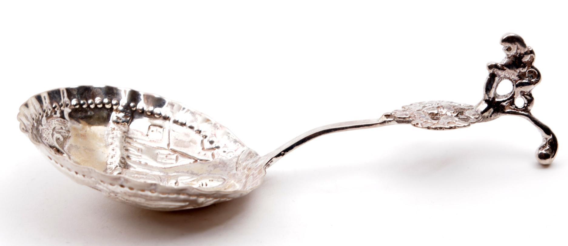 Zilveren roomlepel met tafereel van man met anker en schip, 19e eeuw