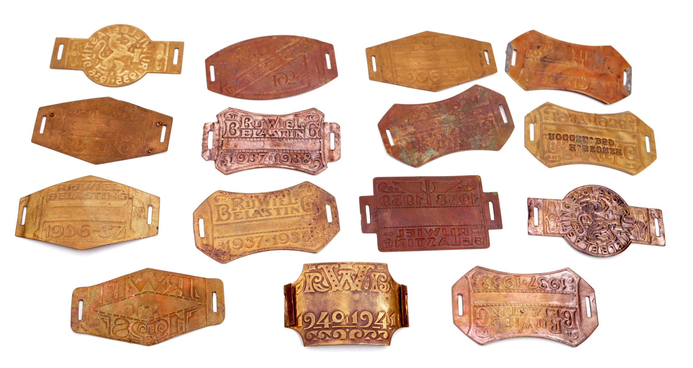 Koopje diverse fietsbelastingplaatjes jaren'30 w.o. met naam