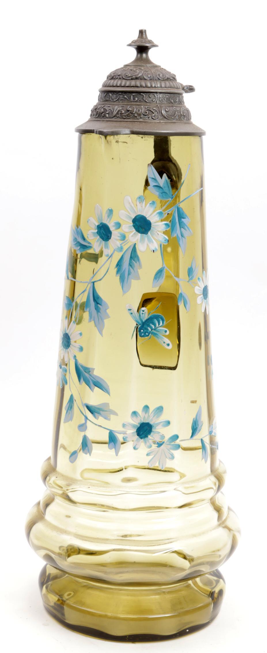 Glazen met bloemen gedecoreerde klepkan met tinnen deksel, 19e eeuw, h.41 cm.