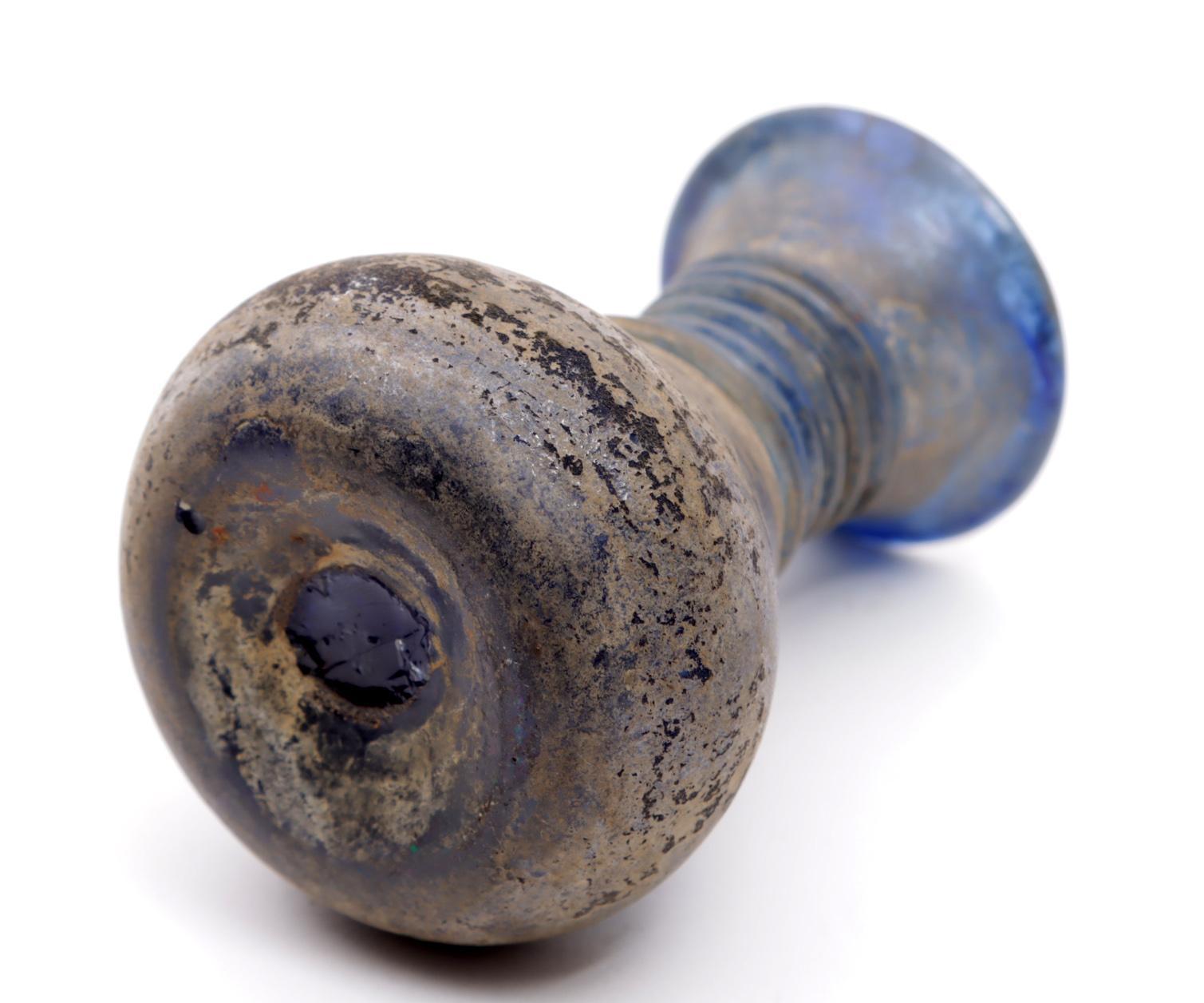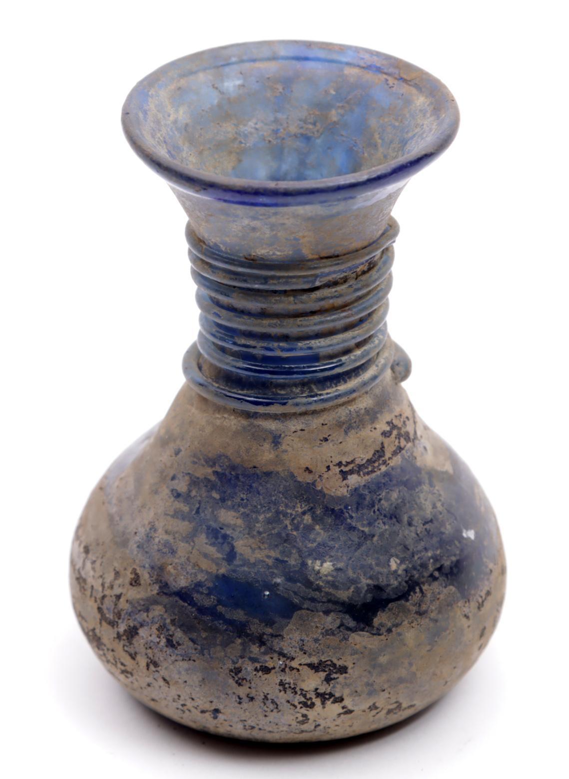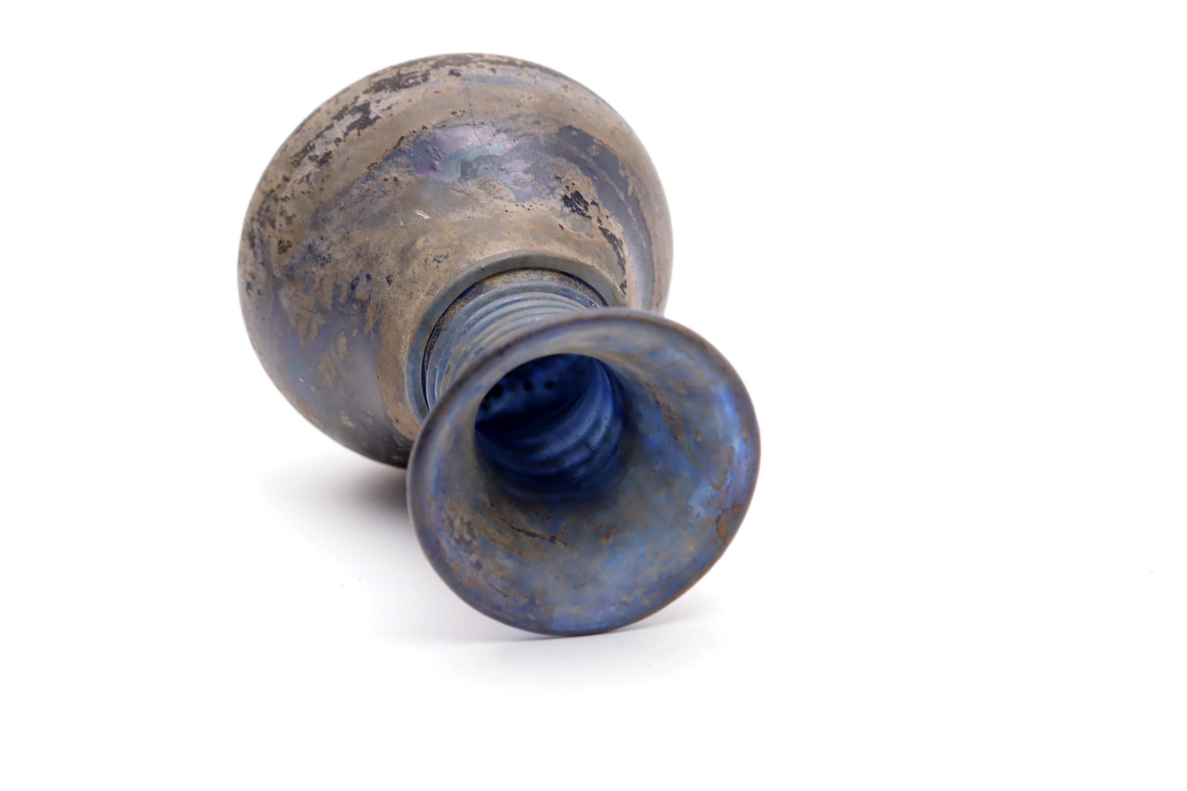 Antiek blauw glazen flesje met draadglas en irrisatie, h.9 cm.
