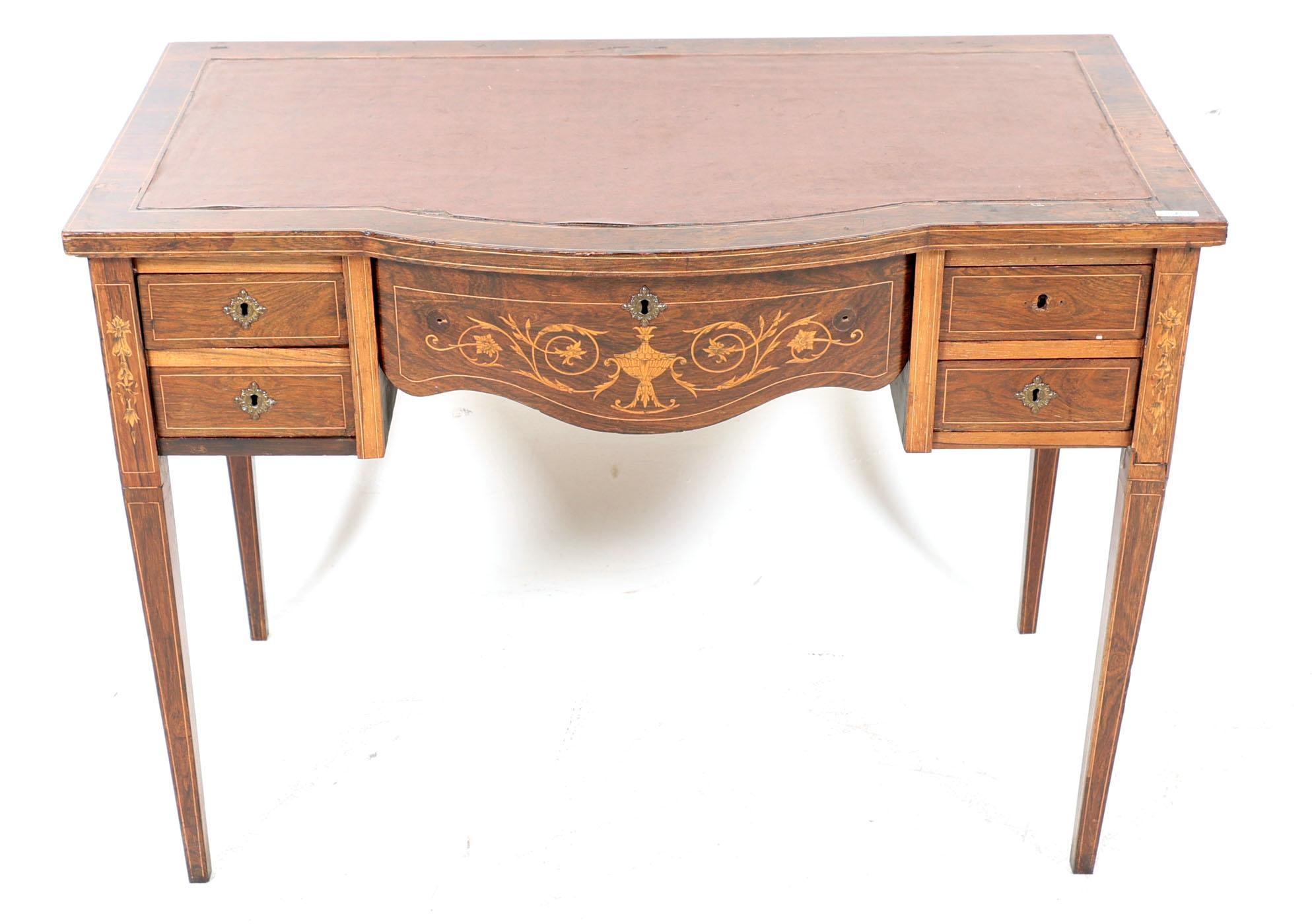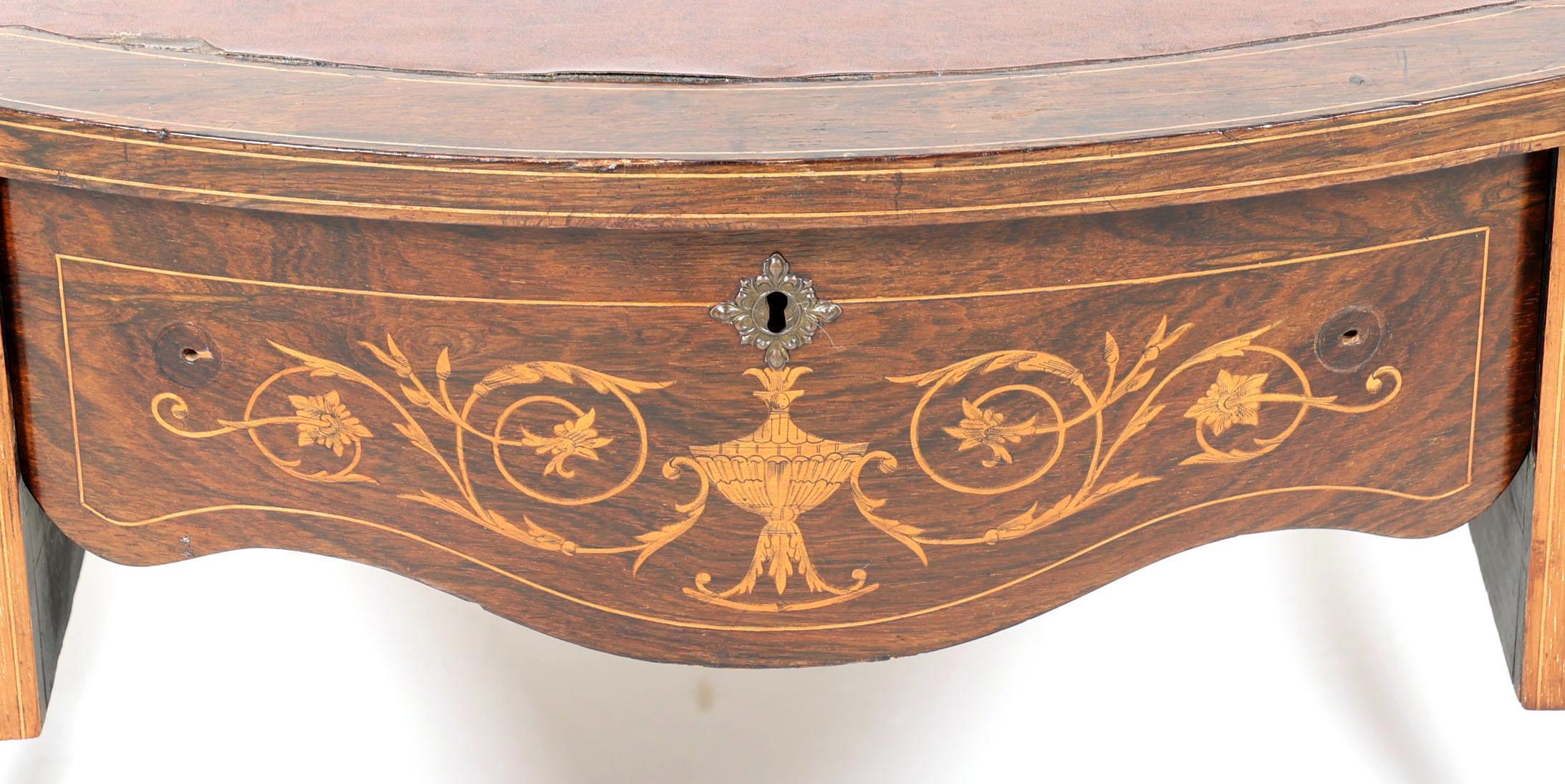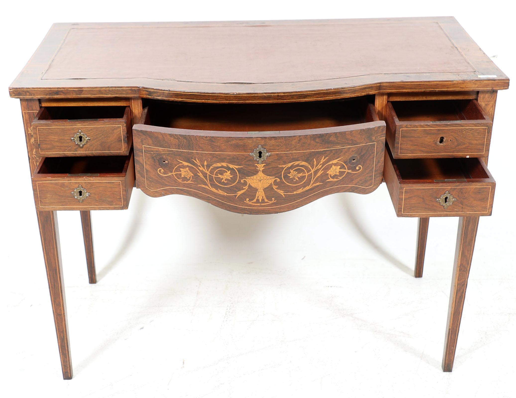 Antieke palissanderhouten schrijftafel met inlegwerk en lederen blad, h.68 x b.91 x d.50 cm.