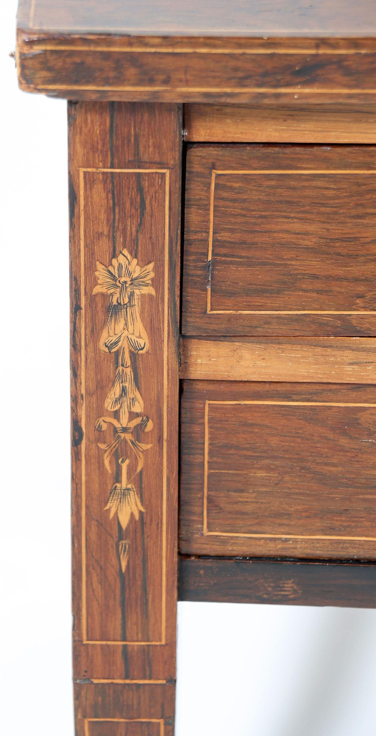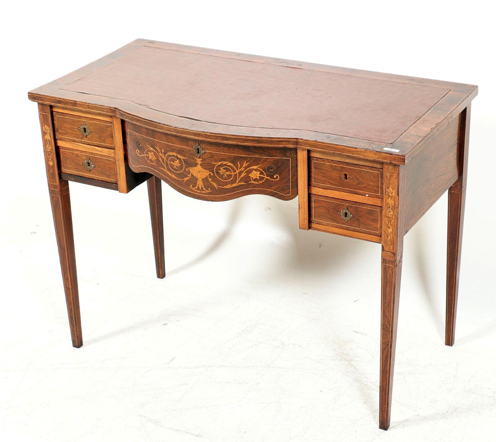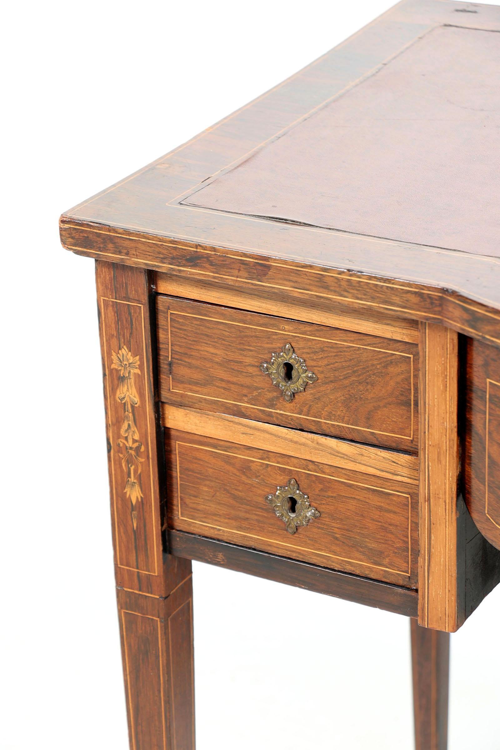 Antieke palissanderhouten schrijftafel met inlegwerk en lederen blad, h.68 x b.91 x d.50 cm.