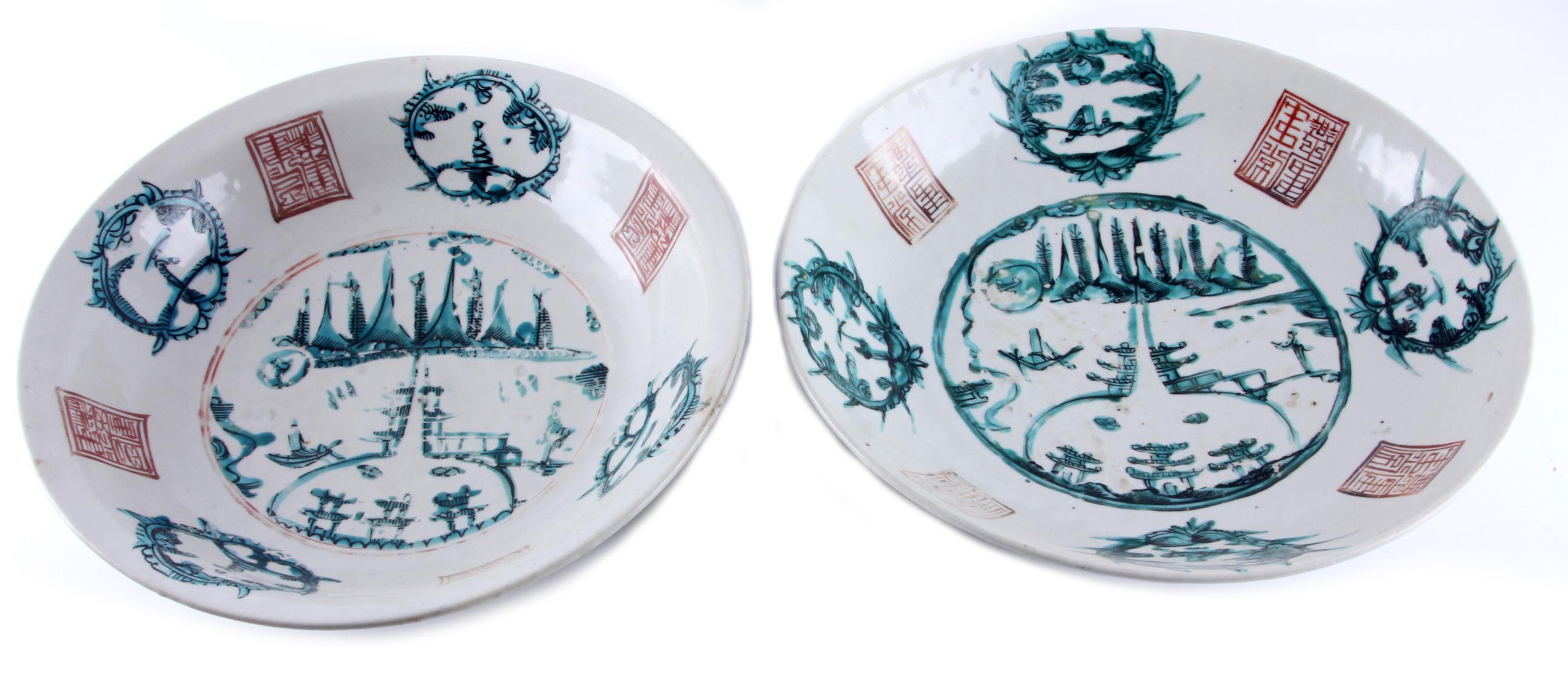 Twee antieke Chinees porseleinen Swatow schotels met Arabisch decor, Ming Dynastie (1368-1644), d.38 cm.