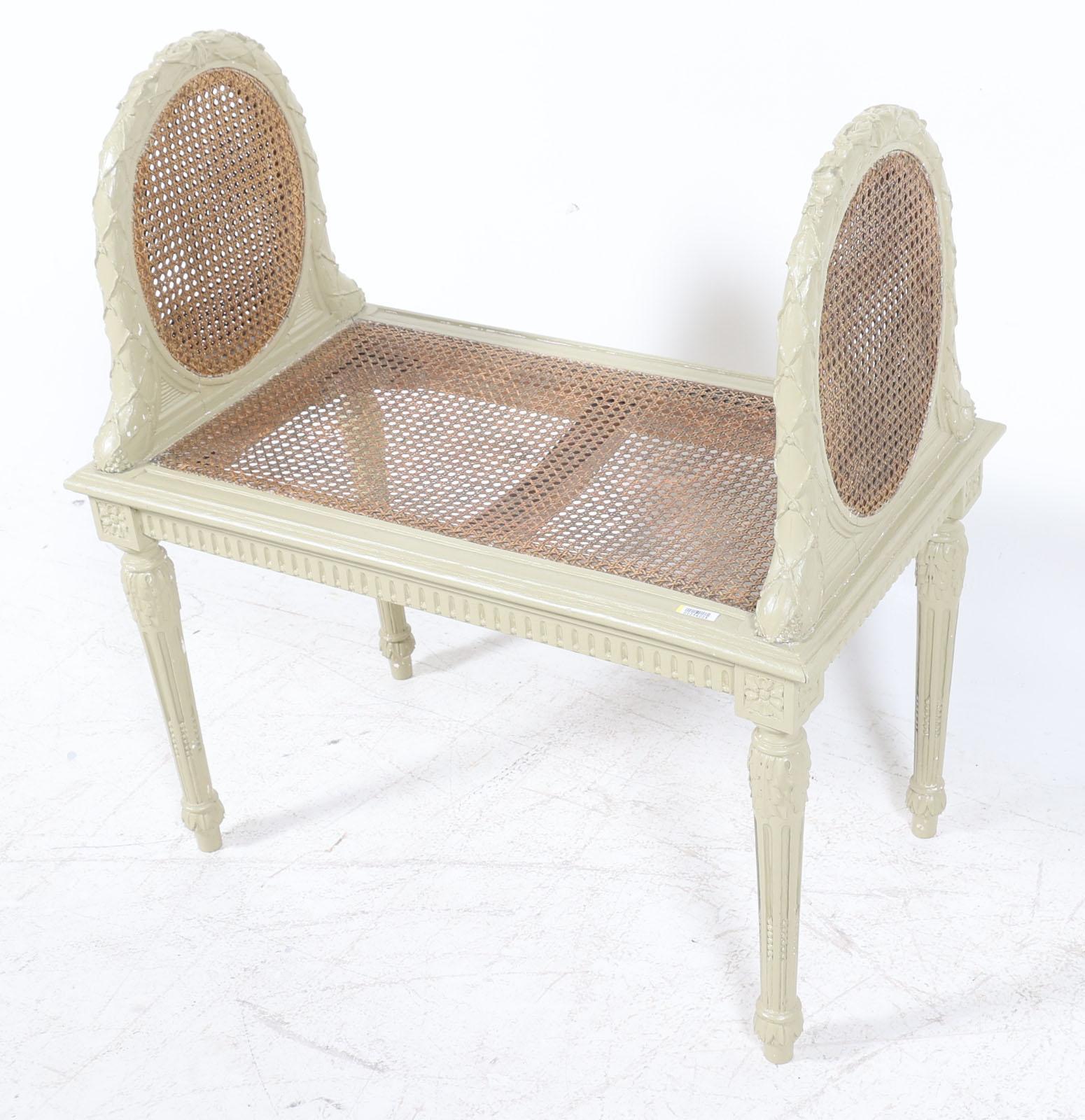 Oud groen gelakt bedbankje met webbing zitting, Louis Seize stijl