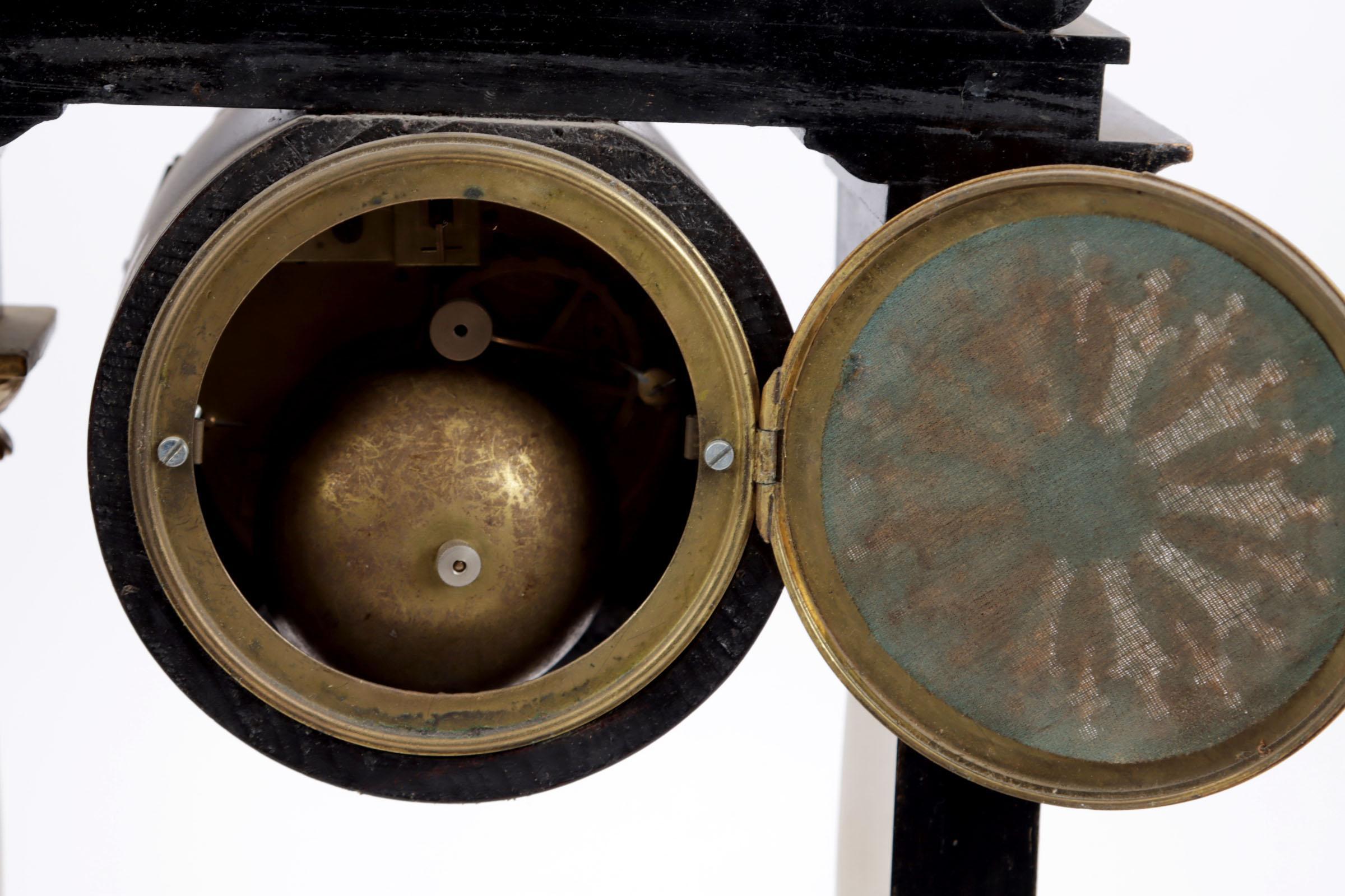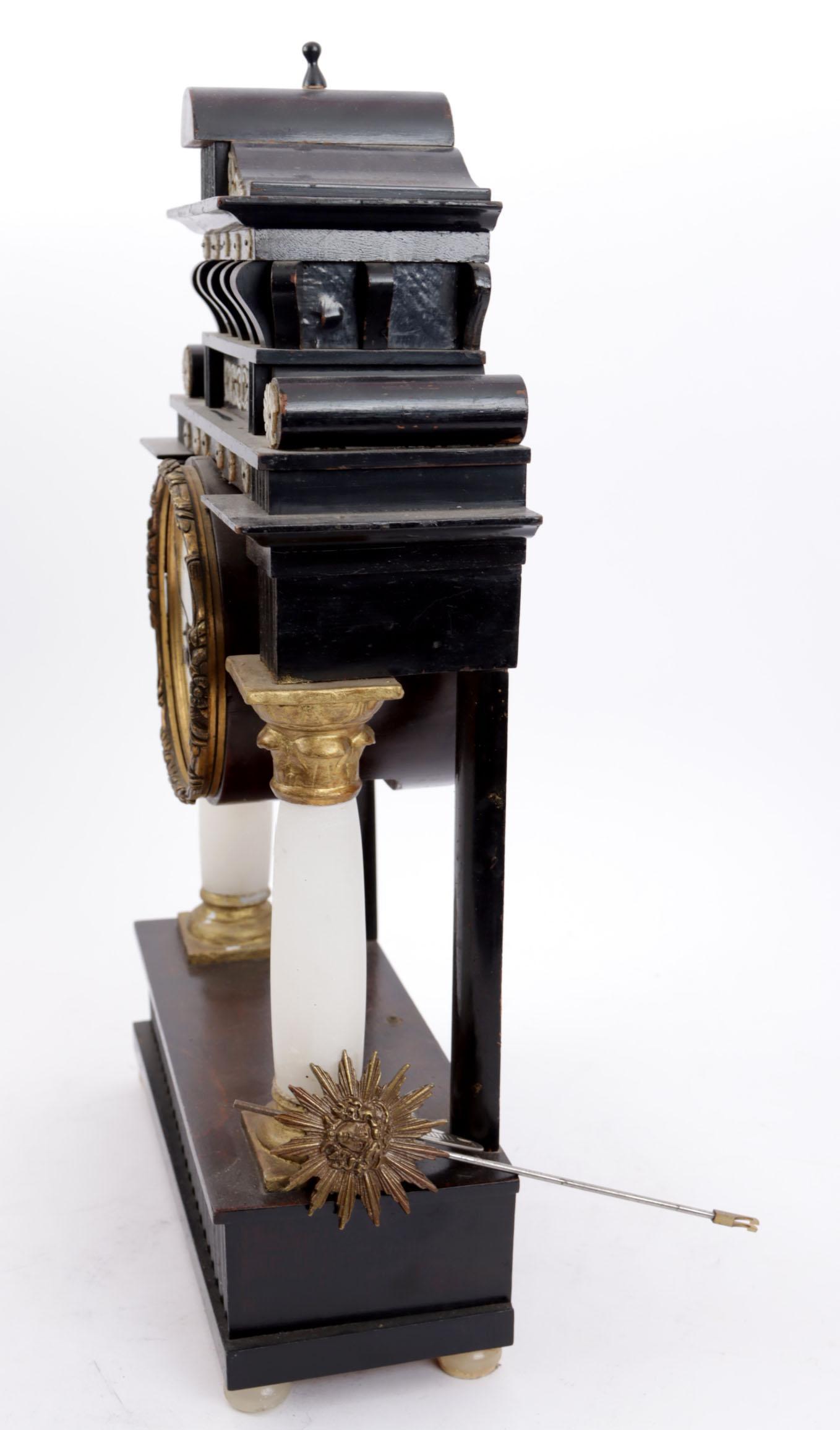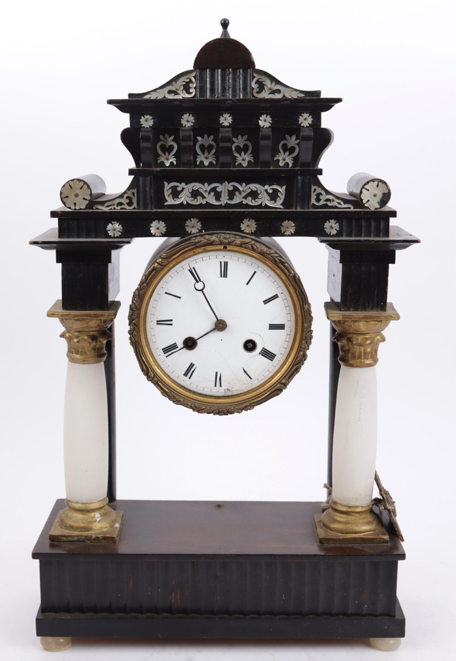 Houten kolompendule met decoraties van parelmoer en albasten zuilen, h.47 cm.