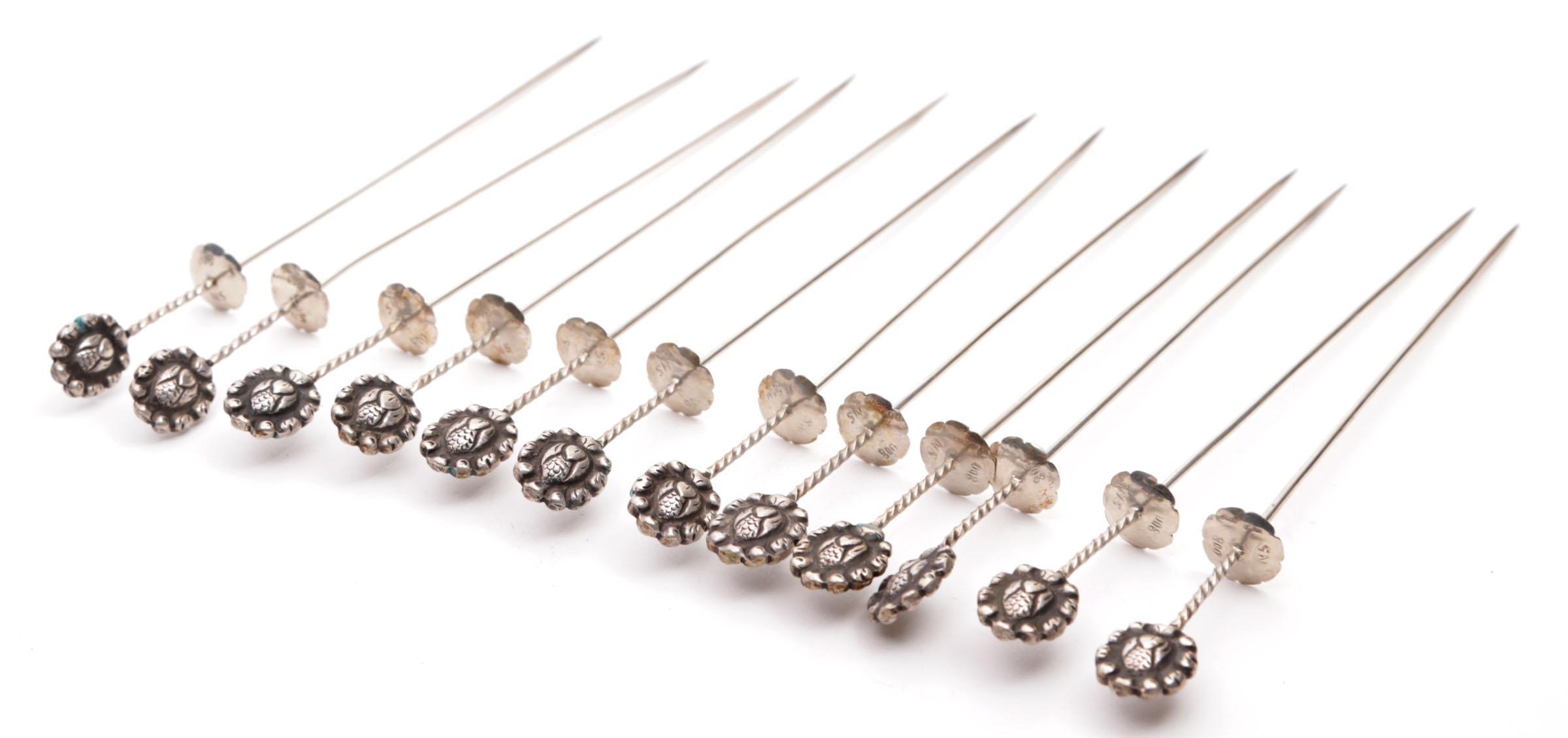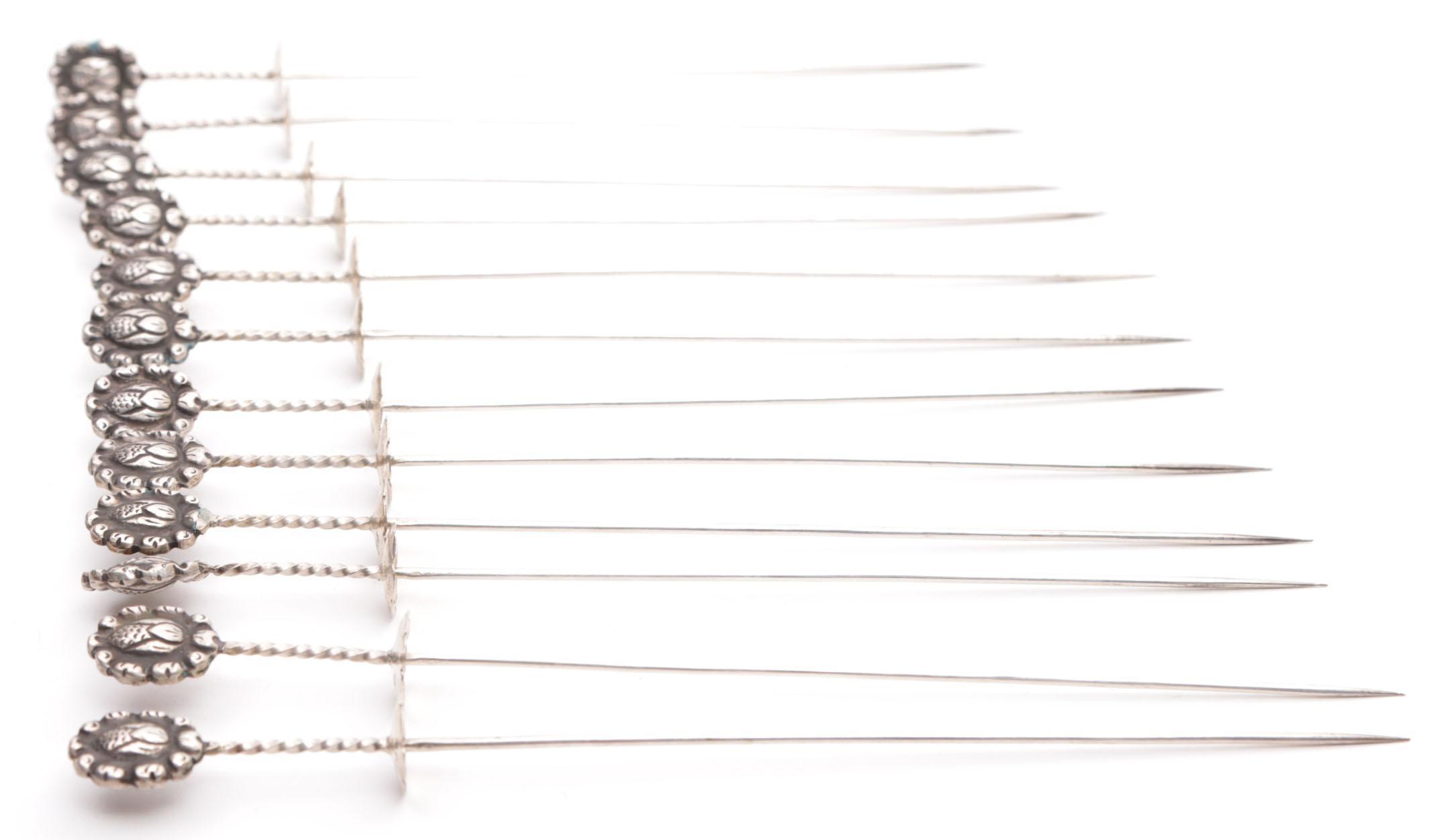 Set van twaalf 3e gehalte Djokja zilveren prikkers, totaalgewicht 92 gram