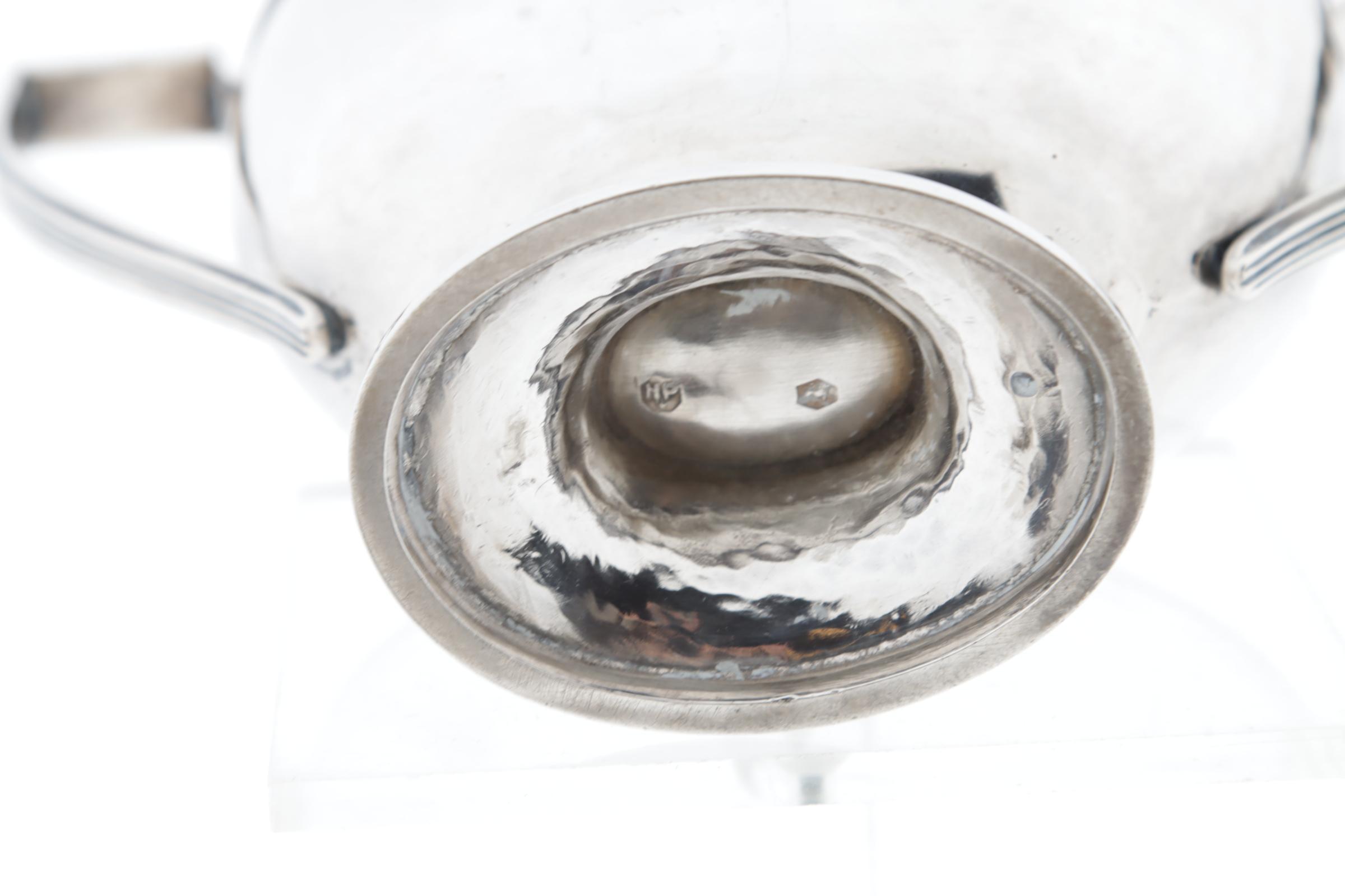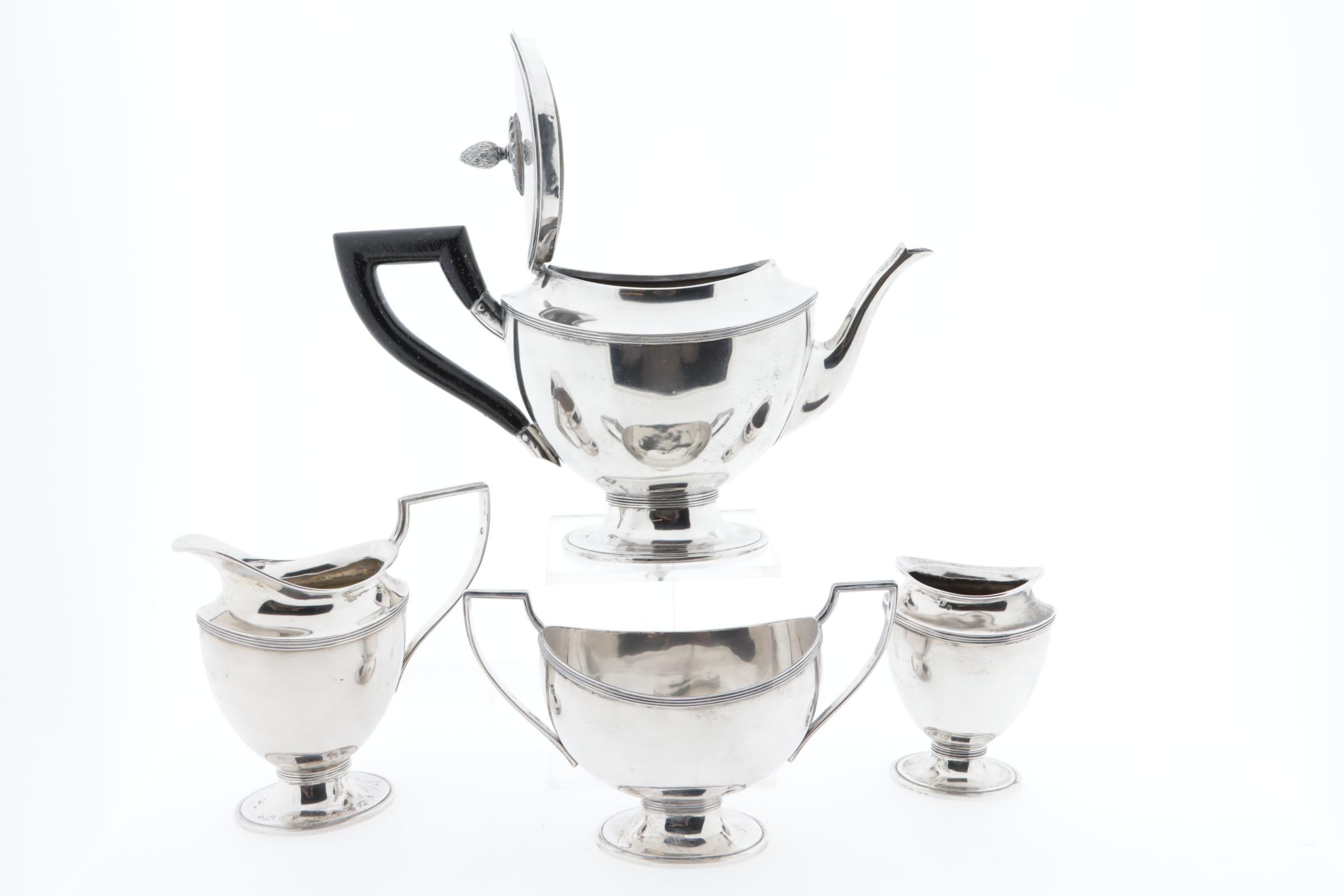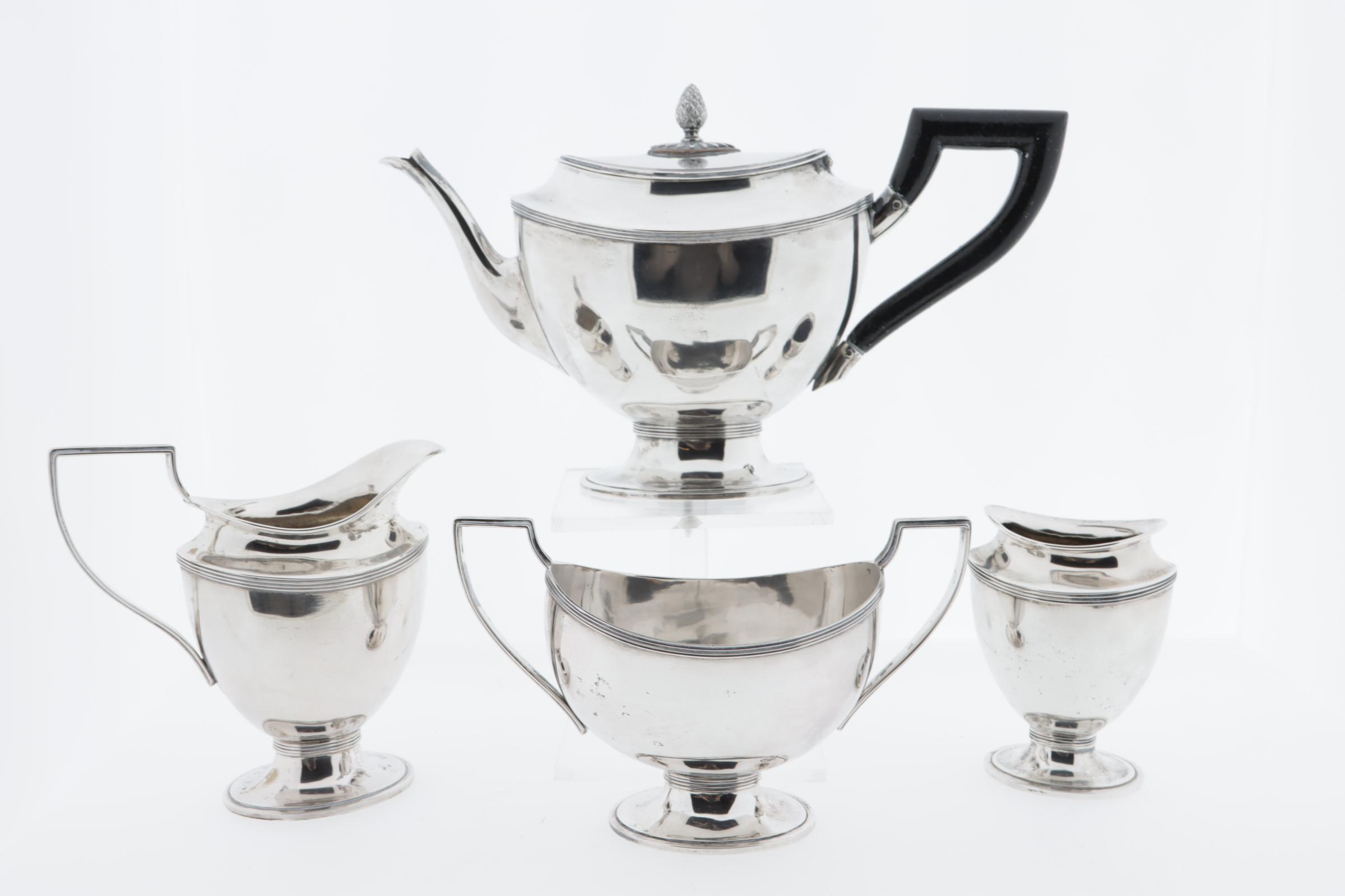 2e Gehalte zilveren 4-delig theeservies bestaand uit theepot, melkpot, suikerpot en lepelvaas, jaarletter V=1930, kantoorstempel Den Haag,