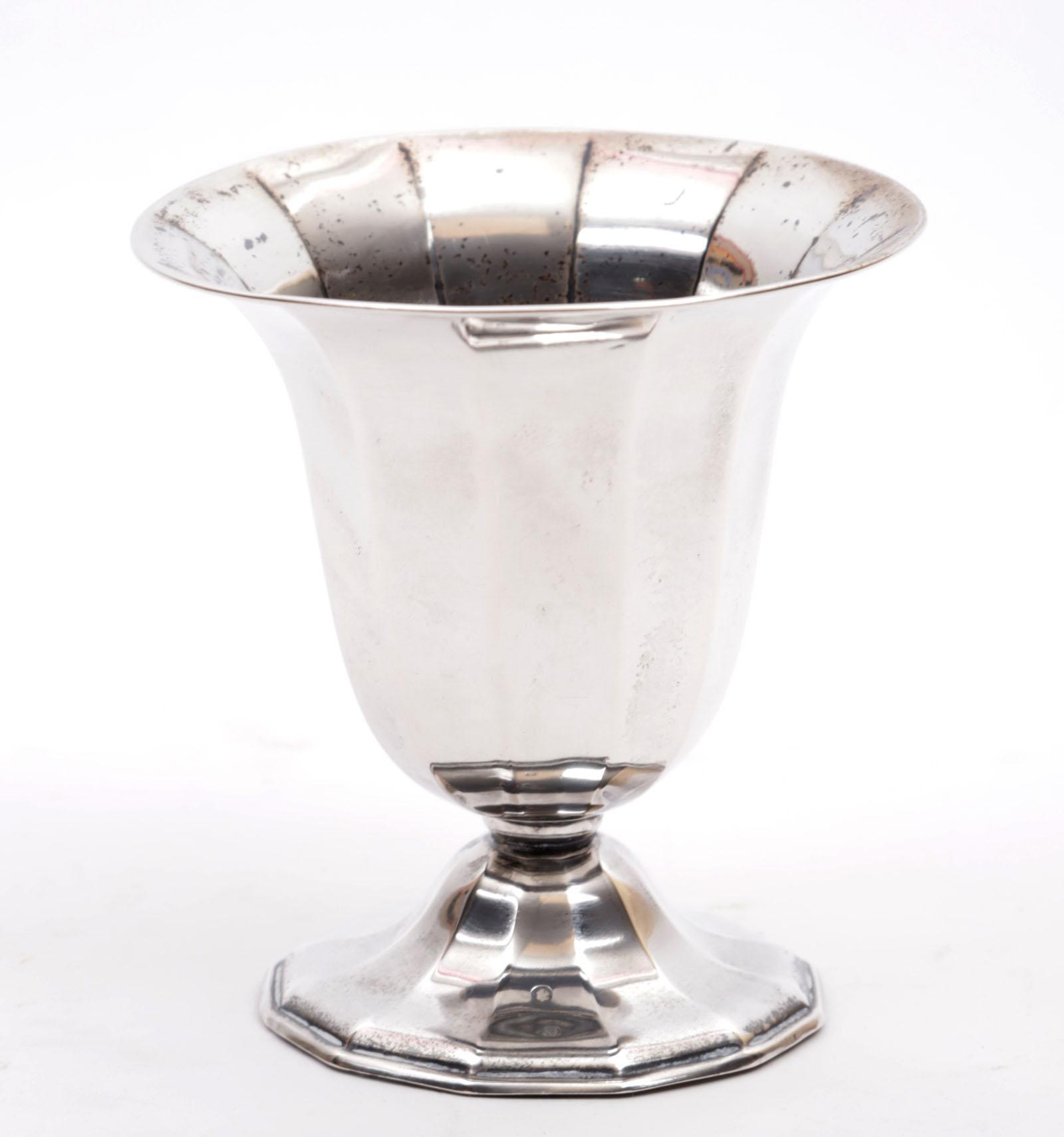 2e Gehalte zilveren veelkantig bloemenvaasje (rooster ontbreekt), Zilverfabriek Voorschoten, 1925, h.12 cm., zilvergewicht 176 gram