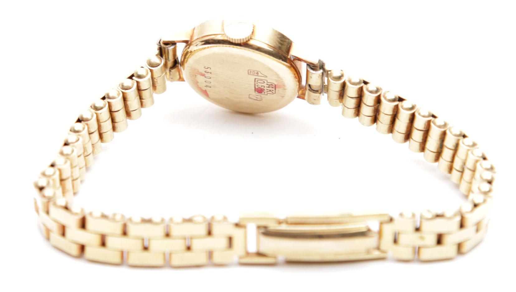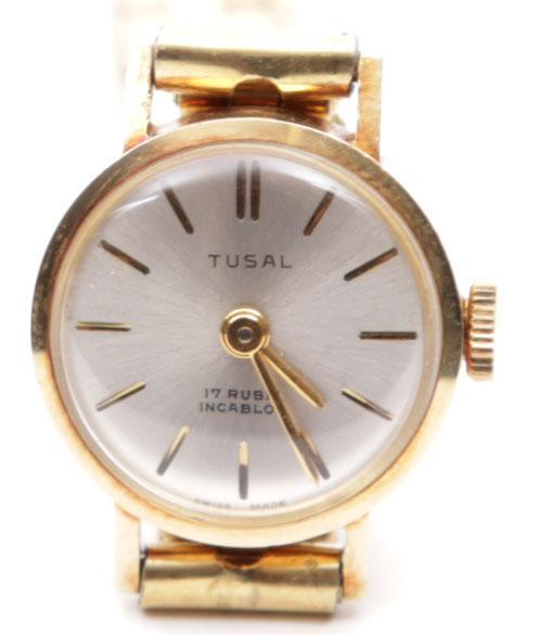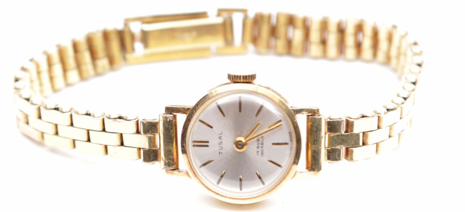 Vintage Tusal damespolshorloge, met 14 kt kast en doublé band.