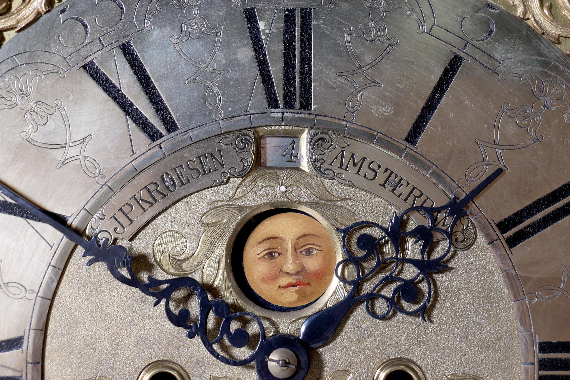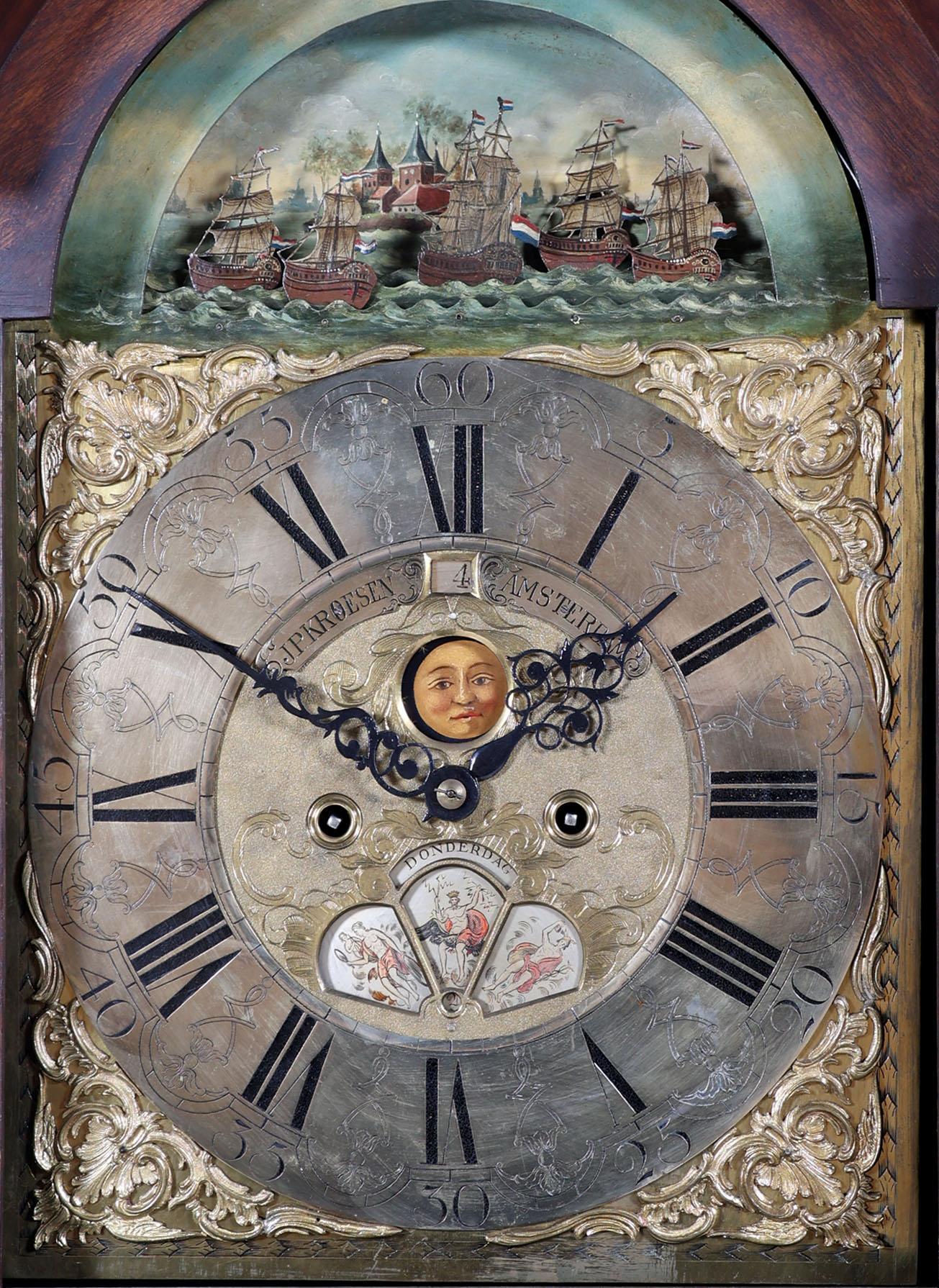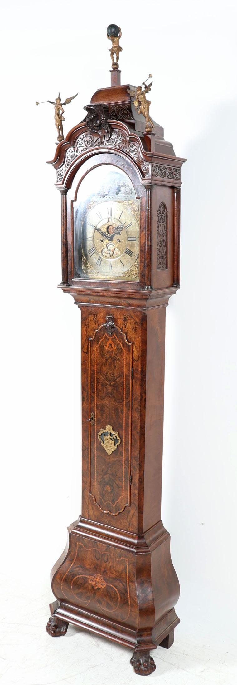 J.P. Kroesen, Amsterdams staand horloge in wortelnotenhouten kast met inlegwerk en rustend op klauwpoten, met scheepjesmechaniek, dag/datum aanduiding en maanstand, 18e eeuw,