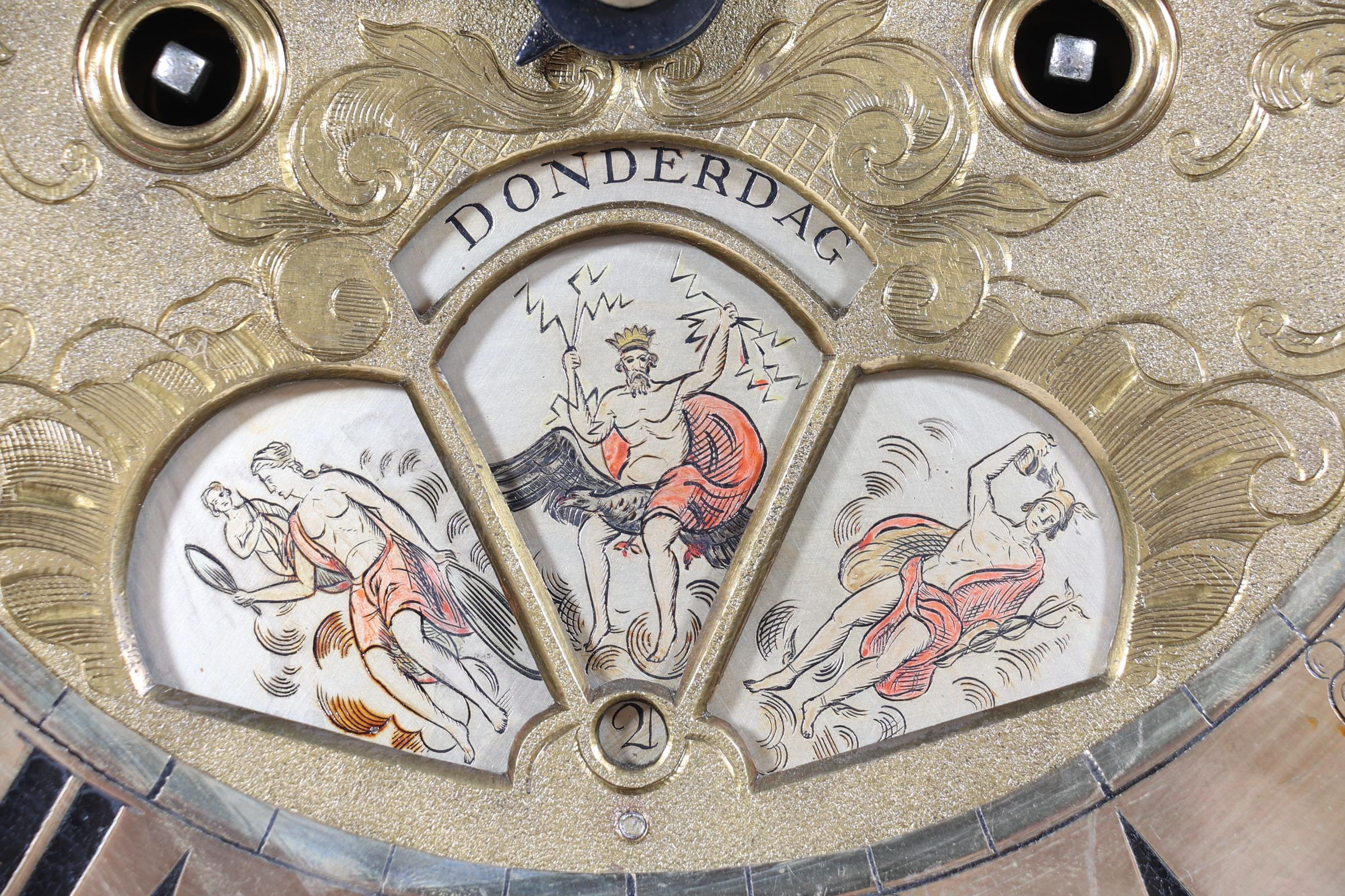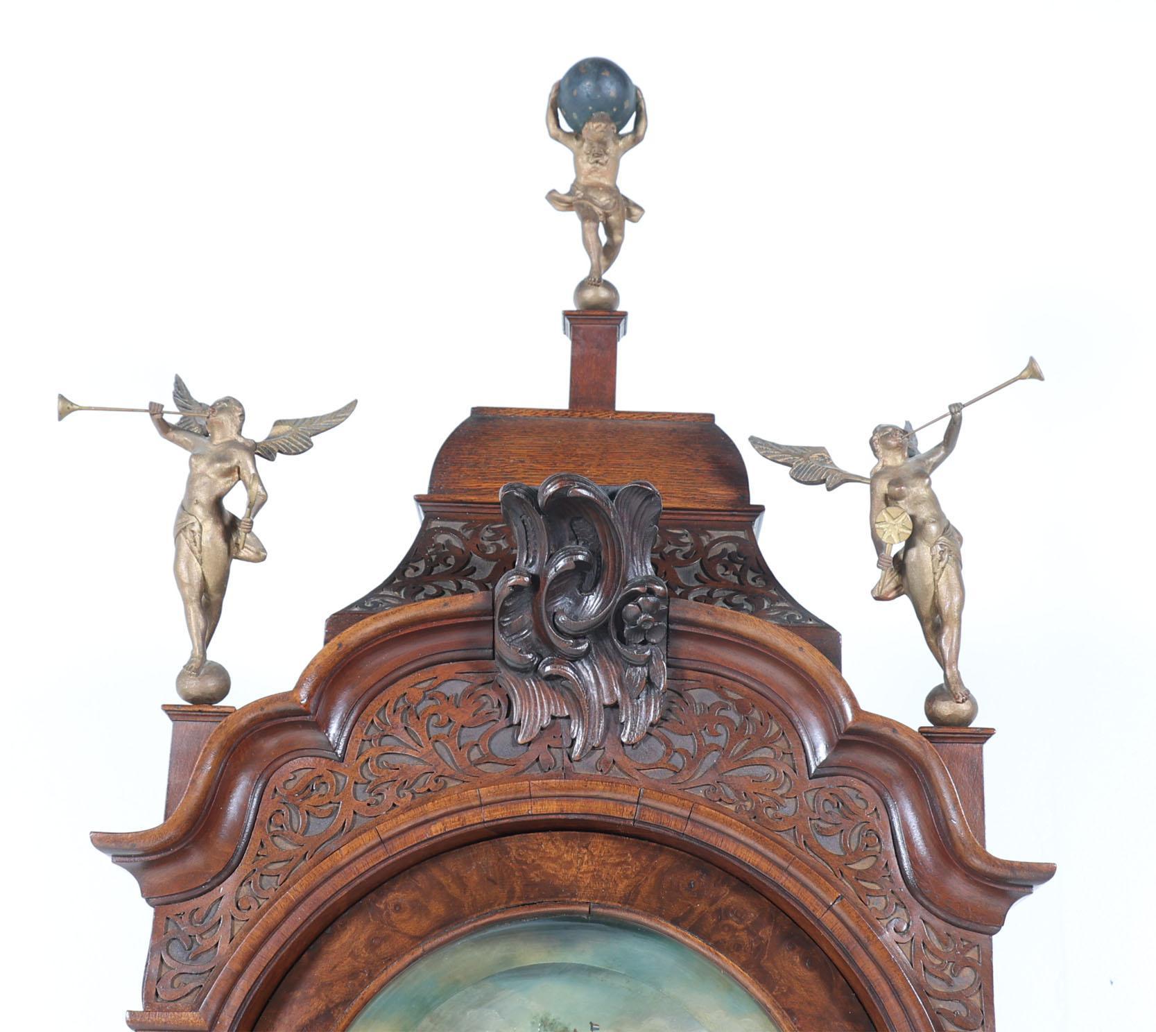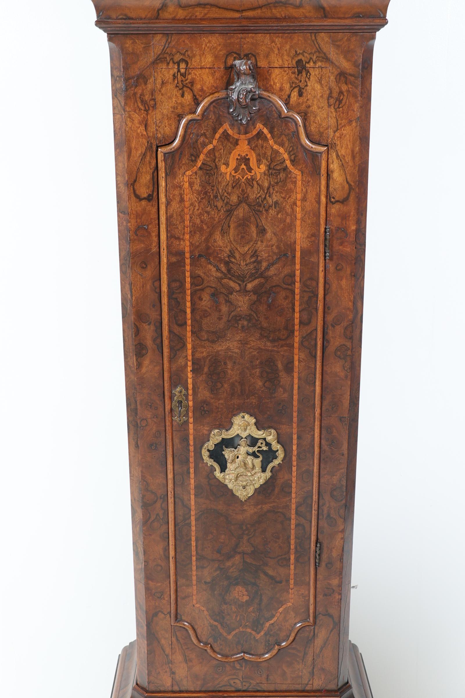 J.P. Kroesen, Amsterdams staand horloge in wortelnotenhouten kast met inlegwerk en rustend op klauwpoten, met scheepjesmechaniek, dag/datum aanduiding en maanstand, 18e eeuw,
