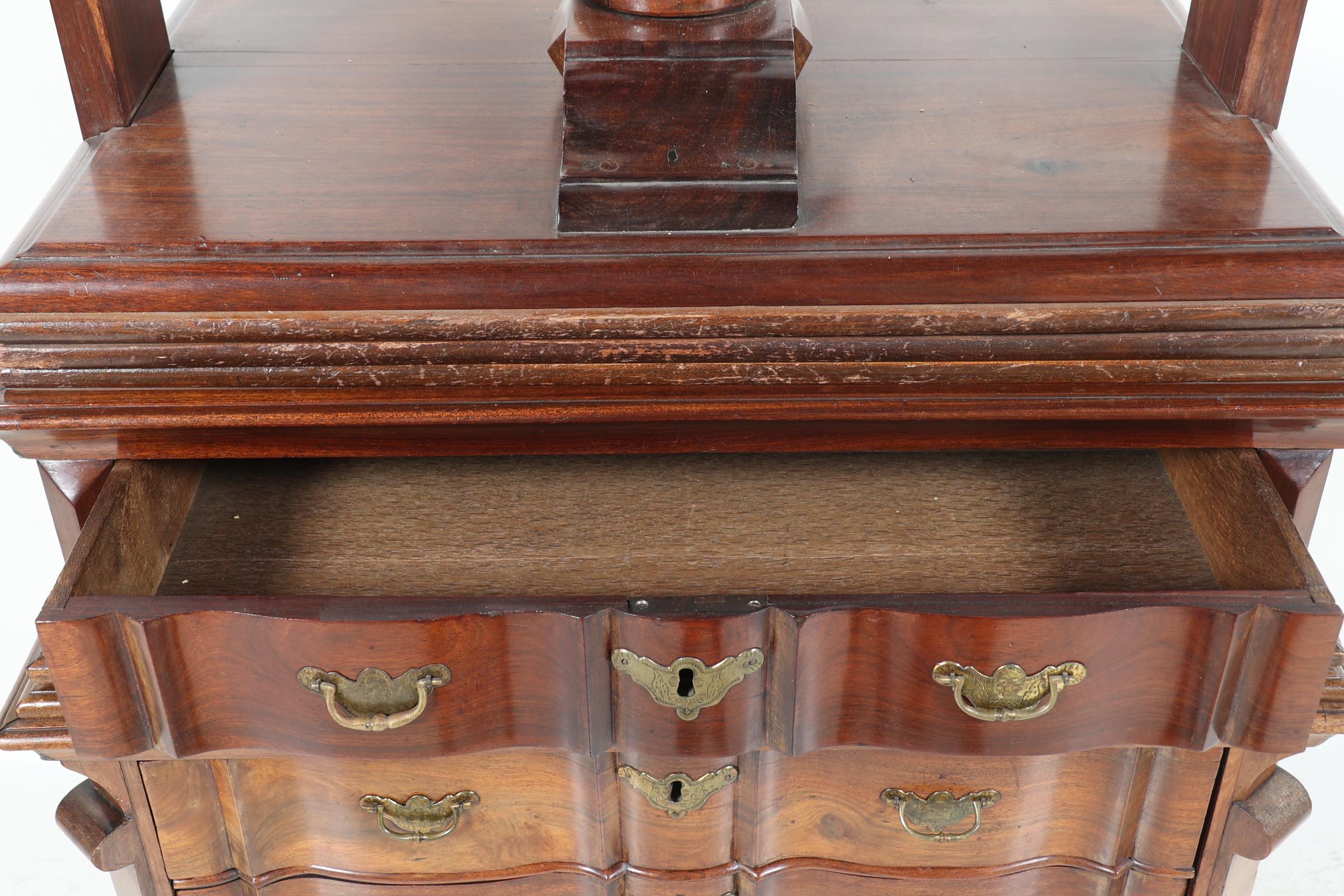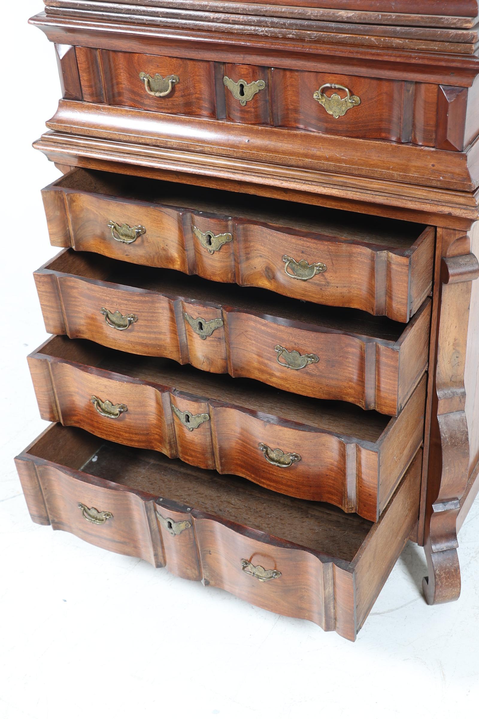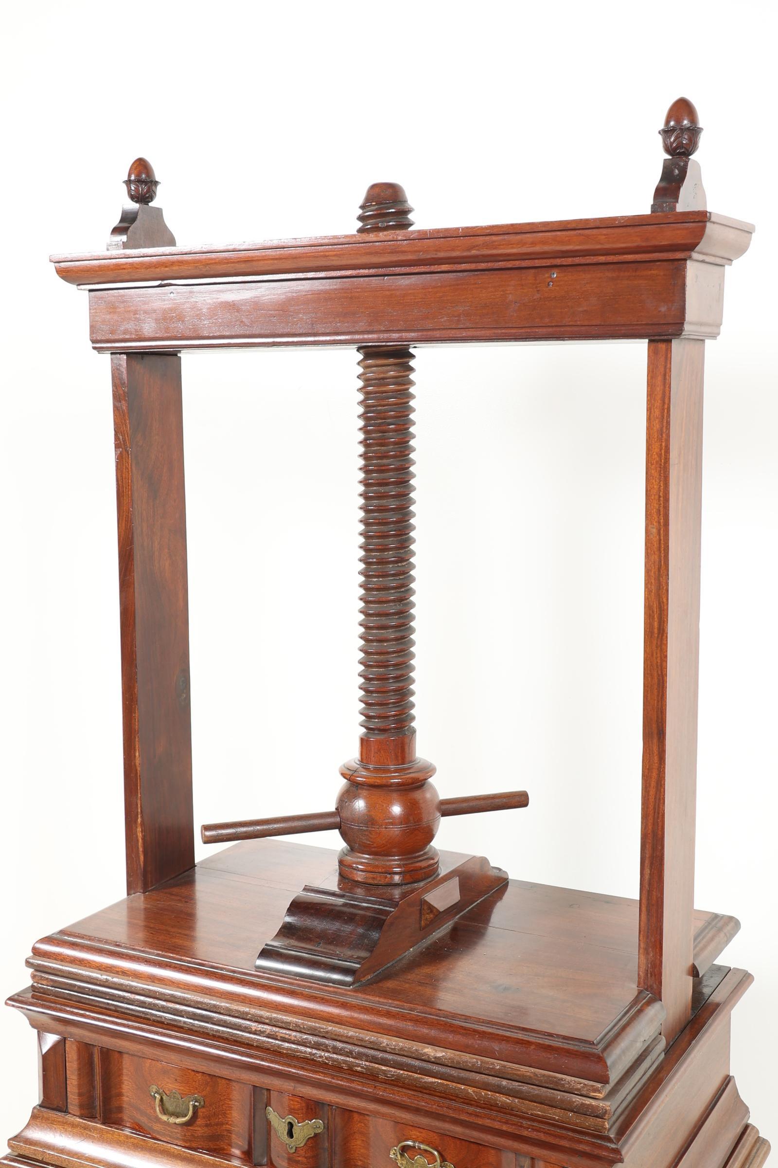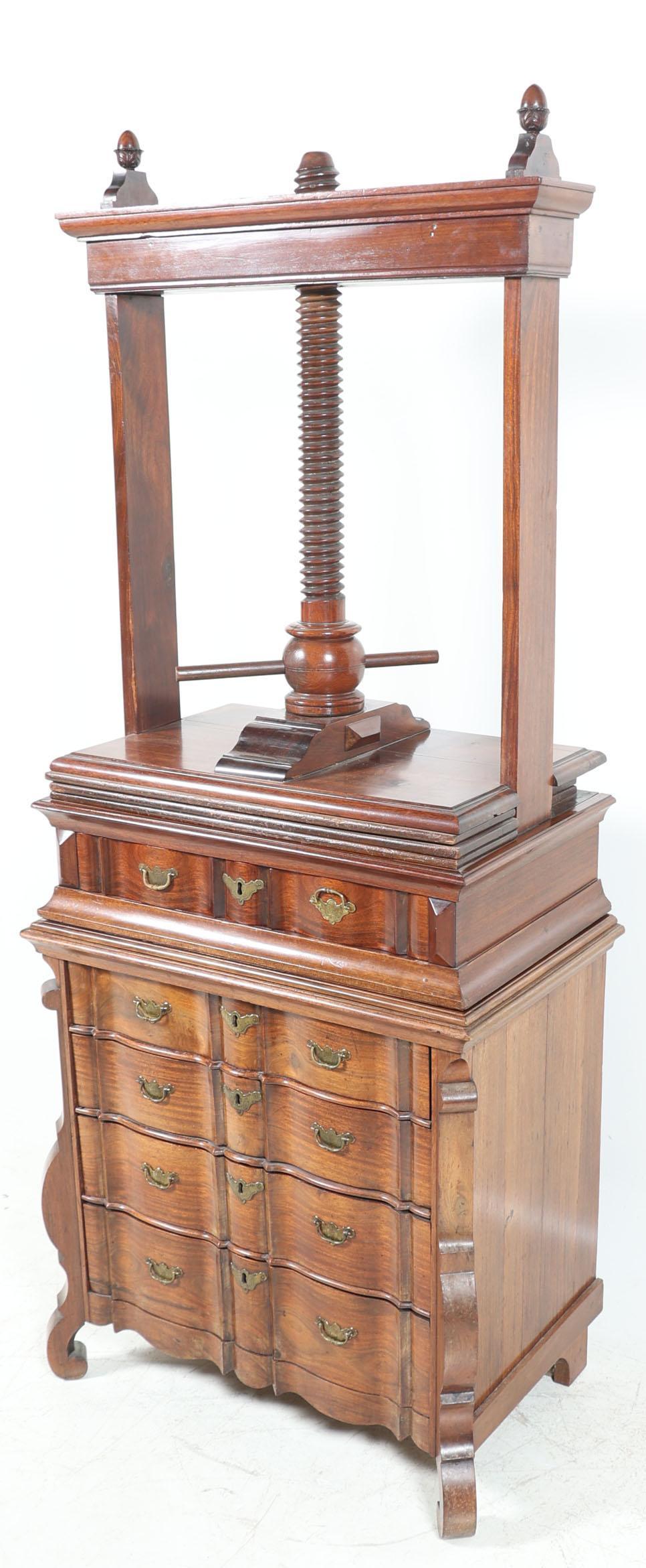 Antieke mahoniehouten linnenpers, ook te gebruiken als commode als het bovendeel verwijderd is, h.199 of h.81 x b.85 x d.52 cm.