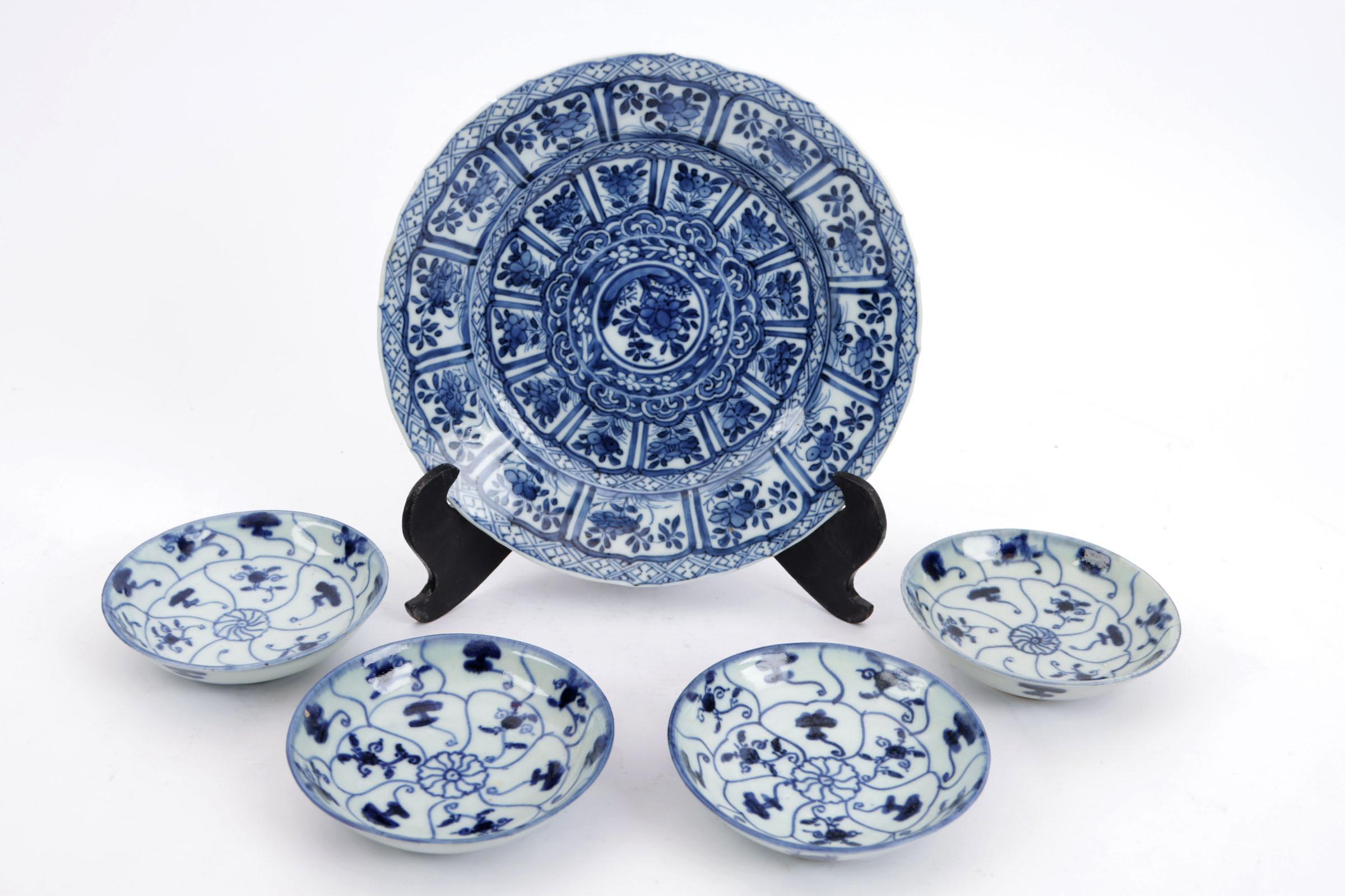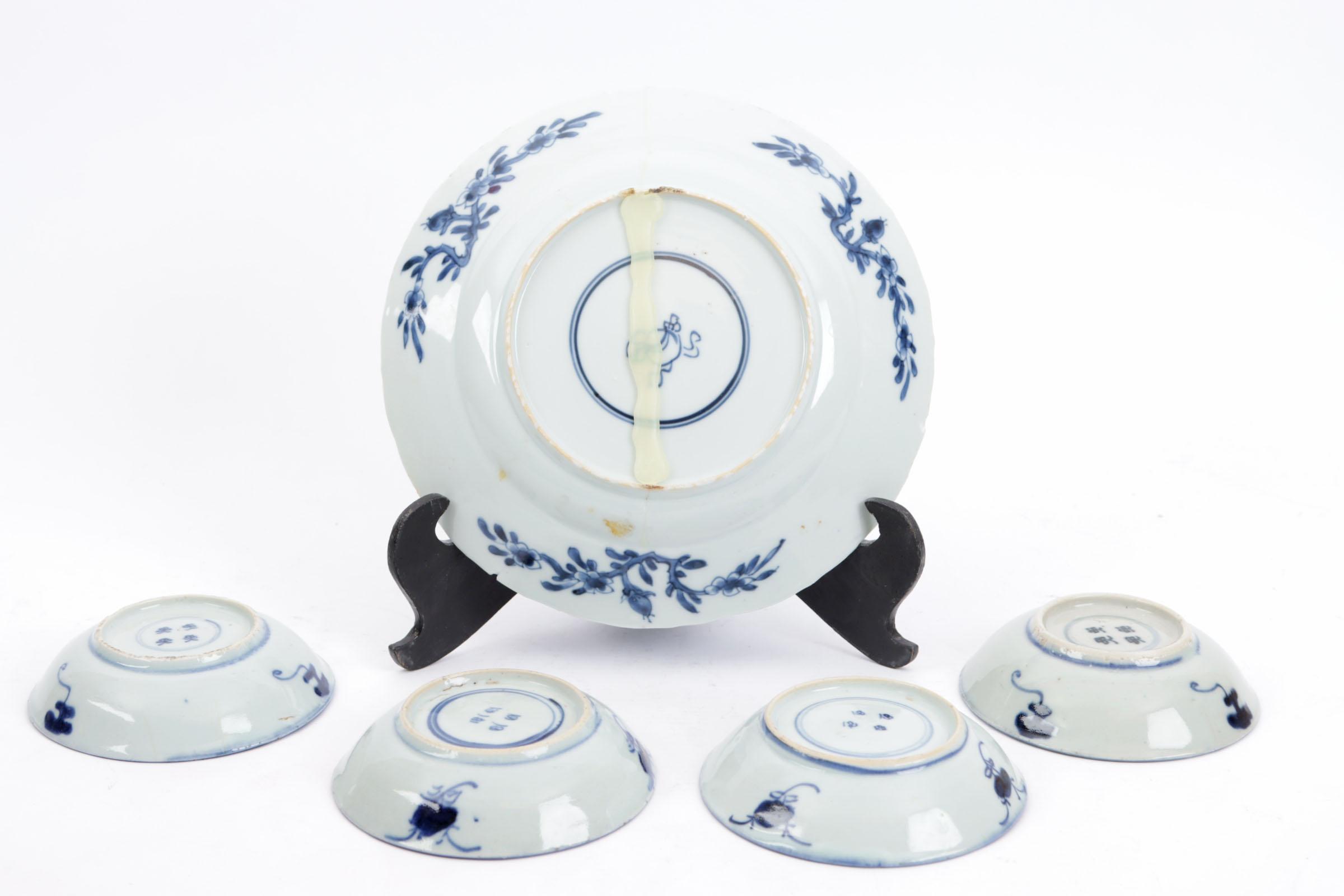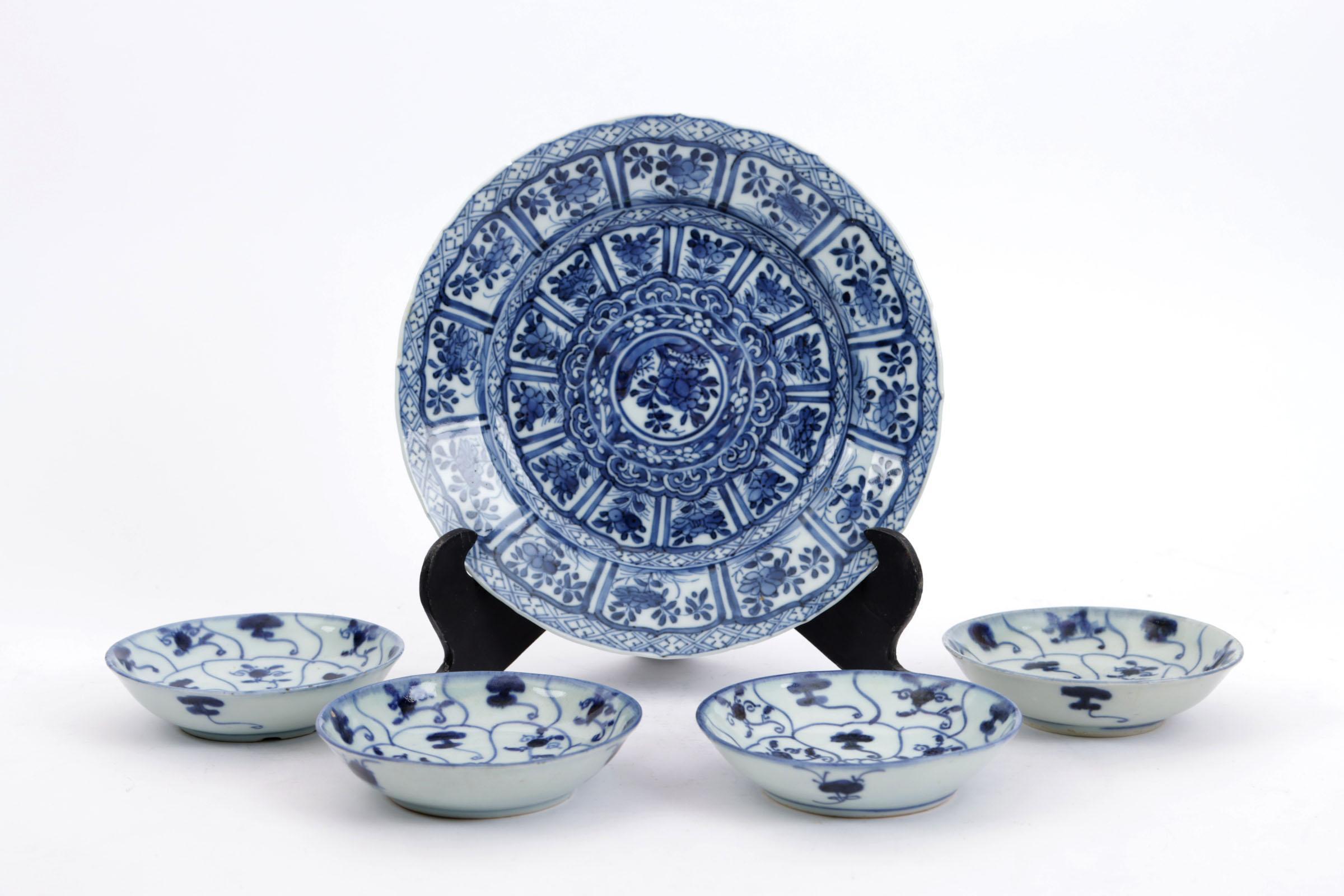 Koop van 4 blauw/wit Chinees porseleinen schoteltjes en een defect bord