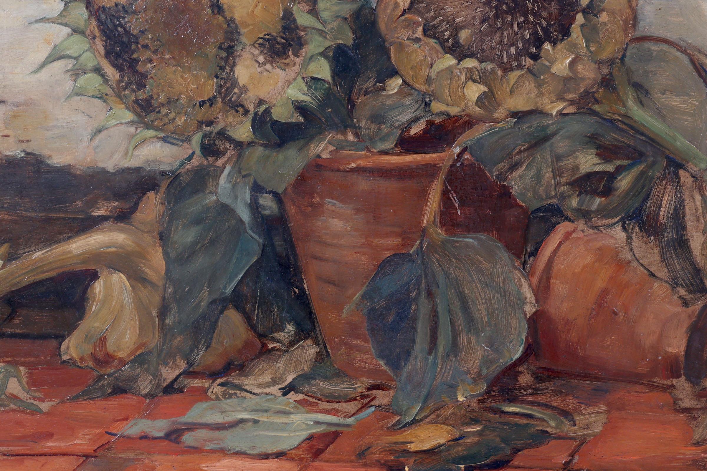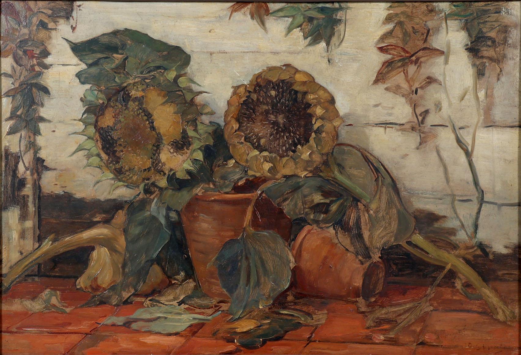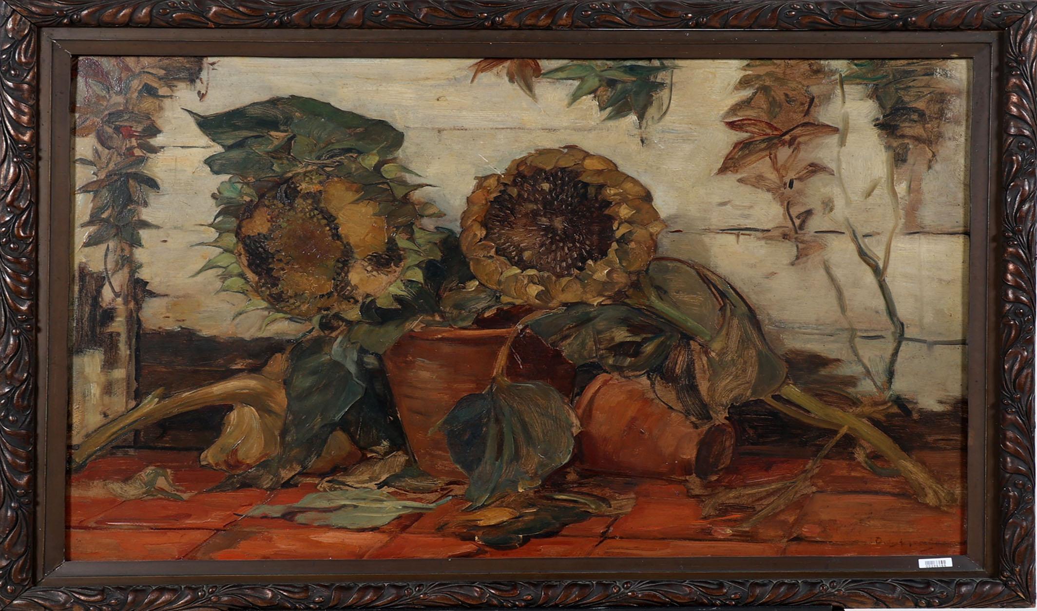 Onb.meester, Stilleven met zonnebloemen, olieverf op board, 60 x 88 cm.
