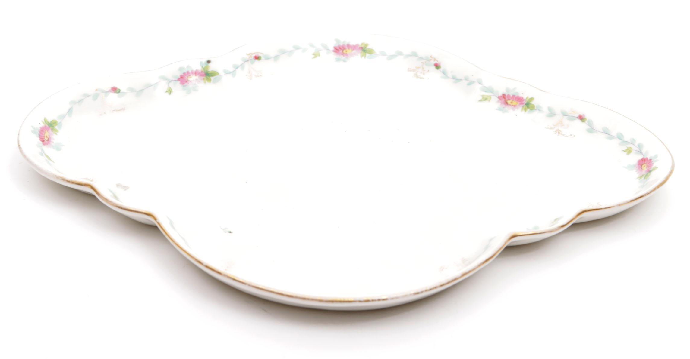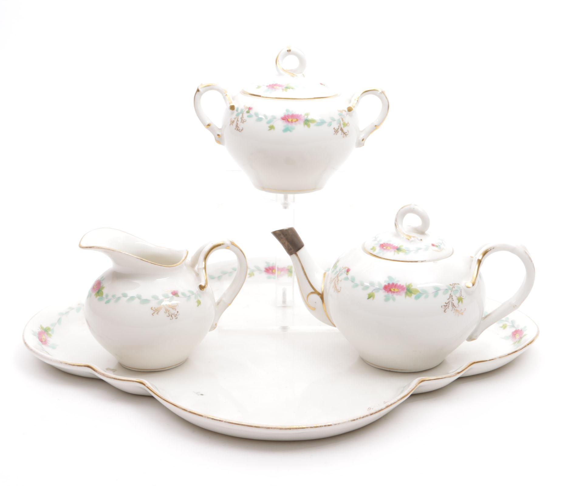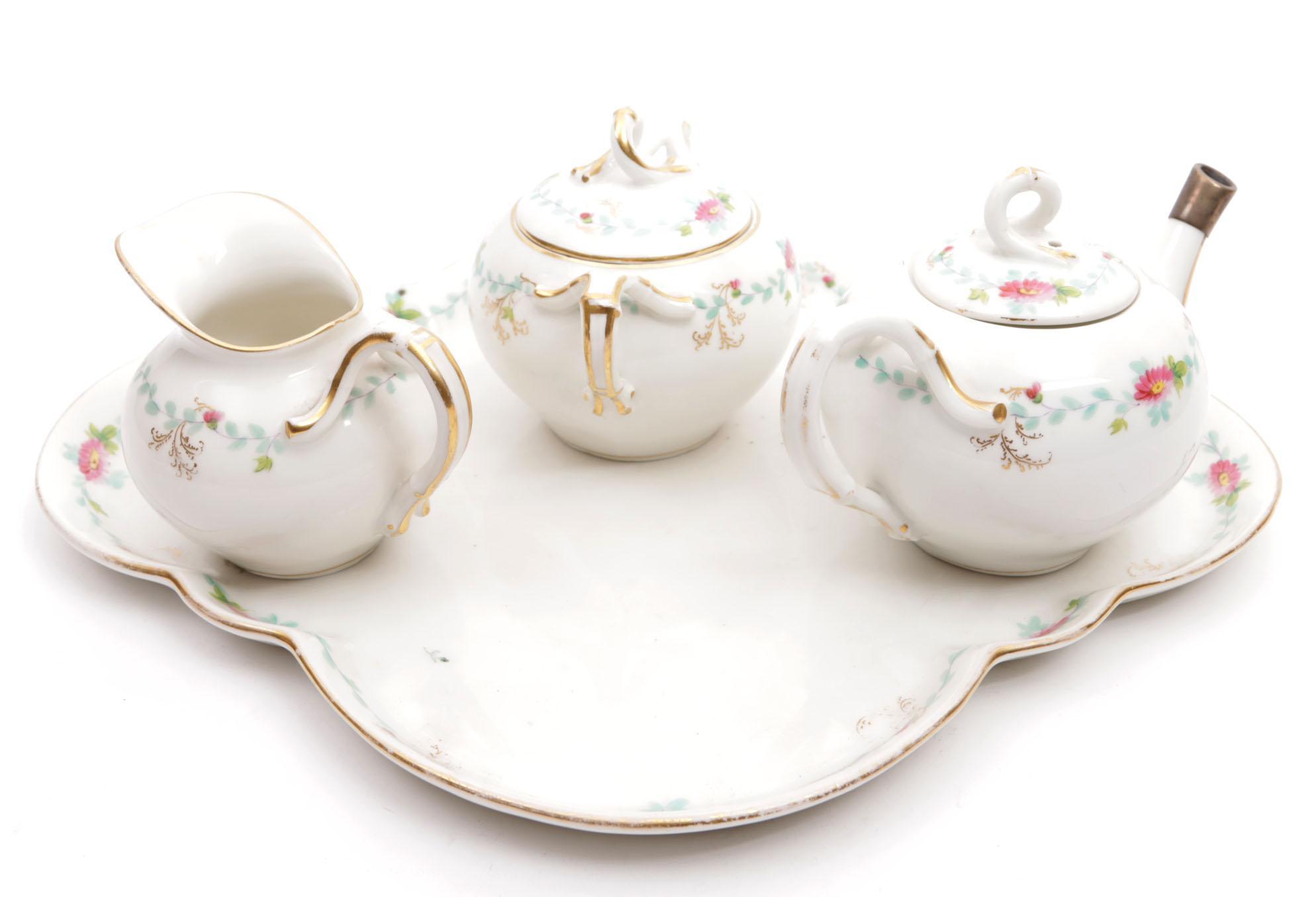 Antieke met bloemen gedecoreerde porseleinen 3-delig theeserviesje op blad