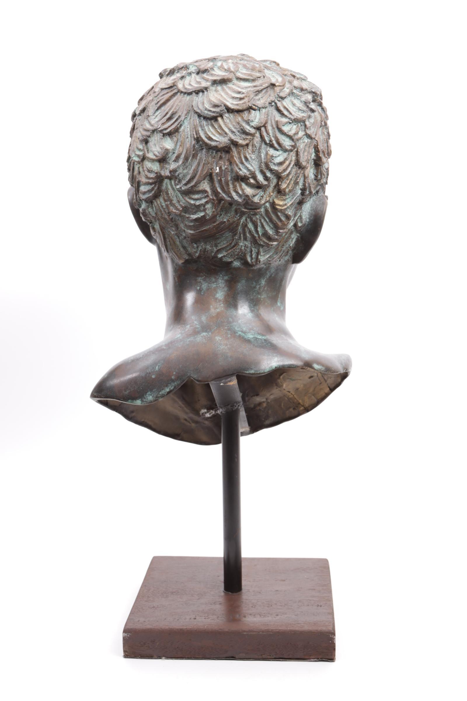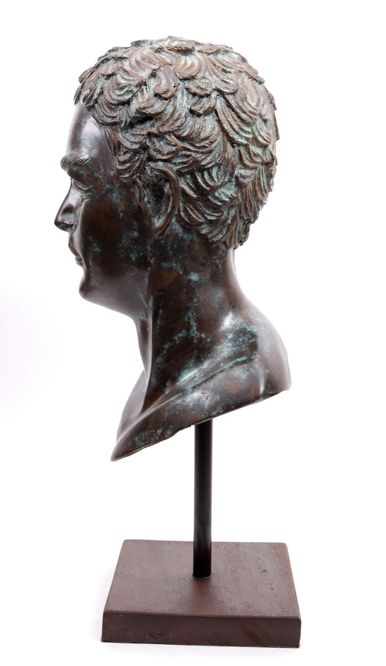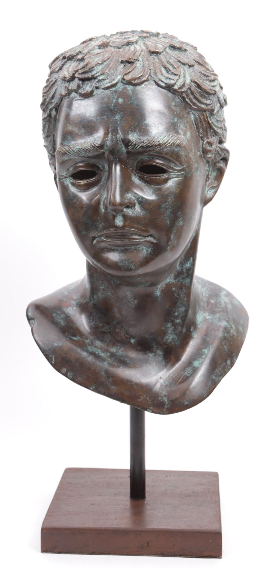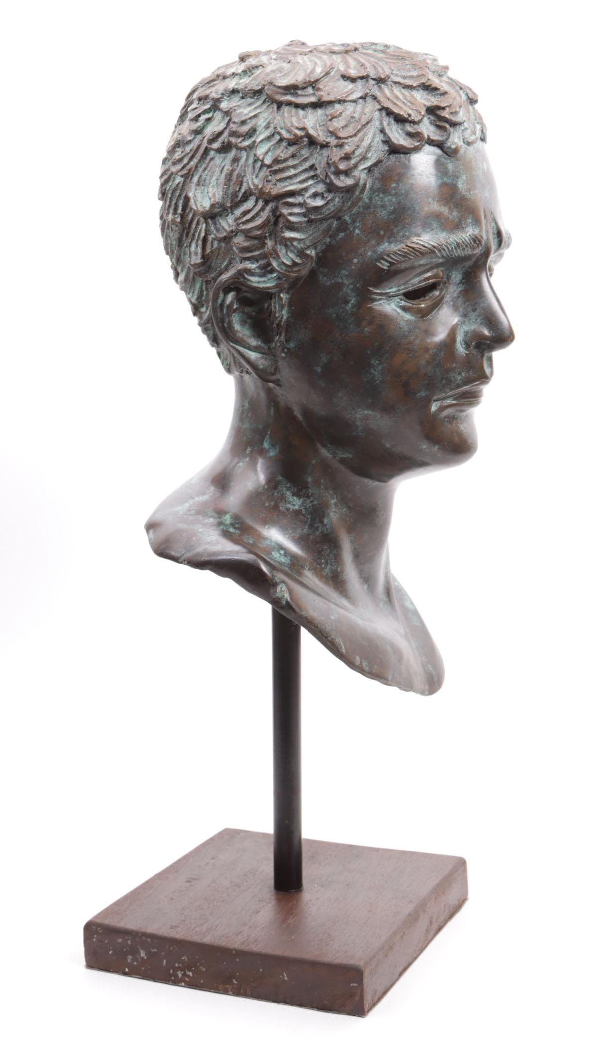 Bronzen buste van een Romein rustend op houten voetstuk, h.58 cm.