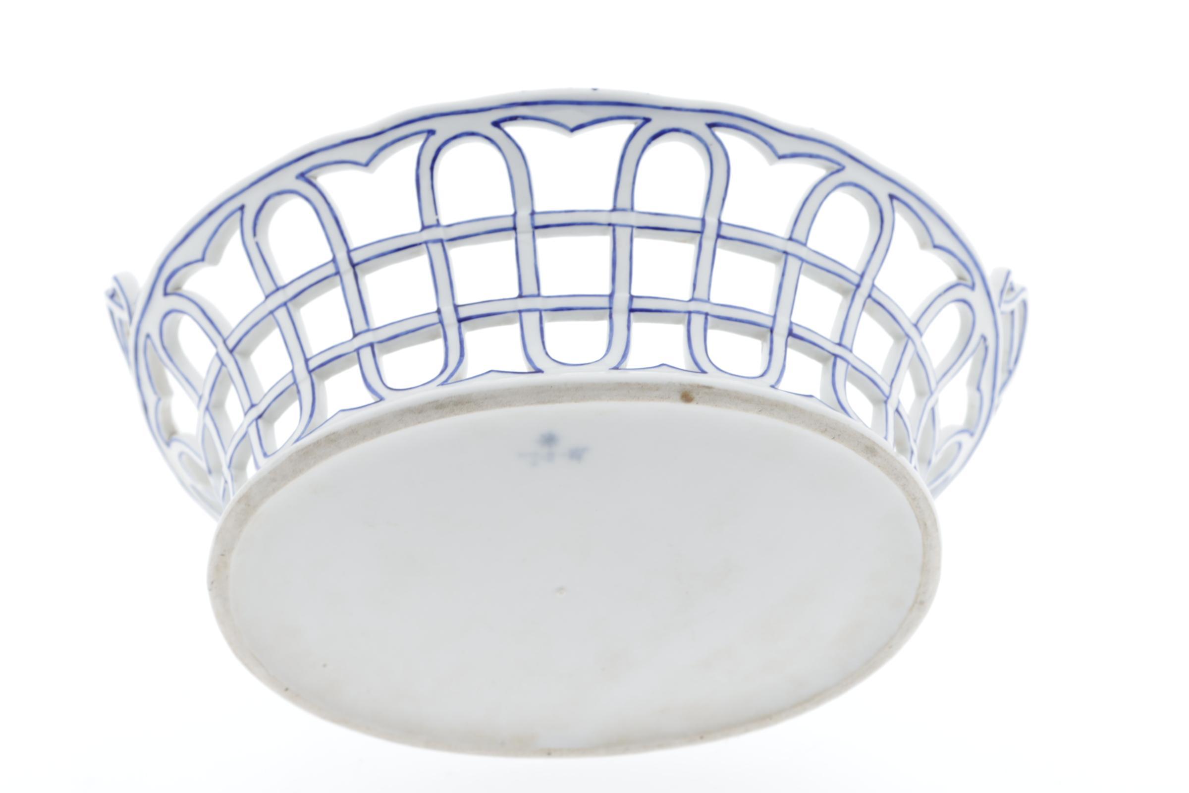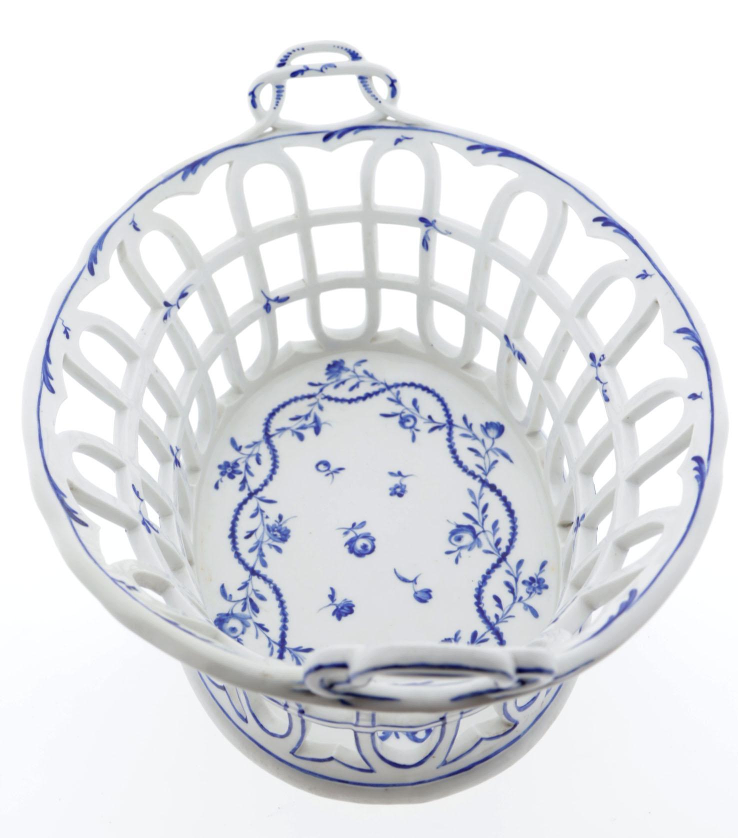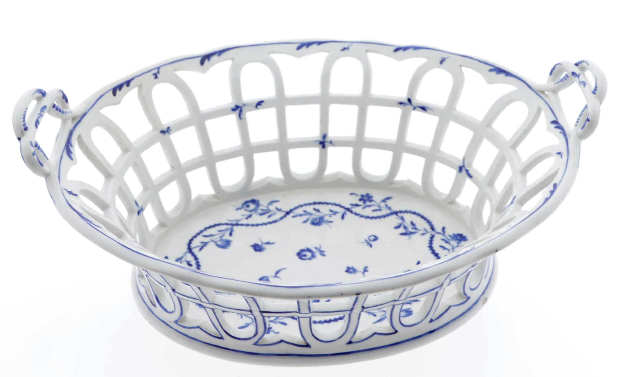Blauw met bloemen en takken gedecoreerde porseleinen ajour mand, Loosdrechts (MOL)porselein