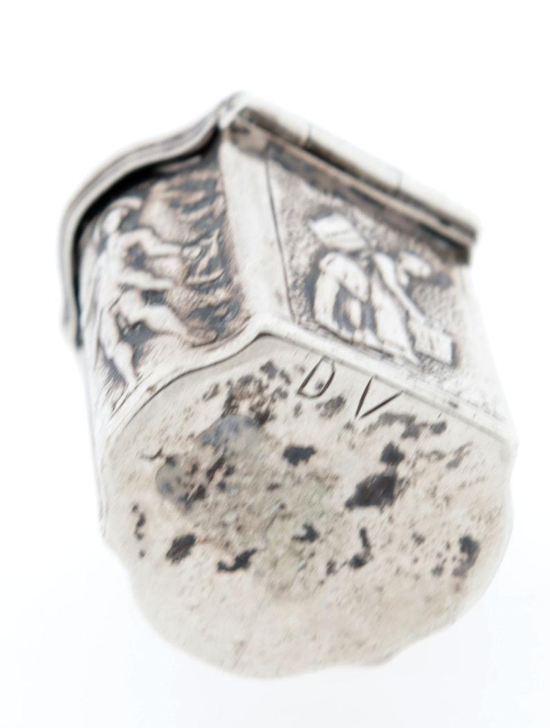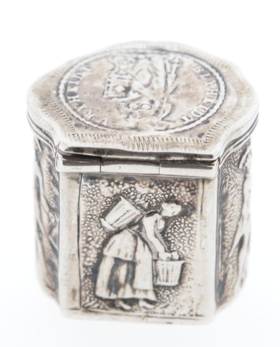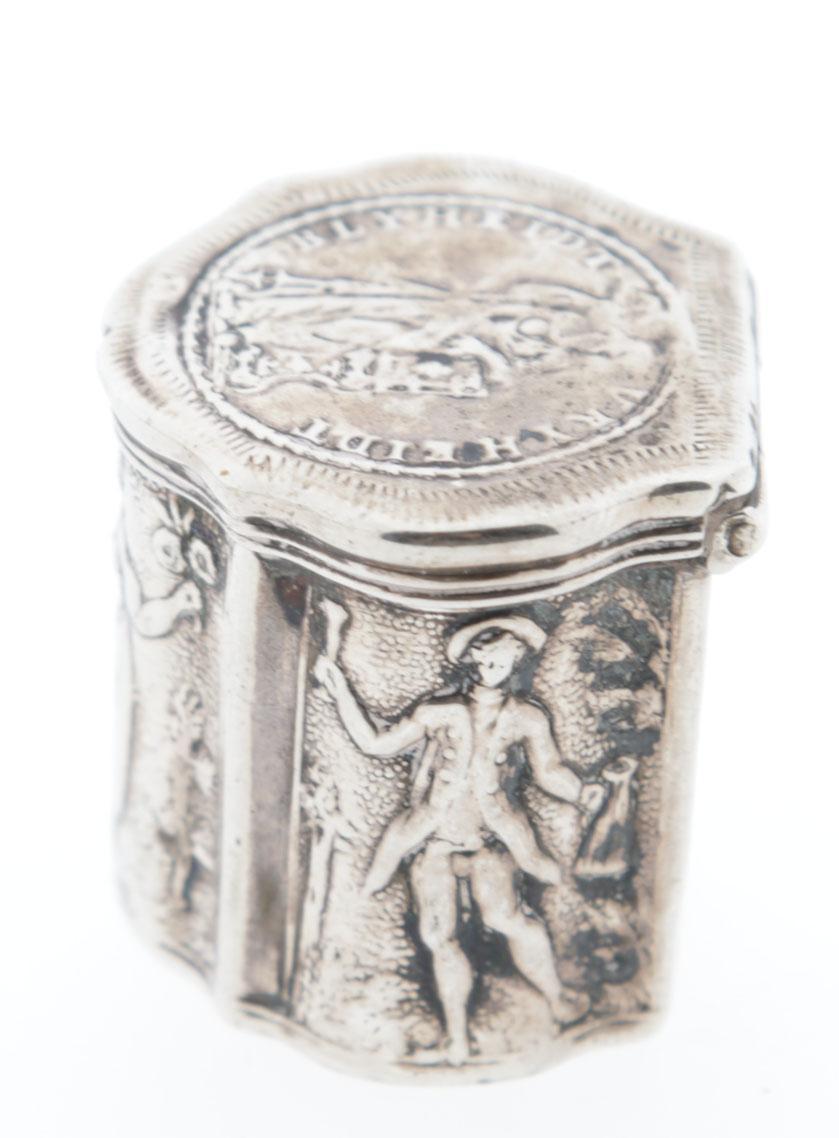 Zilveren lodereindoosje met voorstelling van Hollands Maagd en tekst "Blijheid-vrijheid', Schoonhoven, 1788