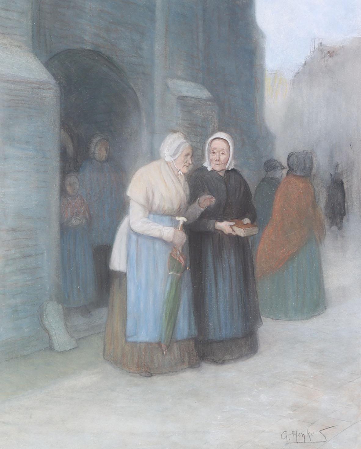 G. Henkes (1844-1927), Zeeuwse dames voor kerk, pasteltekening, 49 x 60 cm.