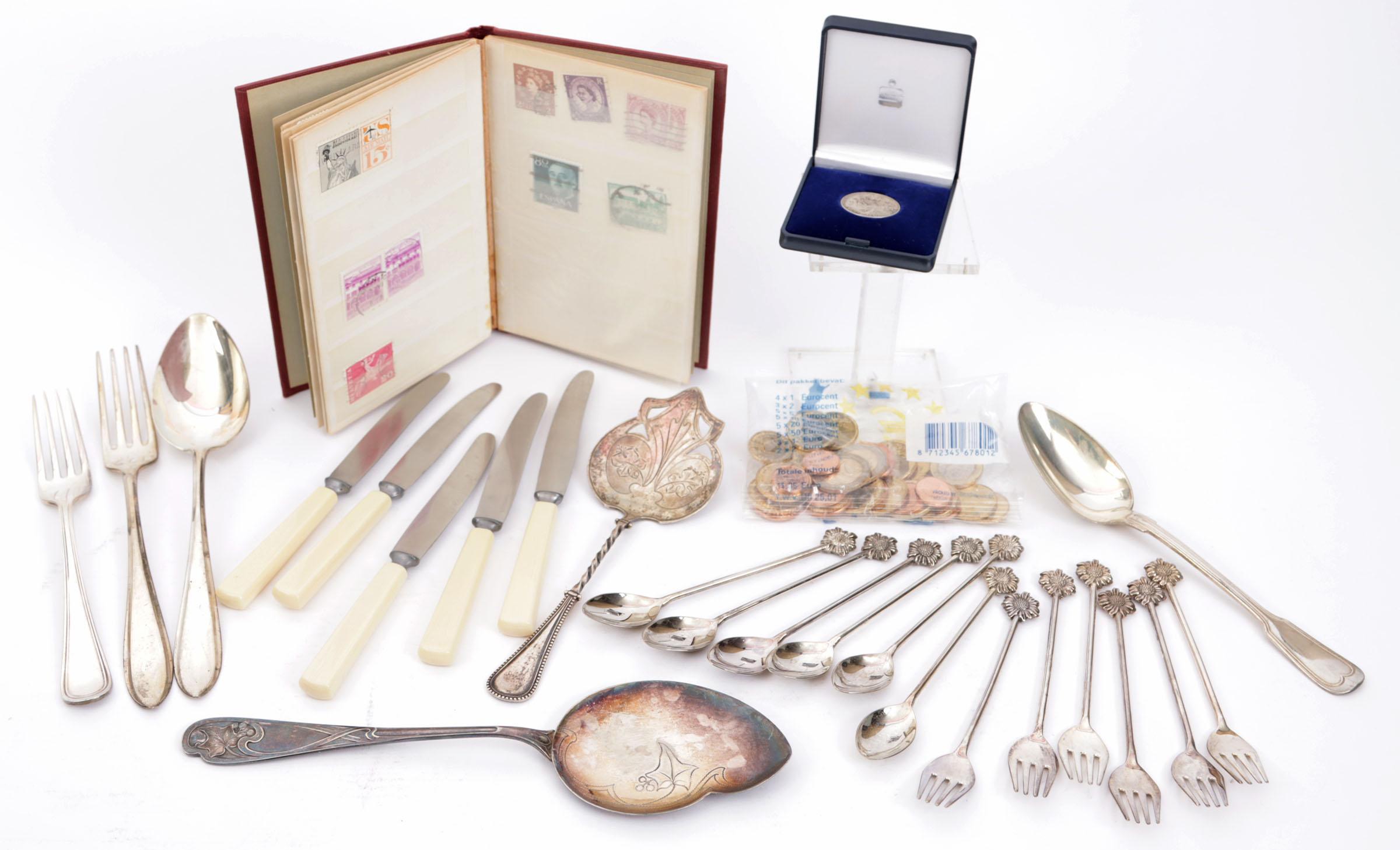 Koopje van 3 stuks zilver schepwerk, 159 gram, divers pleet, muntgeld, postzegeltjes, etc.