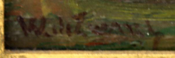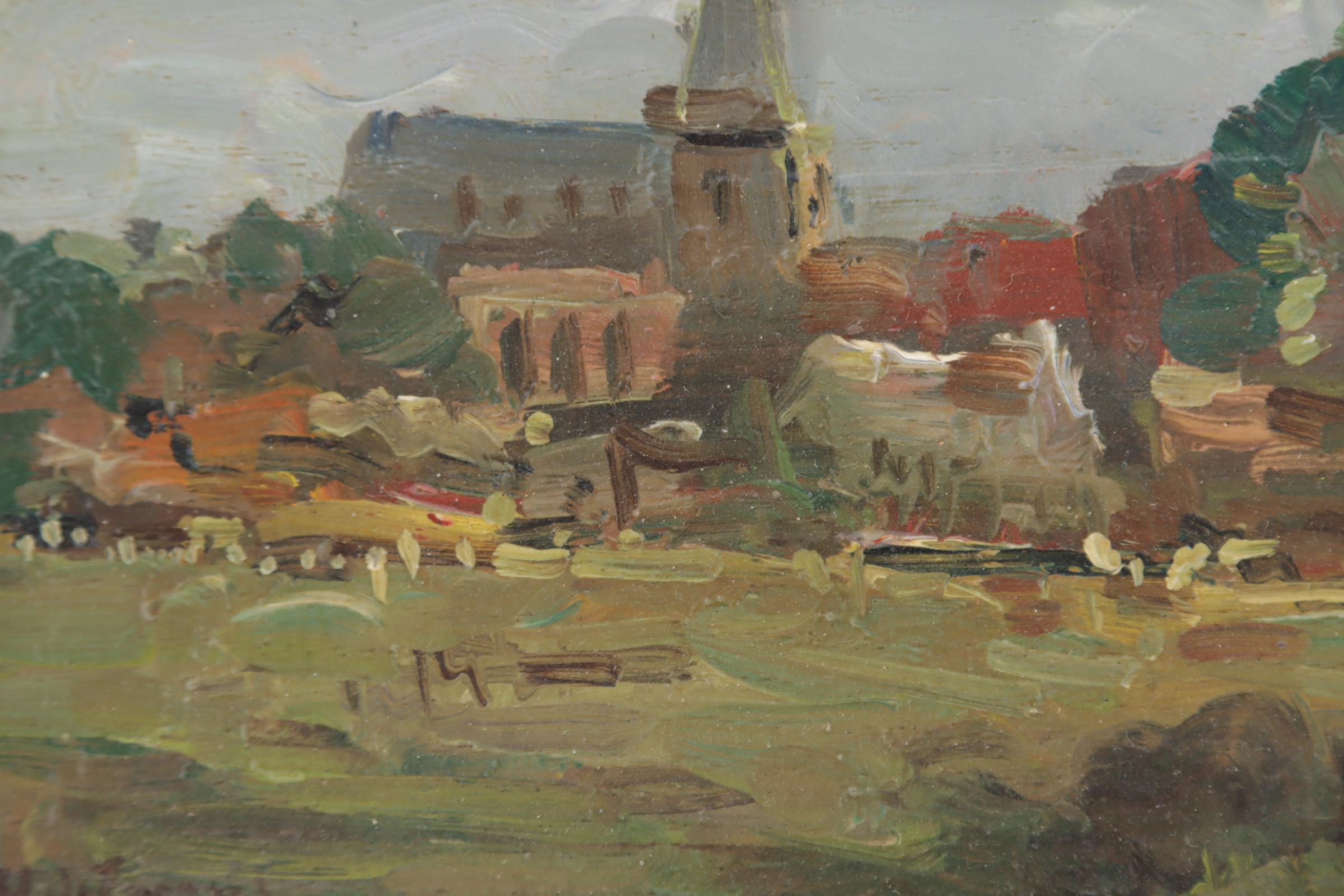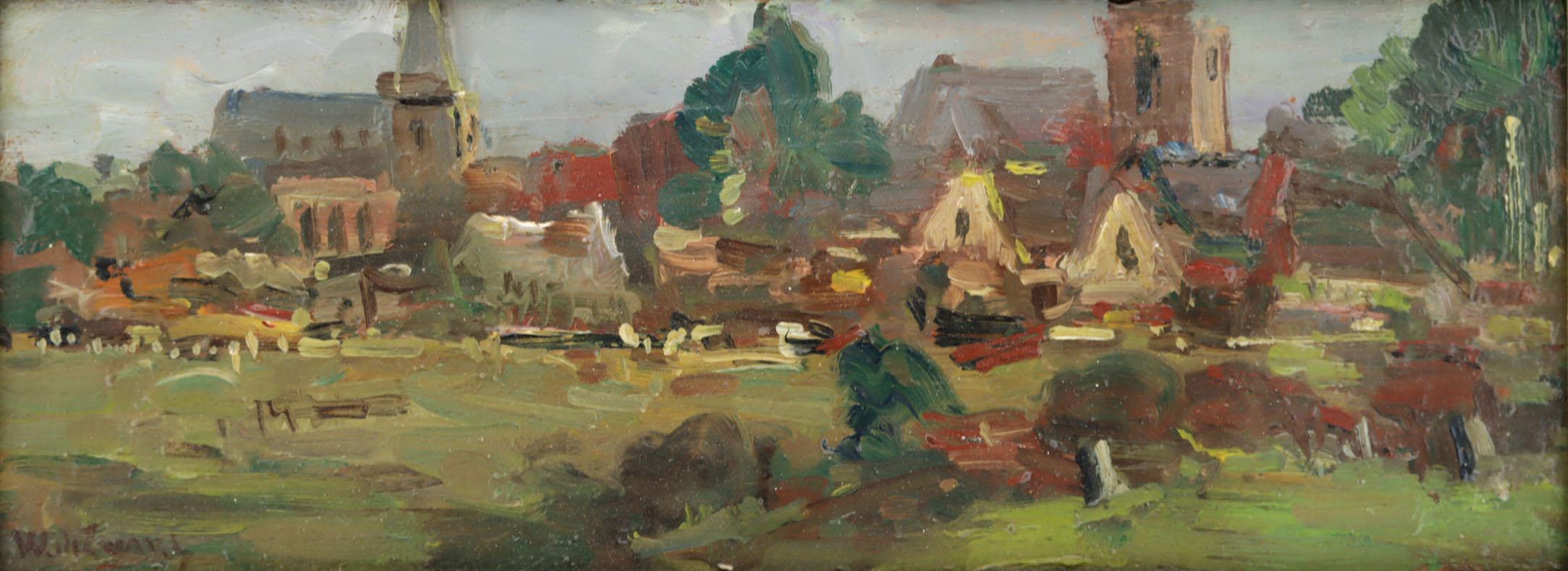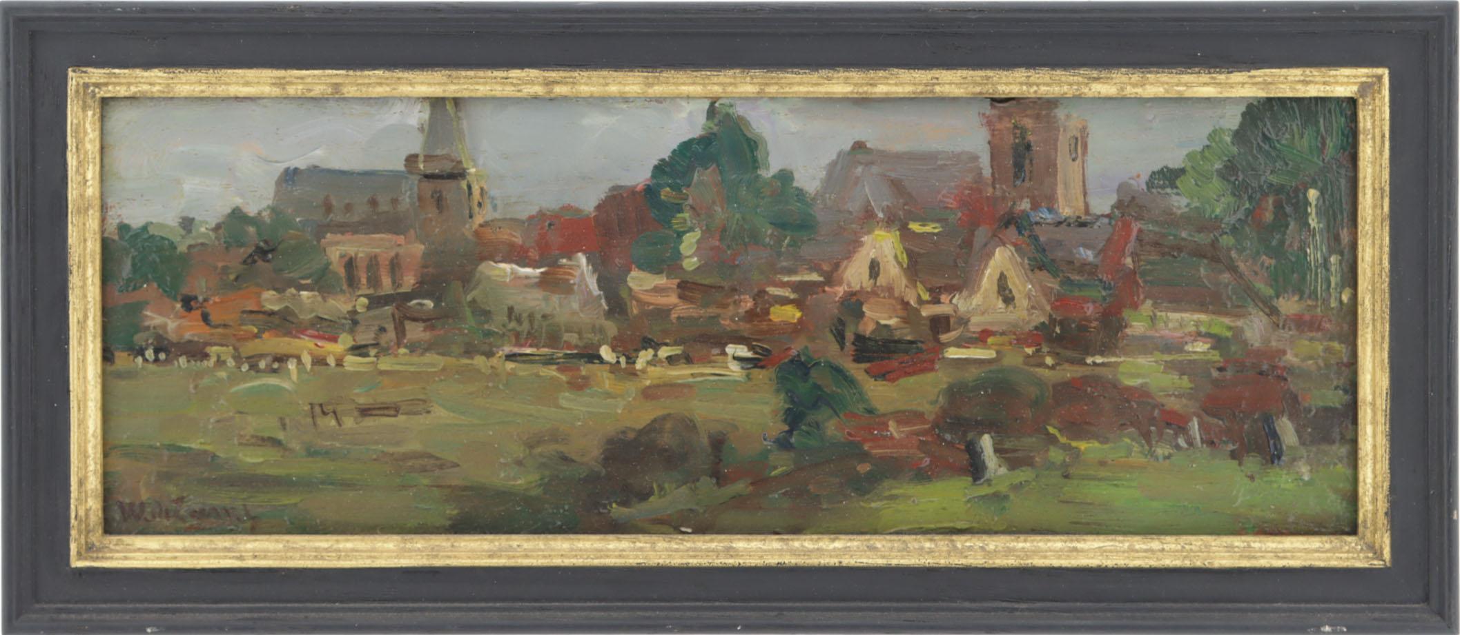 Wilhelmus Henricus Petrus Johannes (Willem) de Zwart (1862-1931), Landschapje met op de achtergrond twee kerken, olieverf op paneel, 26,5 x 9,5 cm.
