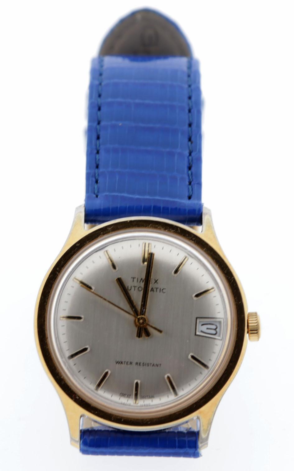 Vintage Timex polshorloge met blauw hagedissen lederen band, automaat