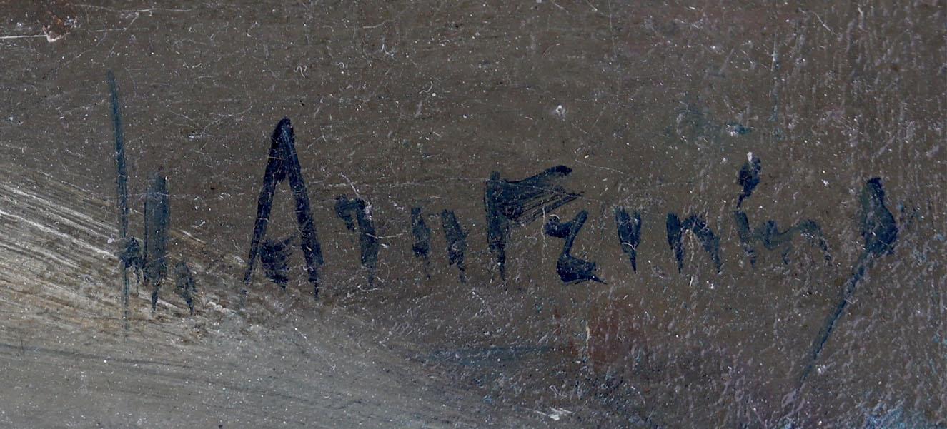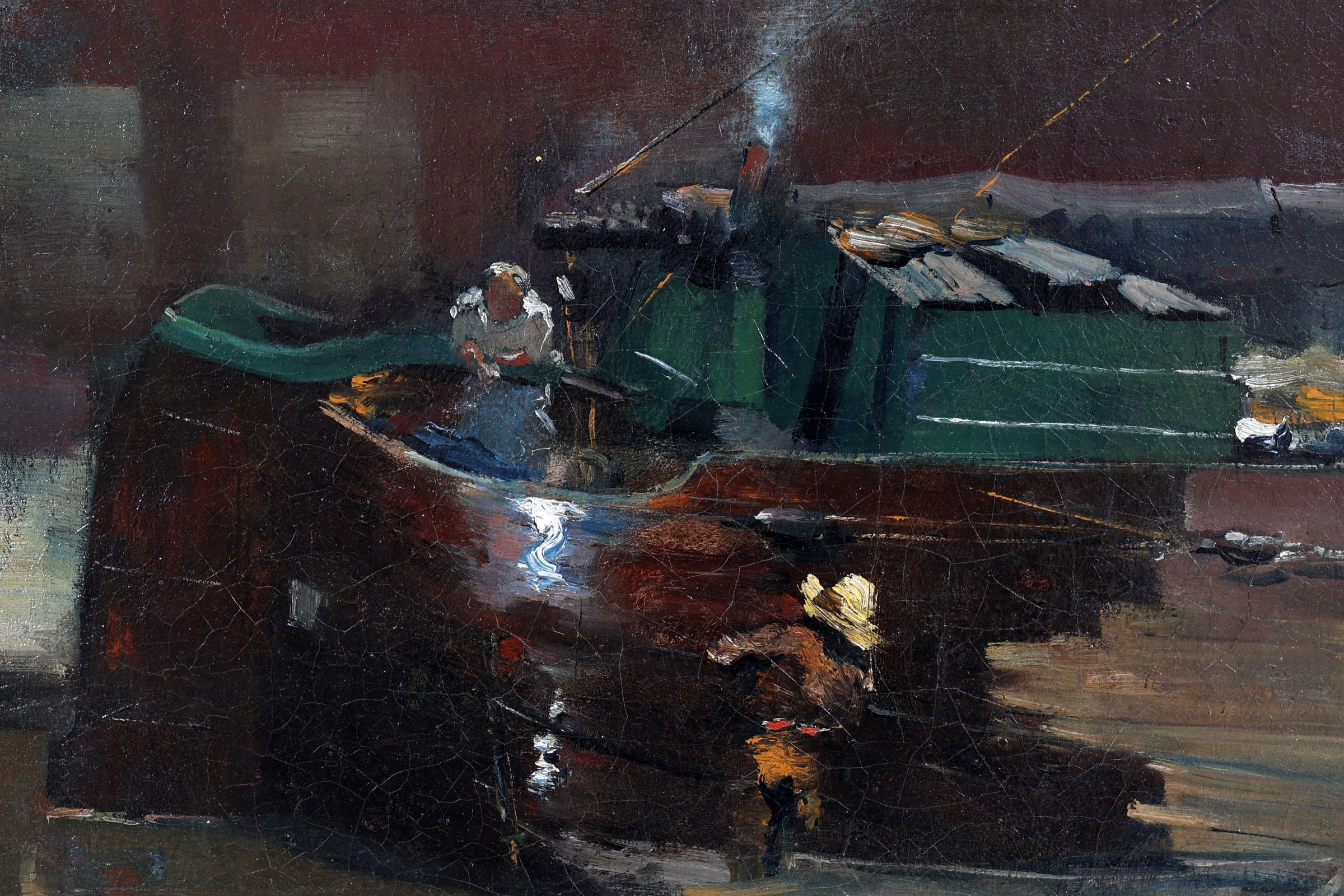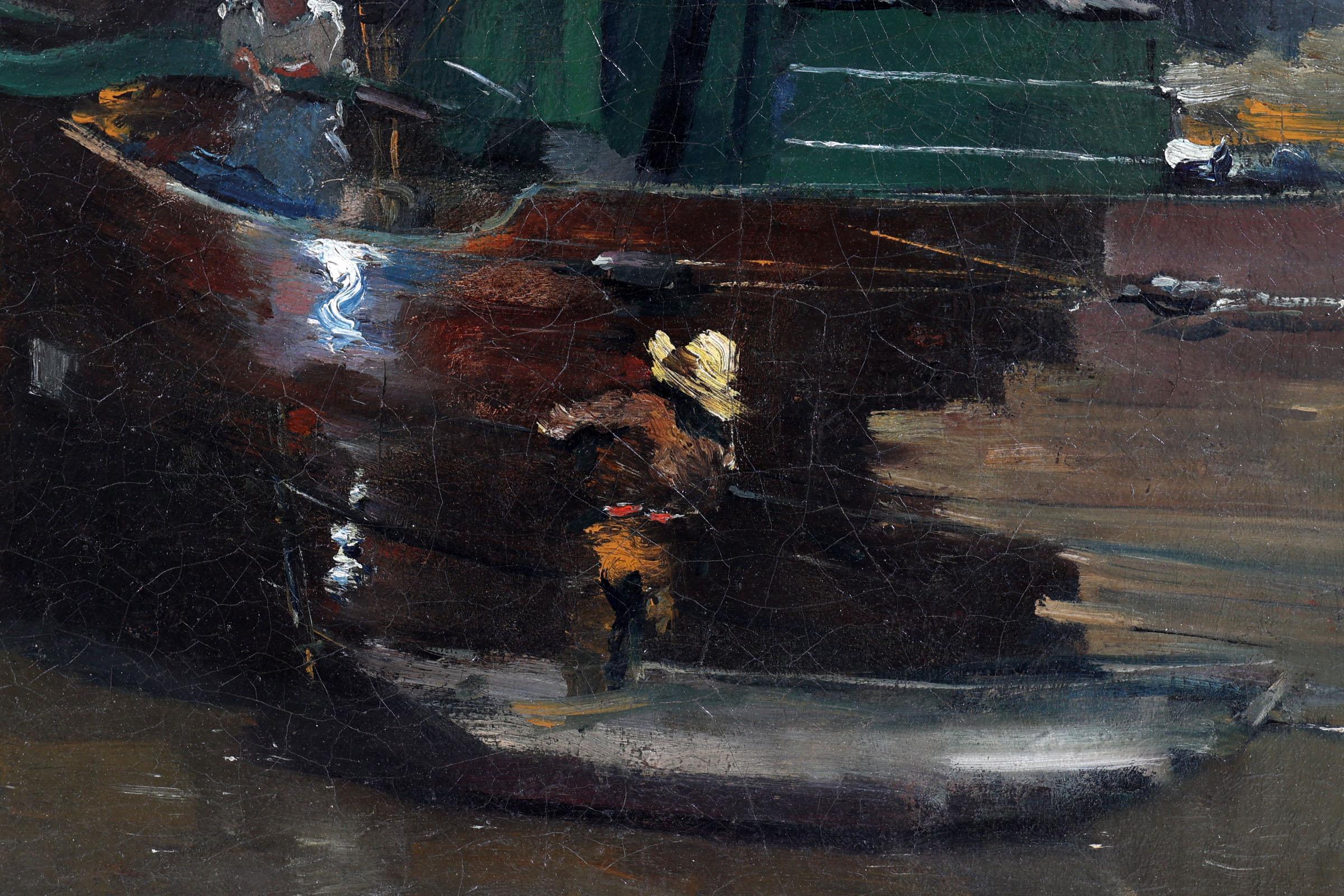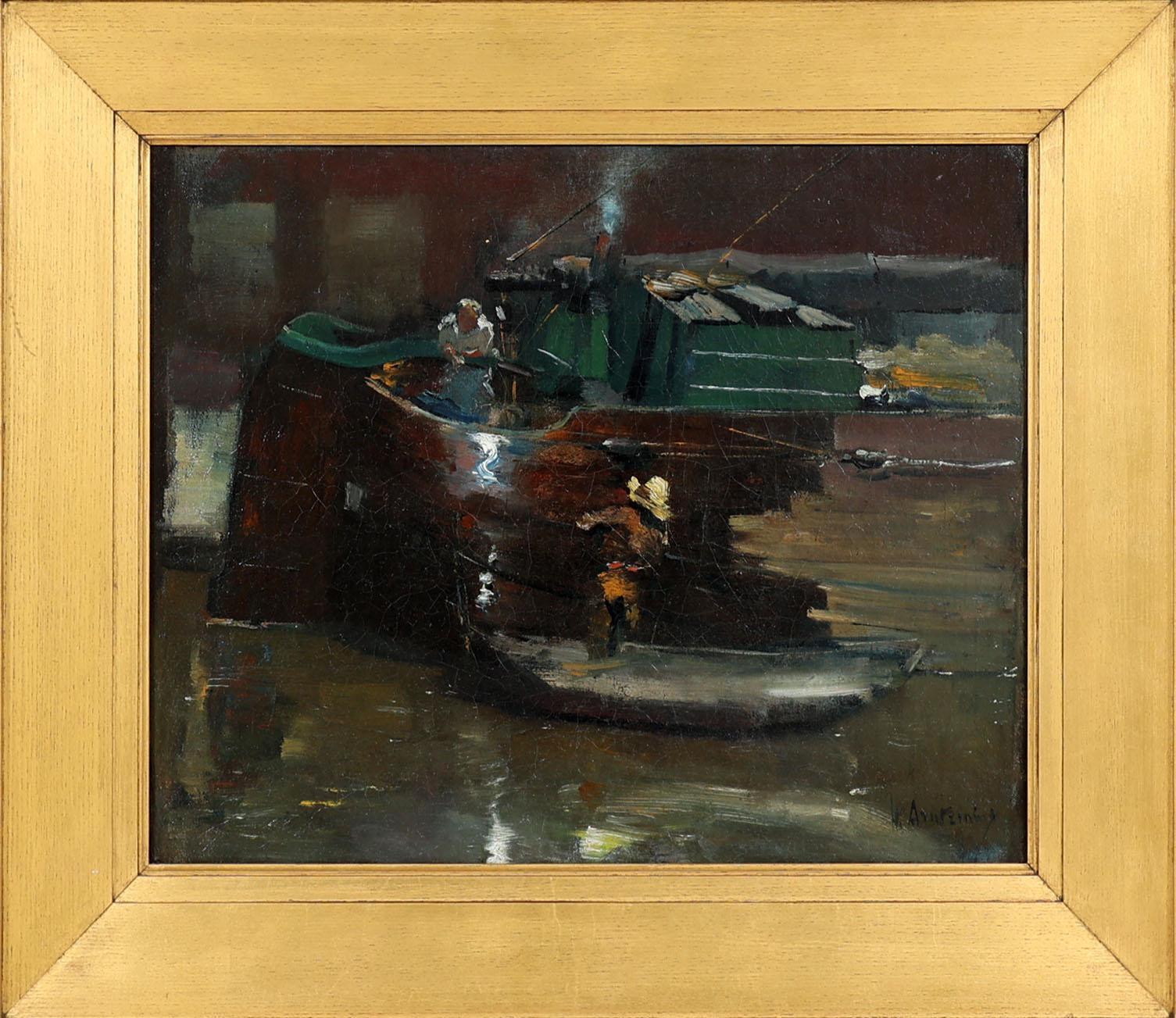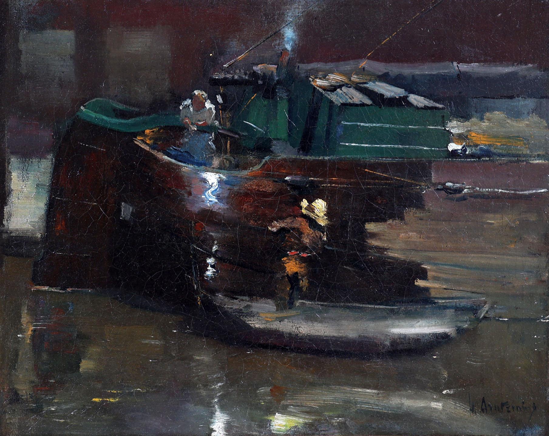 Floris Arntzenius(1864-1925), Schilder werkzaamheden aan het schip van W.B. Tholen(1860-1931), olieverf op doek, 48 x 39 cm.