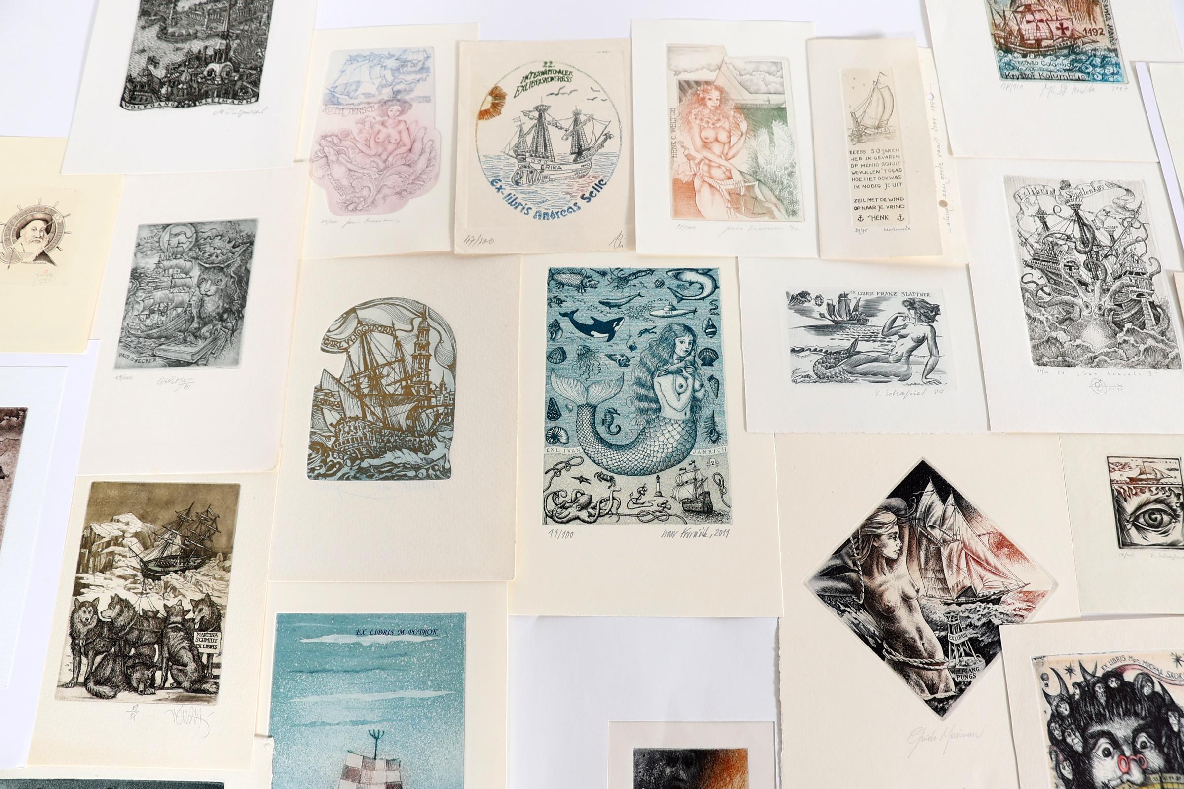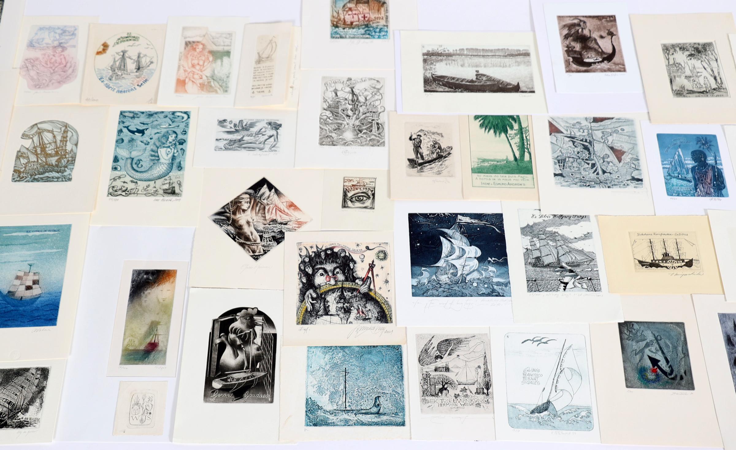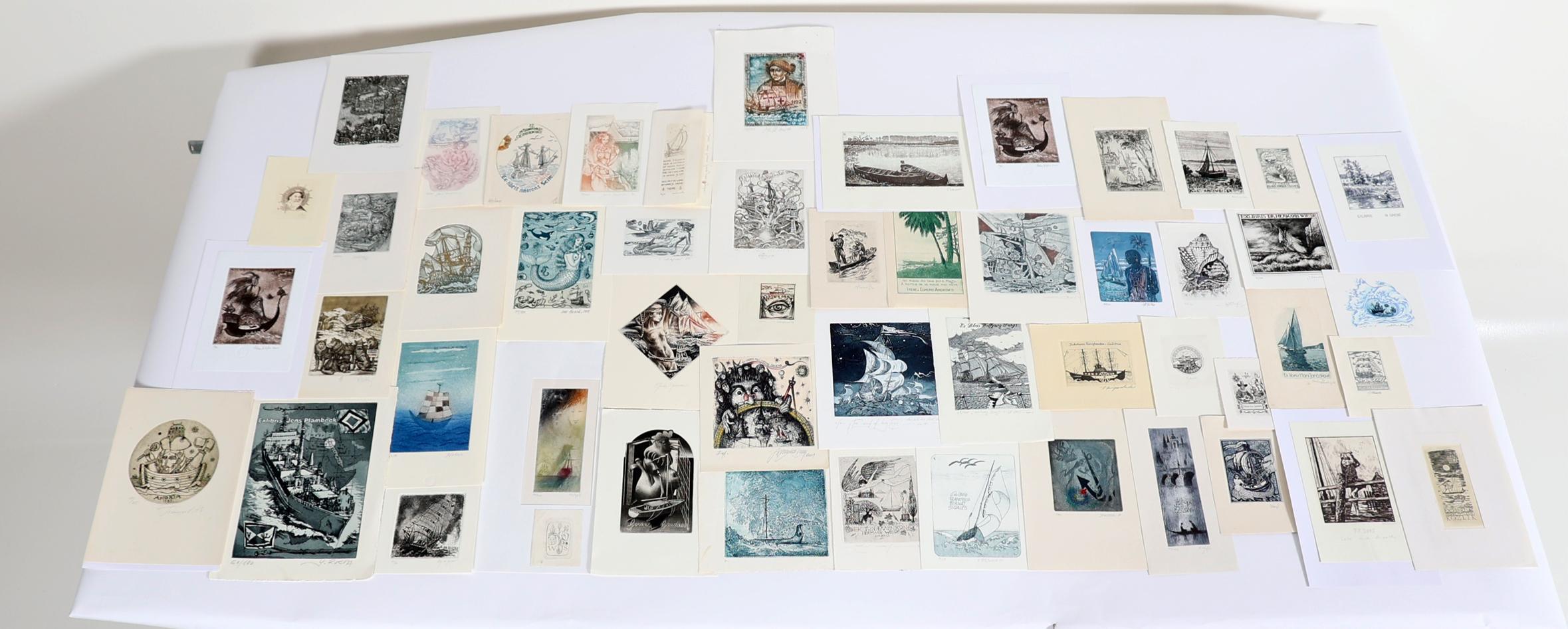 Collectie van 50 exlibris / kleingrafiek, thema: 'schepen', diepdrukken (C2, C3, etc.). gesigneerd, deels opgeplakt. Gemaakt door o.a. Gennadiev, Szumarski, Velikov, Ven, Rusch, Lambrecht, Kens, Missieri, Mommen, Schapiel, Kvartalny, Mariman.