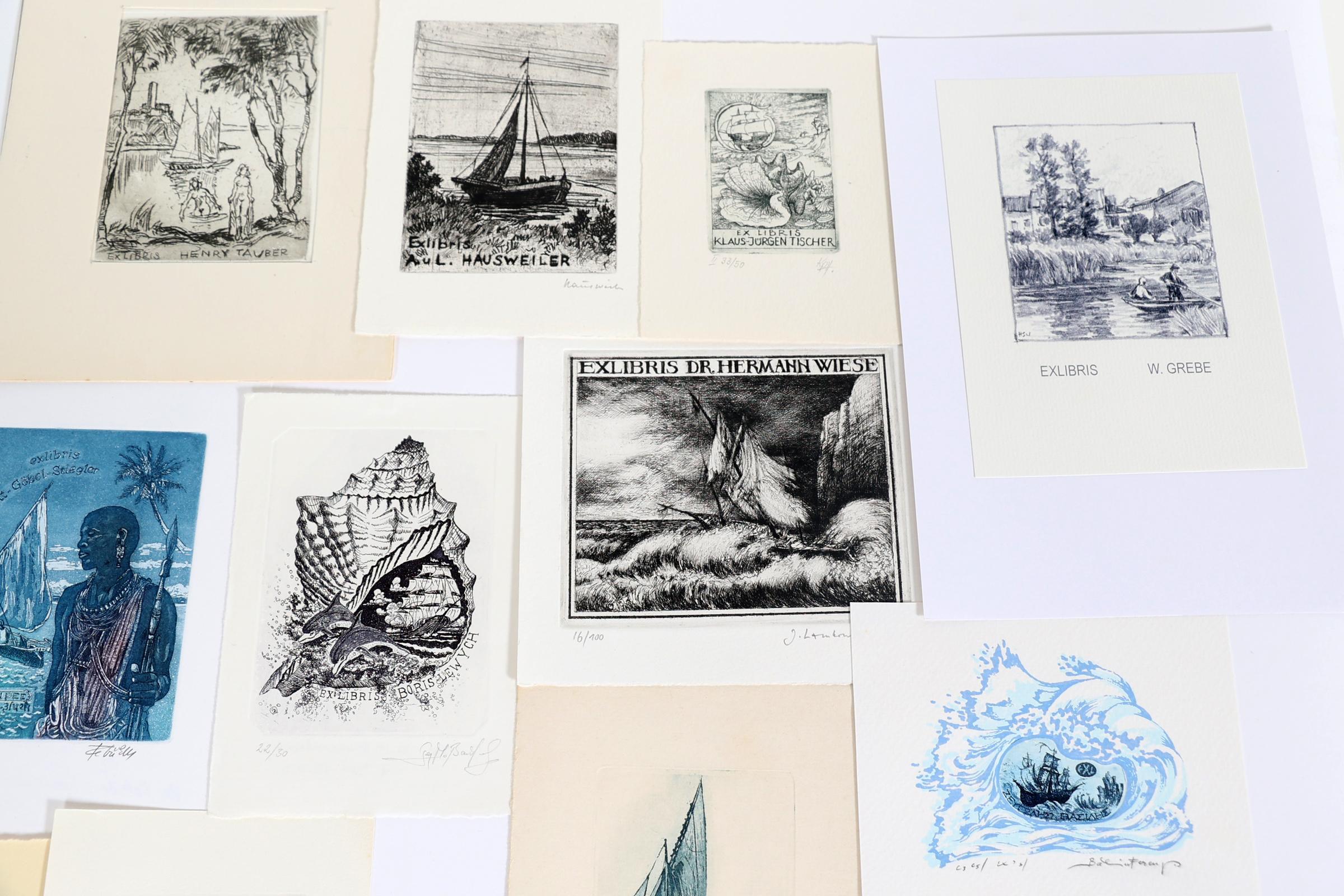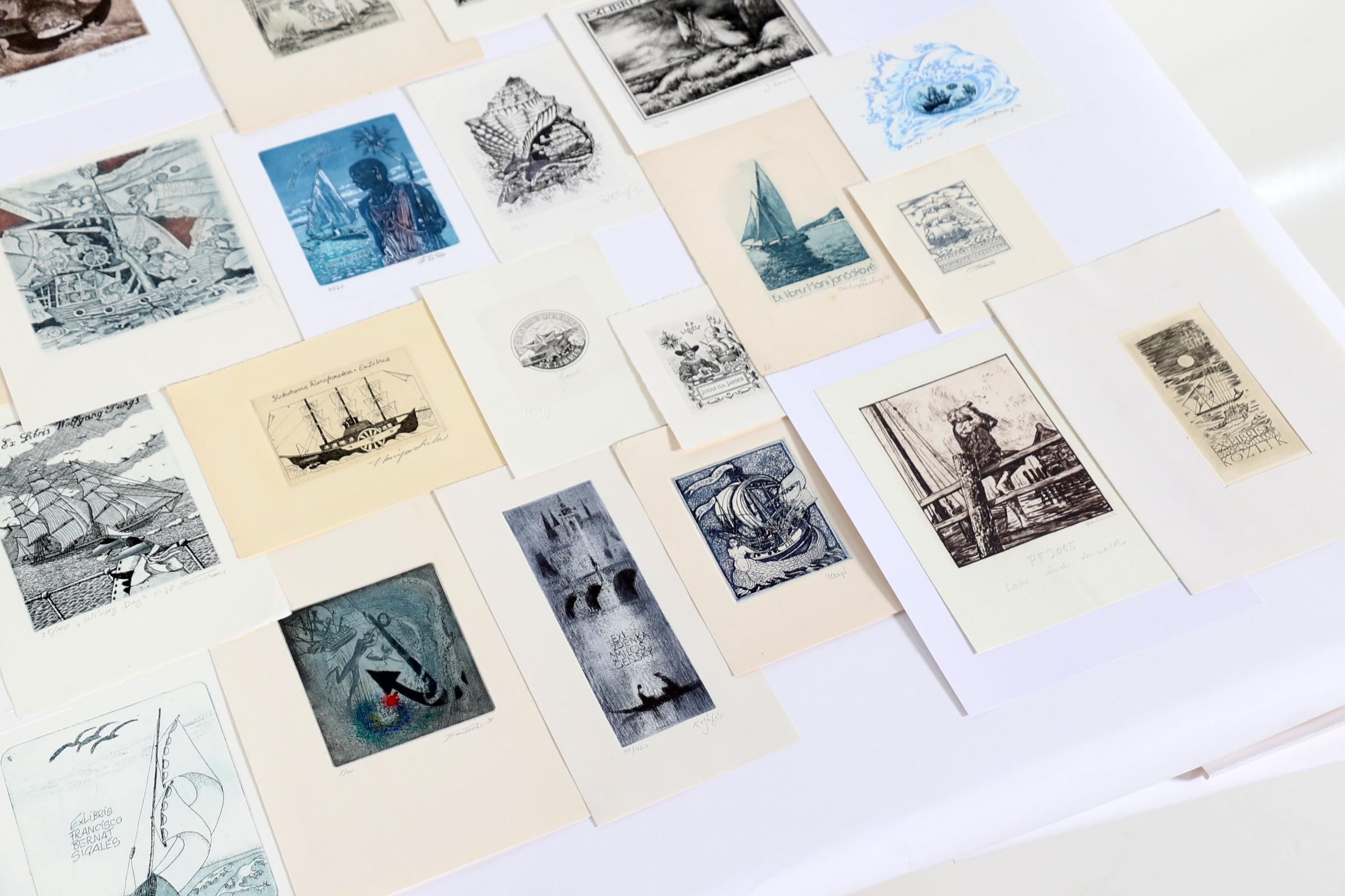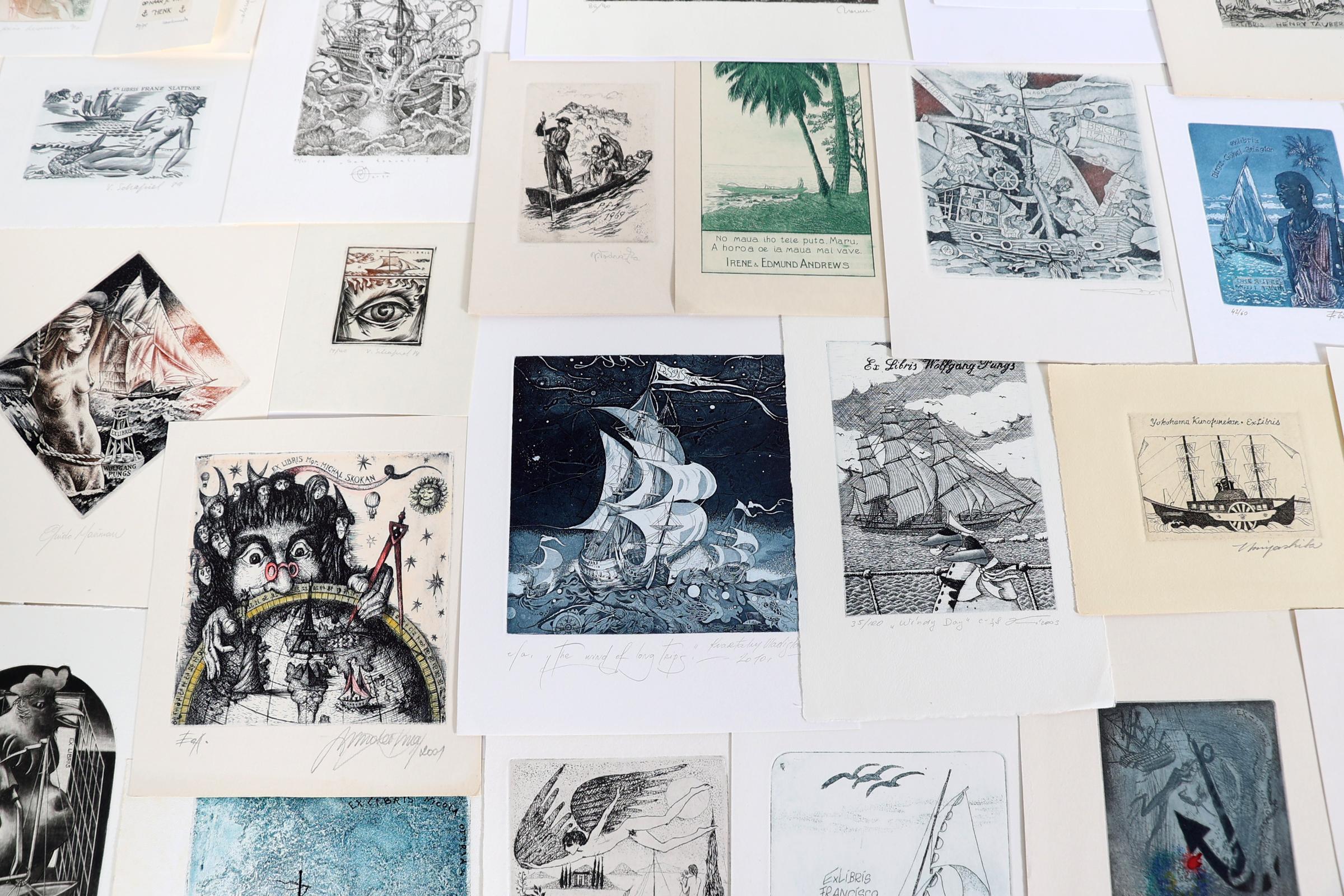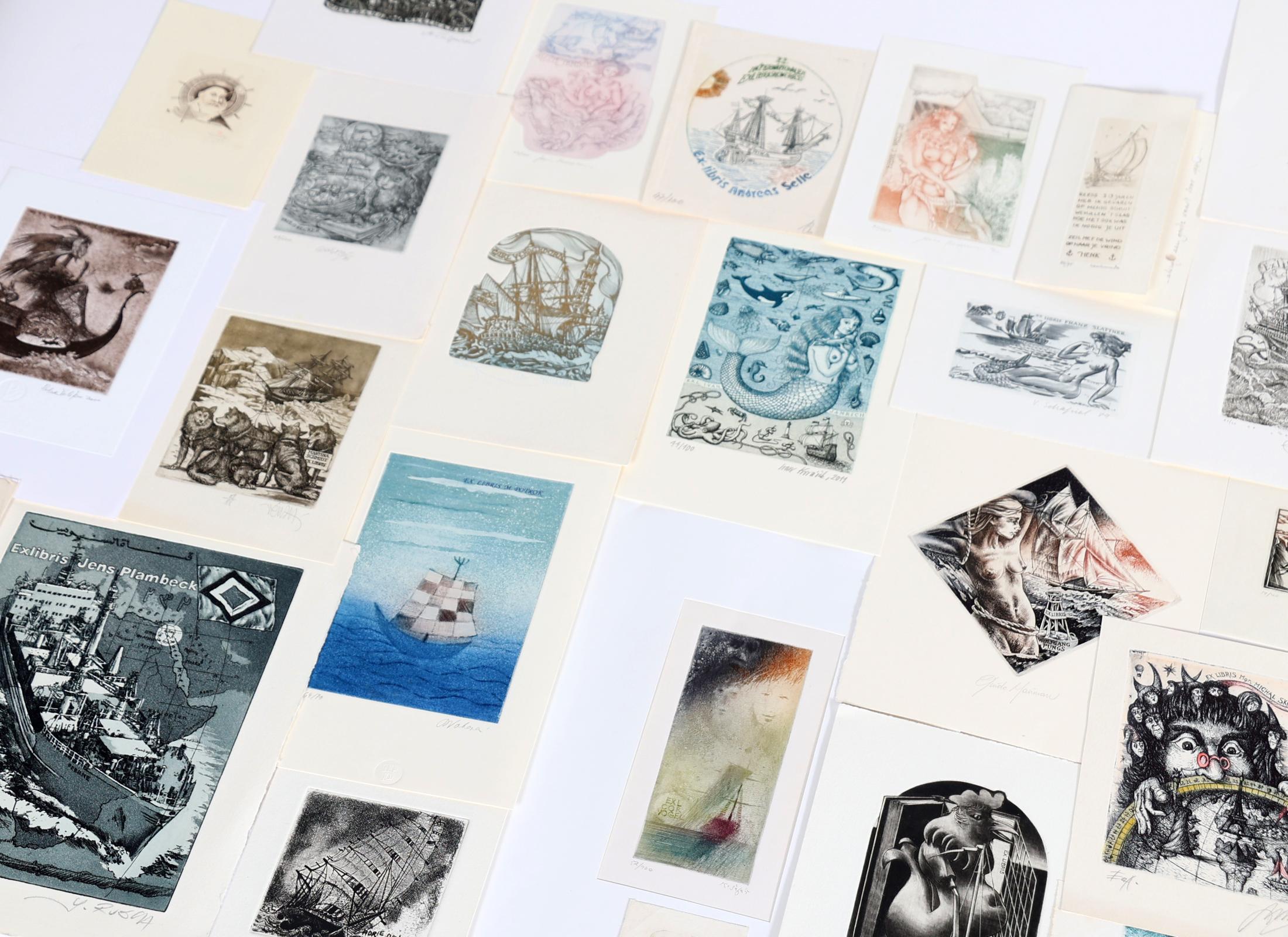 Collectie van 50 exlibris / kleingrafiek, thema: 'schepen', diepdrukken (C2, C3, etc.). gesigneerd, deels opgeplakt. Gemaakt door o.a. Gennadiev, Szumarski, Velikov, Ven, Rusch, Lambrecht, Kens, Missieri, Mommen, Schapiel, Kvartalny, Mariman.