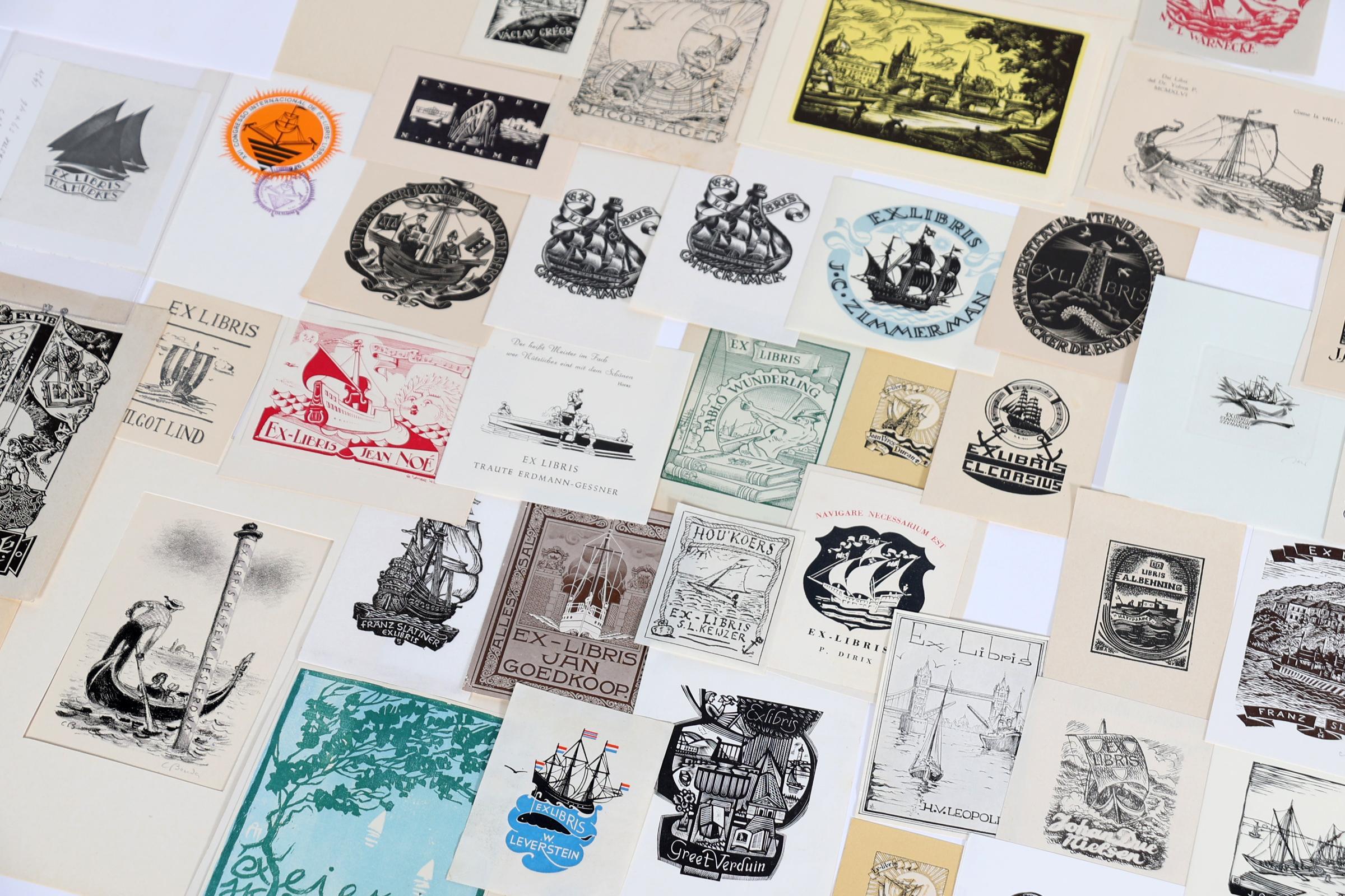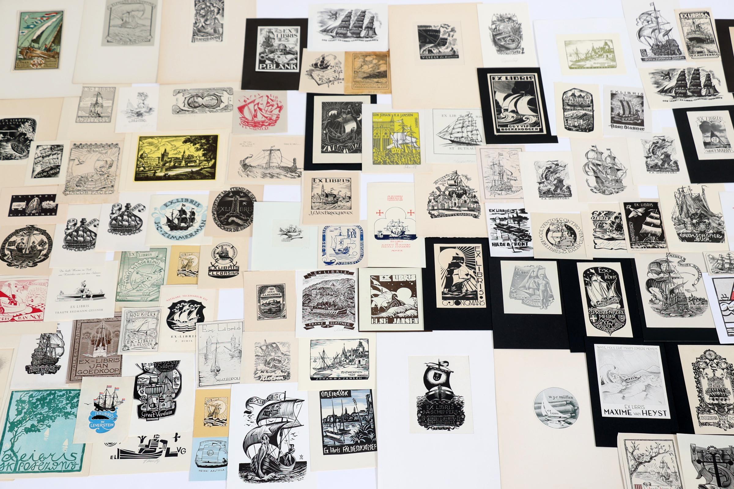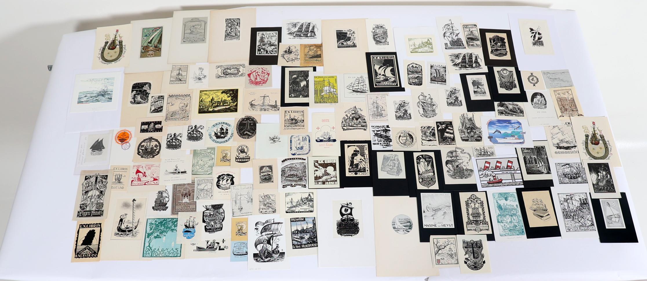 Collectie van plm. 100 exlibris / kleingrafiek, thema: schepen', hoogdruk / vlakdruk, deels gesigneerd, deels opgeplakt. Gemaakt door o.a. Baeyens, Van Luyn, Hofmann, Schoener, Bouda, Koslovsky, Battermann, Mrozewski, Rueter.