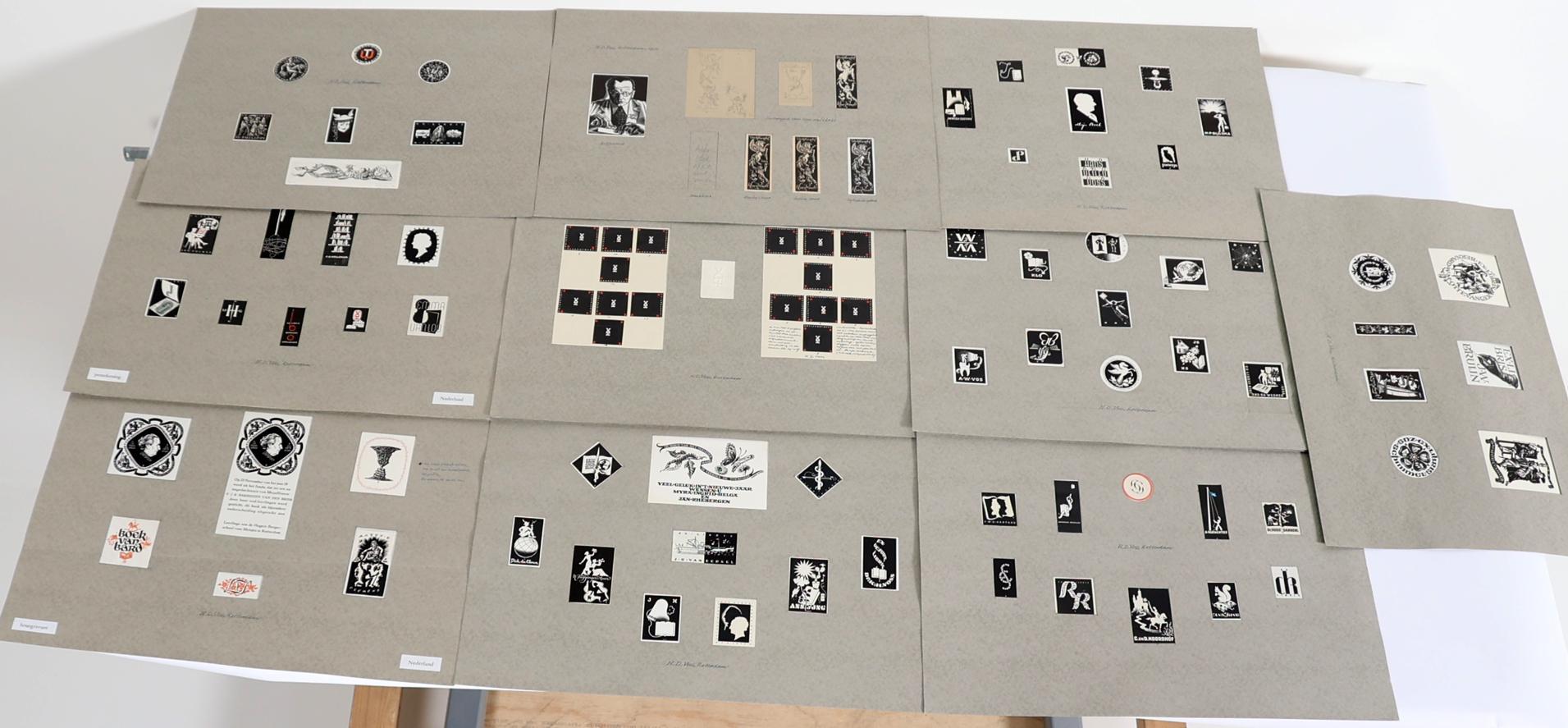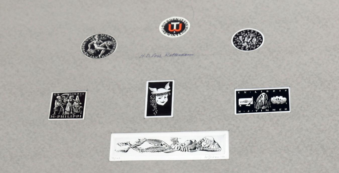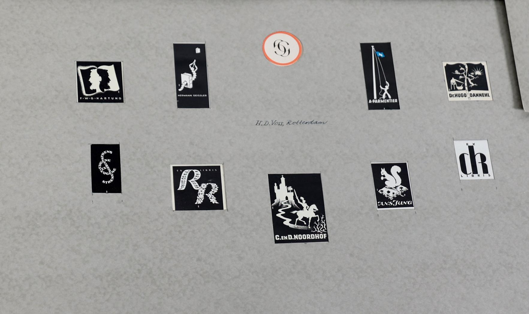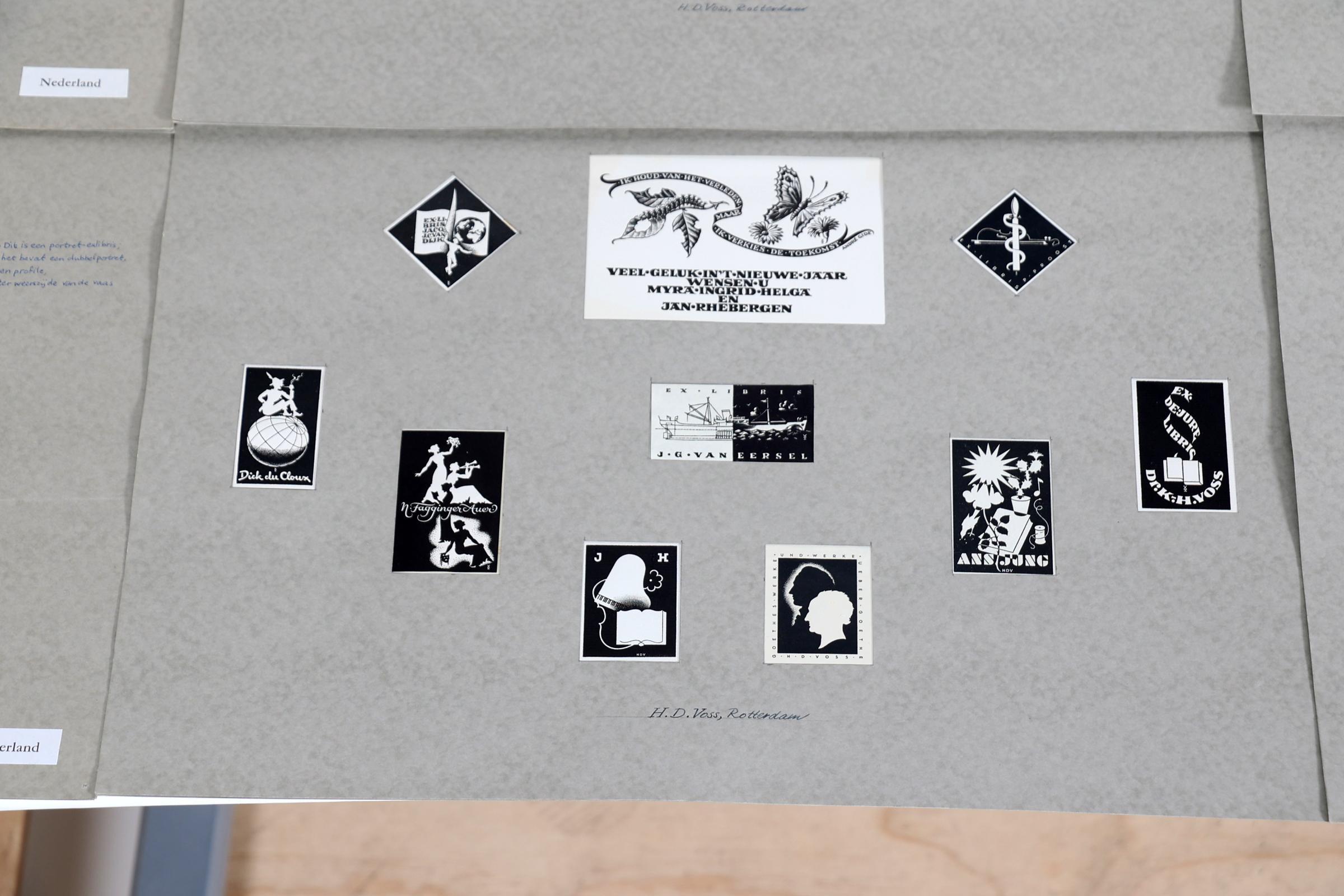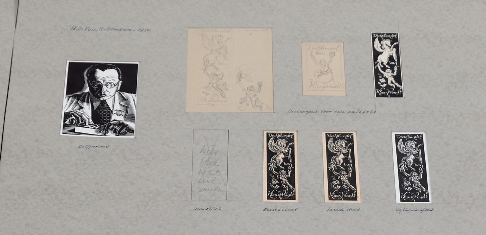 Voss, H.D., plm. 50 exlibris / kleingrafiek, plus ontwerptekeningen van het exlibris van Voss voor Klaas Woudt. Opgeplakt op grote vellen / passe partouts