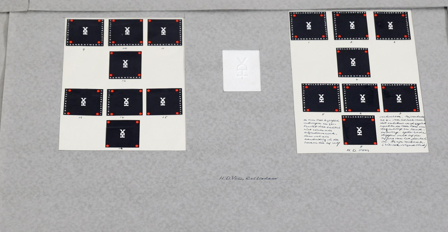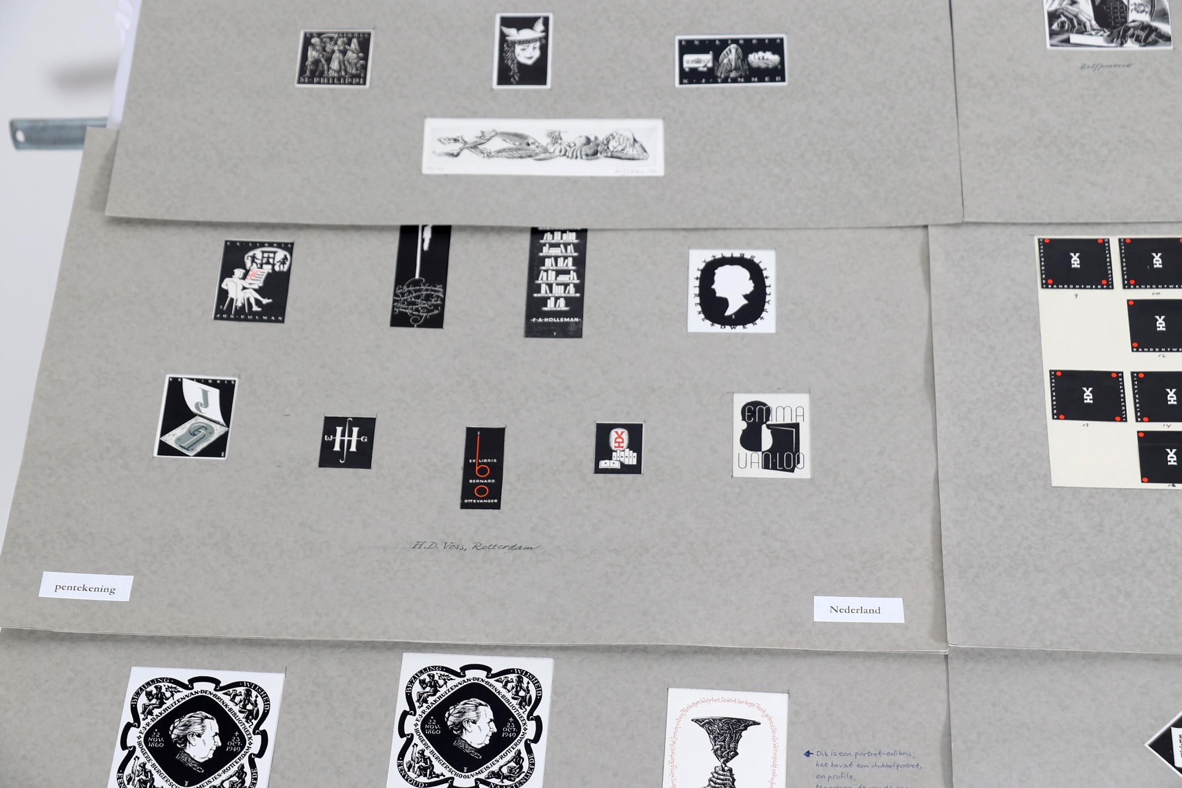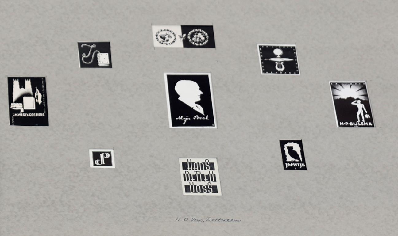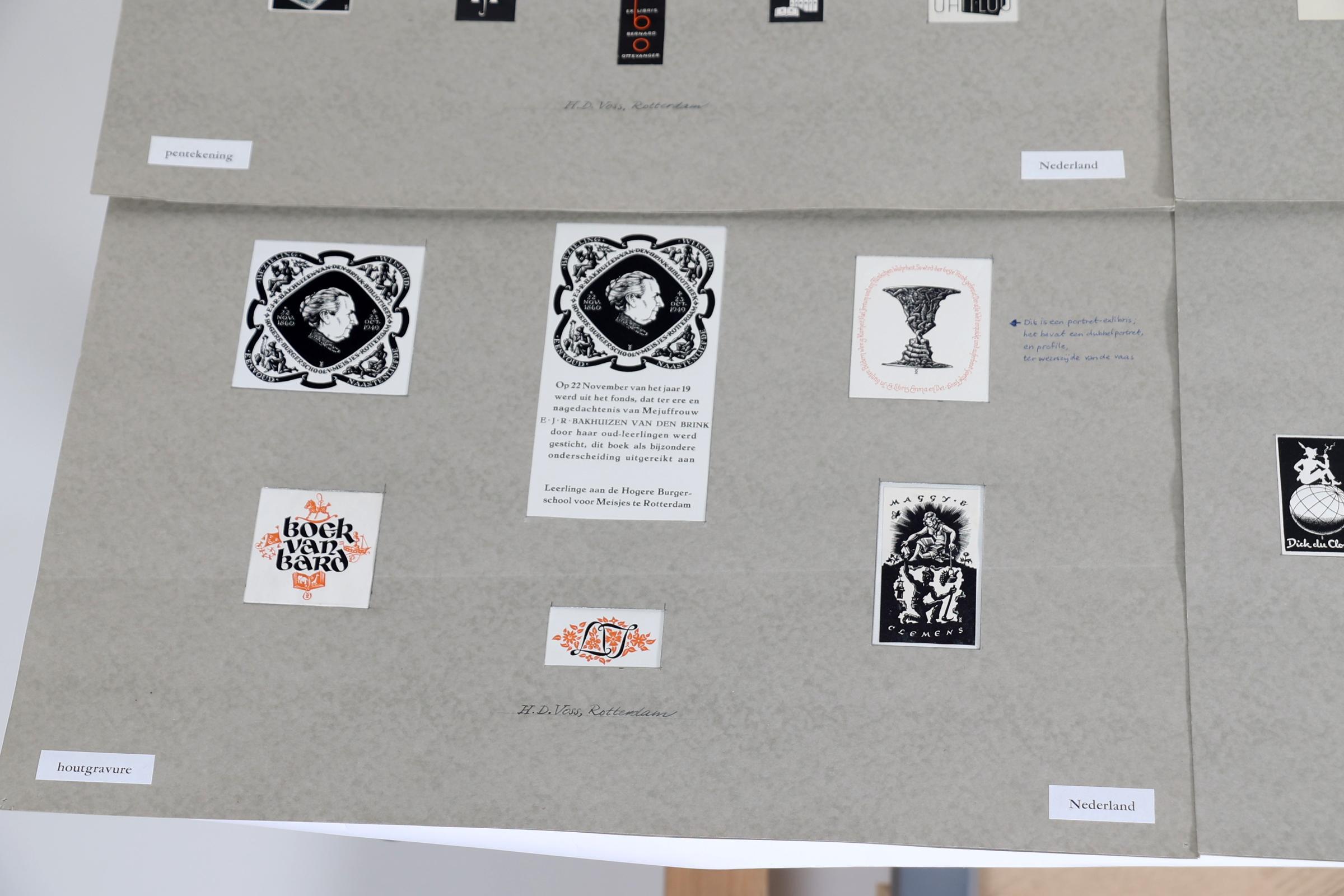 Voss, H.D., plm. 50 exlibris / kleingrafiek, plus ontwerptekeningen van het exlibris van Voss voor Klaas Woudt. Opgeplakt op grote vellen / passe partouts
