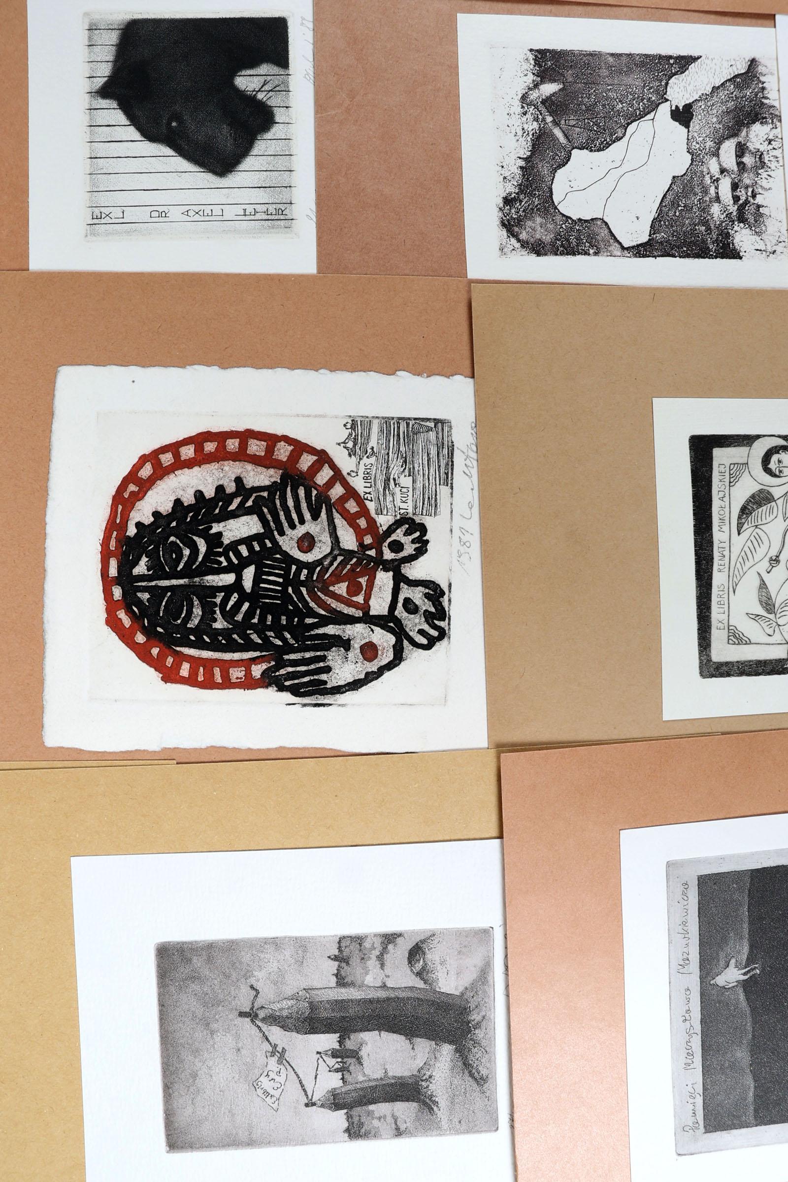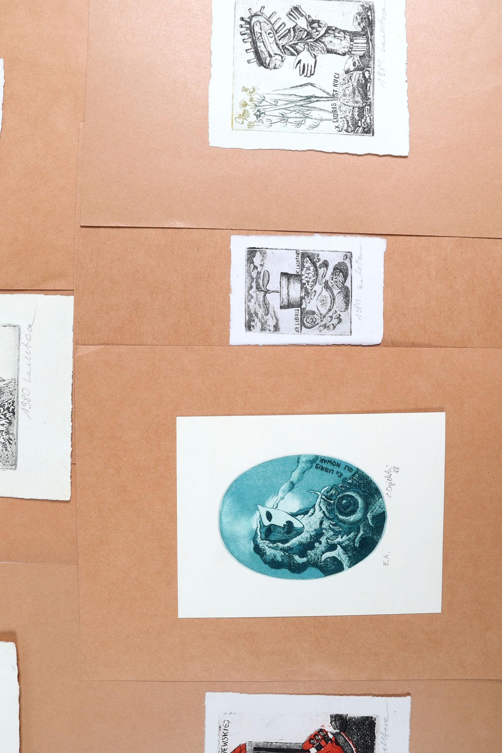 collectie plm. 40 Poolse exl., diepdrukken, opgeplakt, deels gesigneerd. Kunstenaars o.a. Ogielski, Kowalczyk, Lachtara, Oscwski