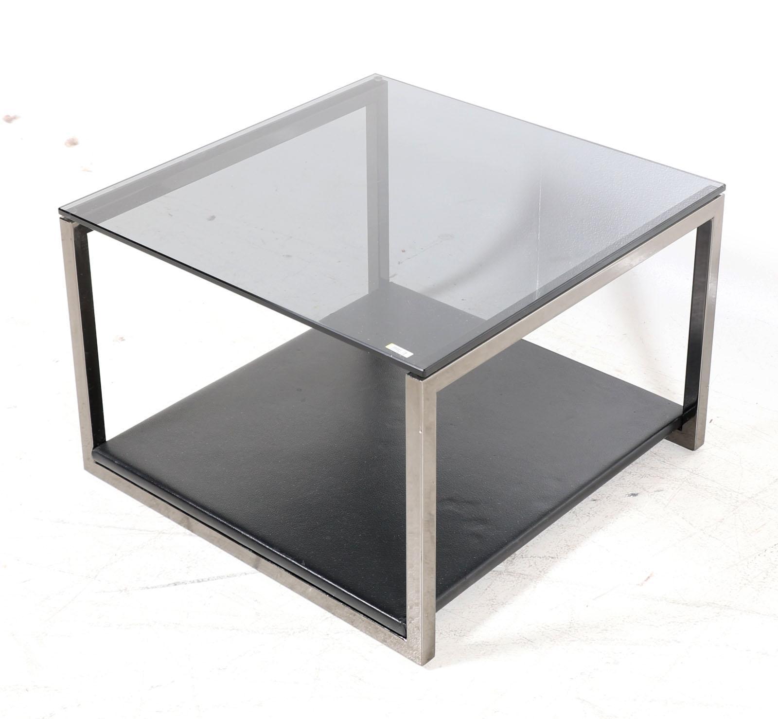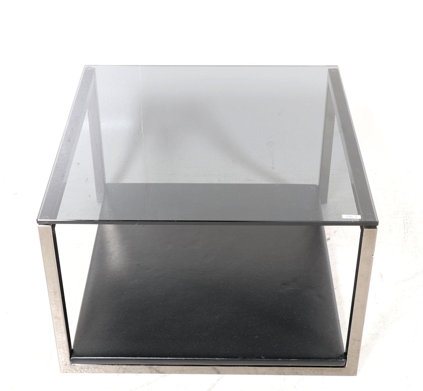 Design salontafel met rookglazen blad bovenop en een lederen blad onder, h.40 x b.60 x d.60 cm.