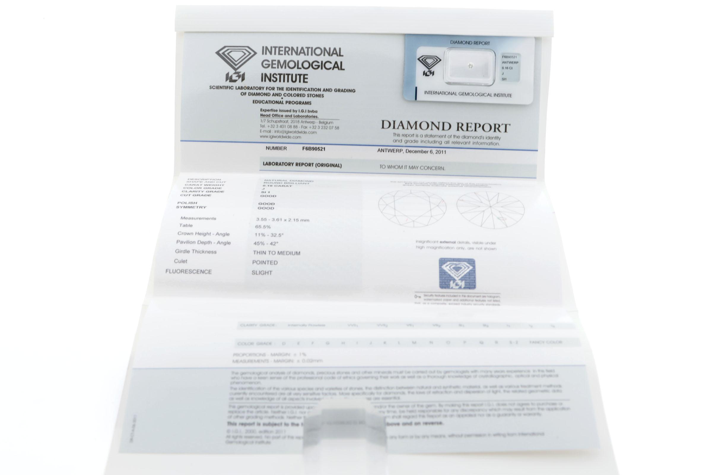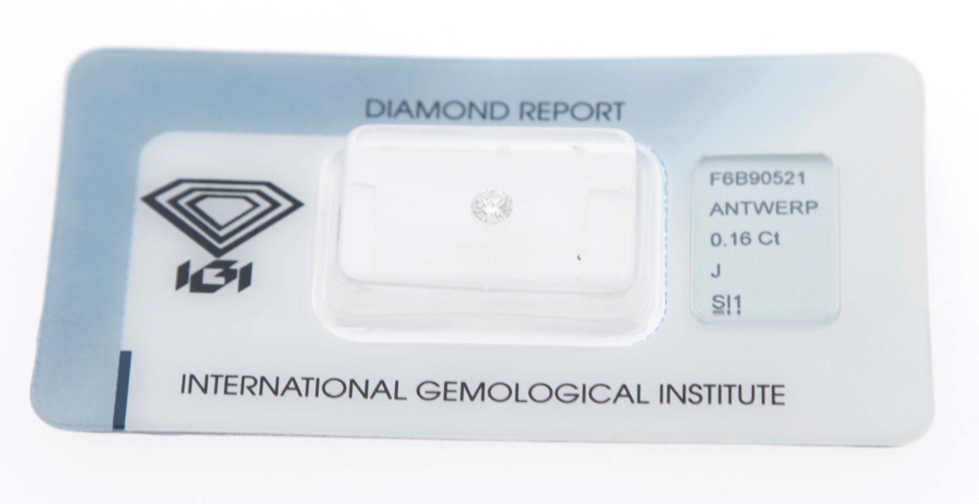 Briljant geslepen diamant, 0.16 ct., SI1, J, met diamant rapport van het International Gemological Institute Antwerpen