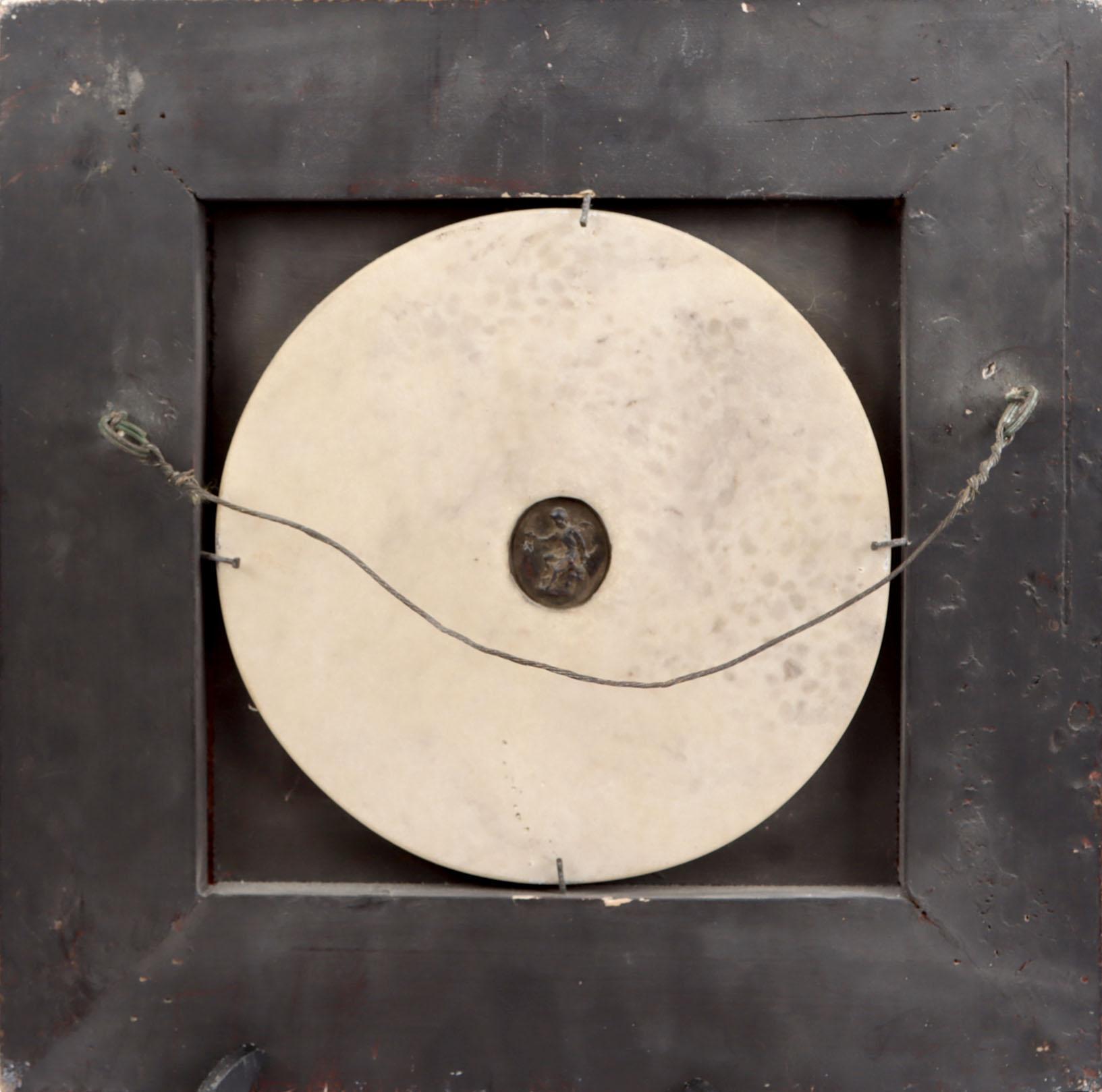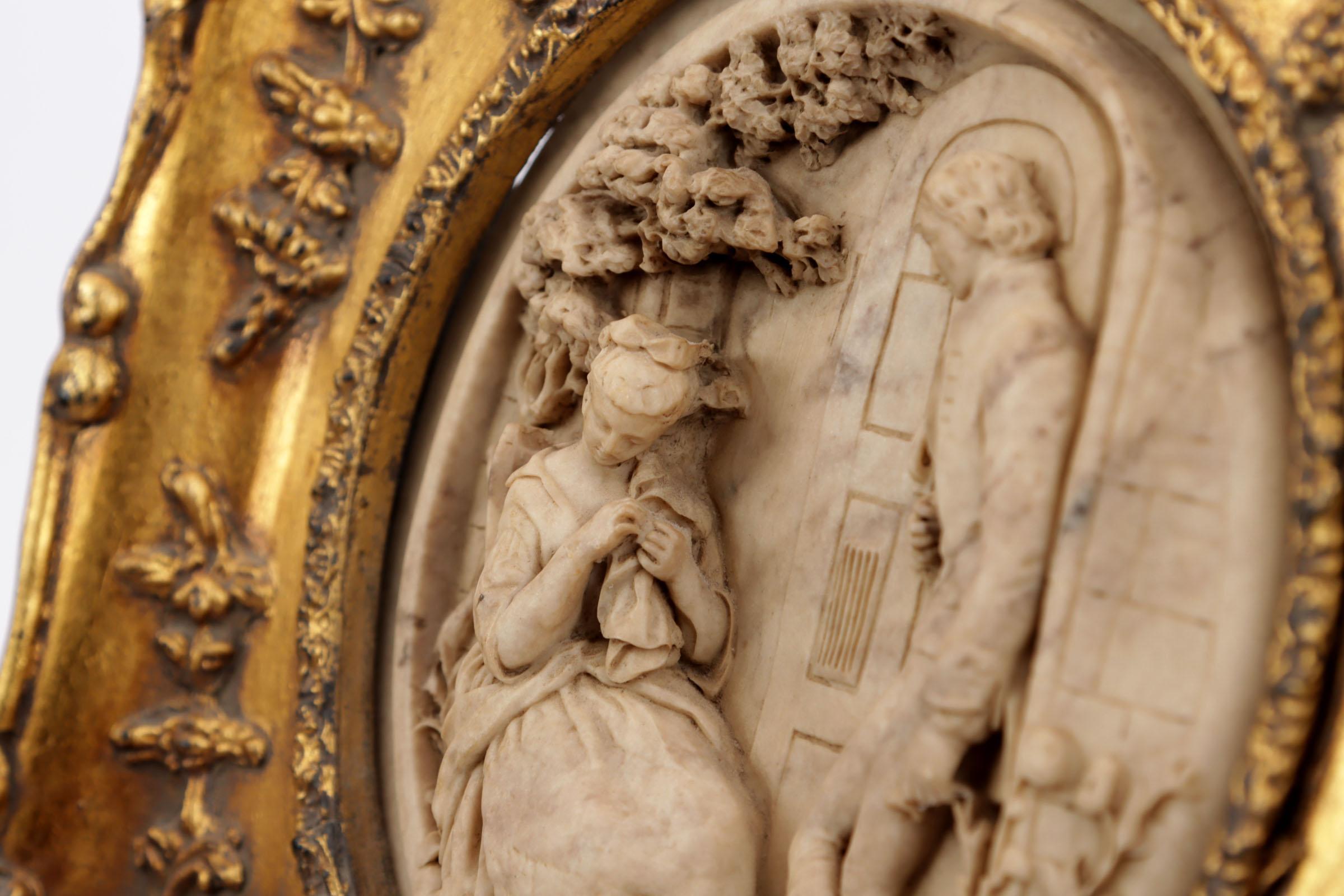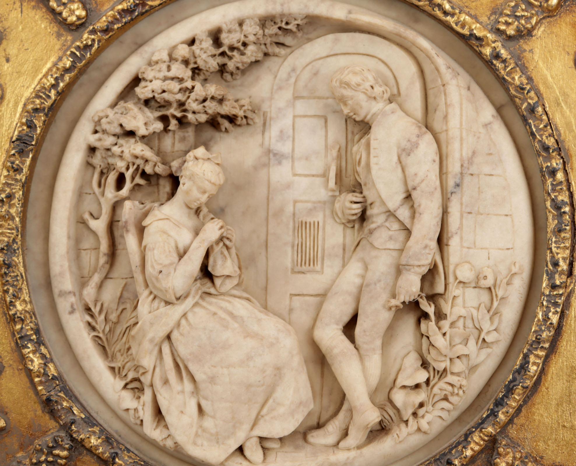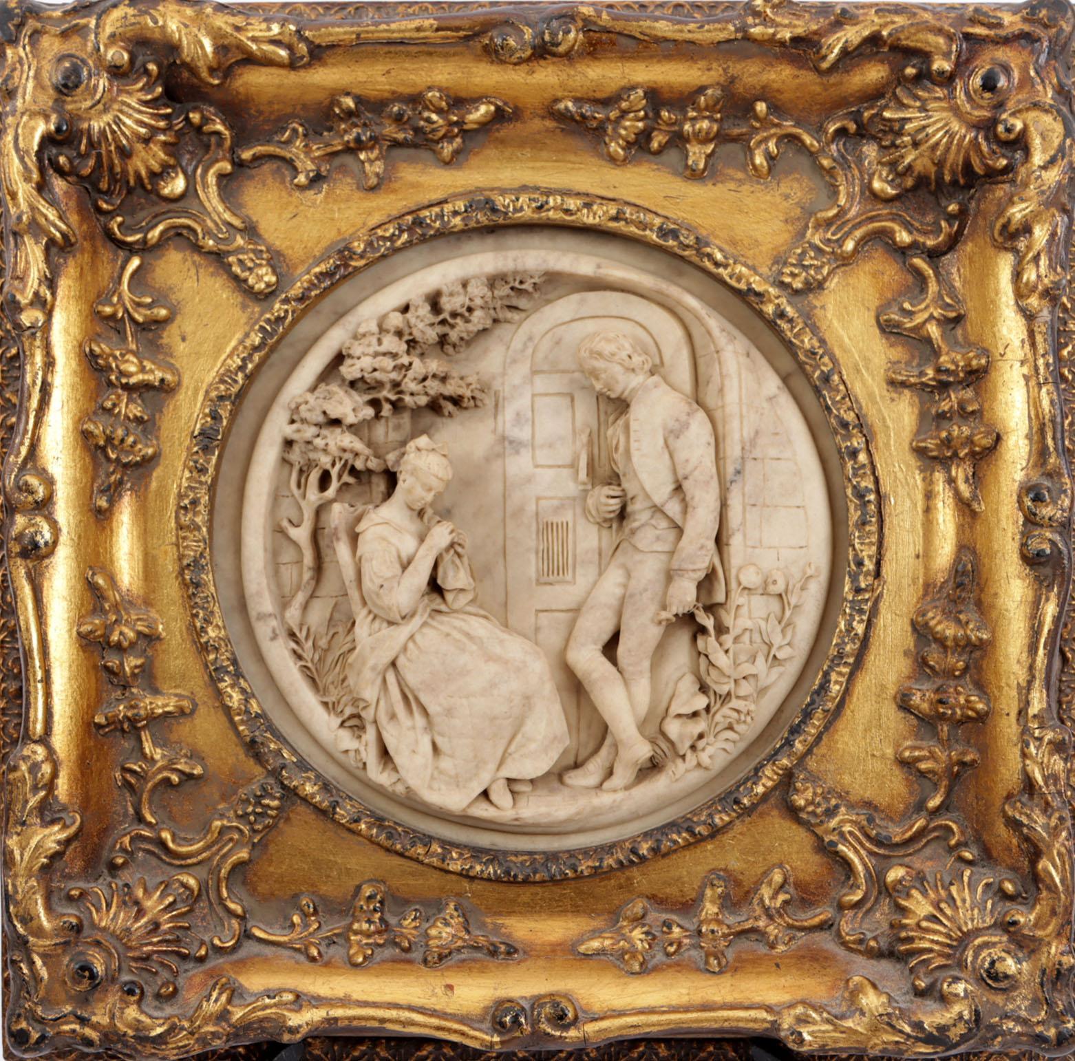Albasten plaquette in goudkleurige lijst 30 x 30 cm.