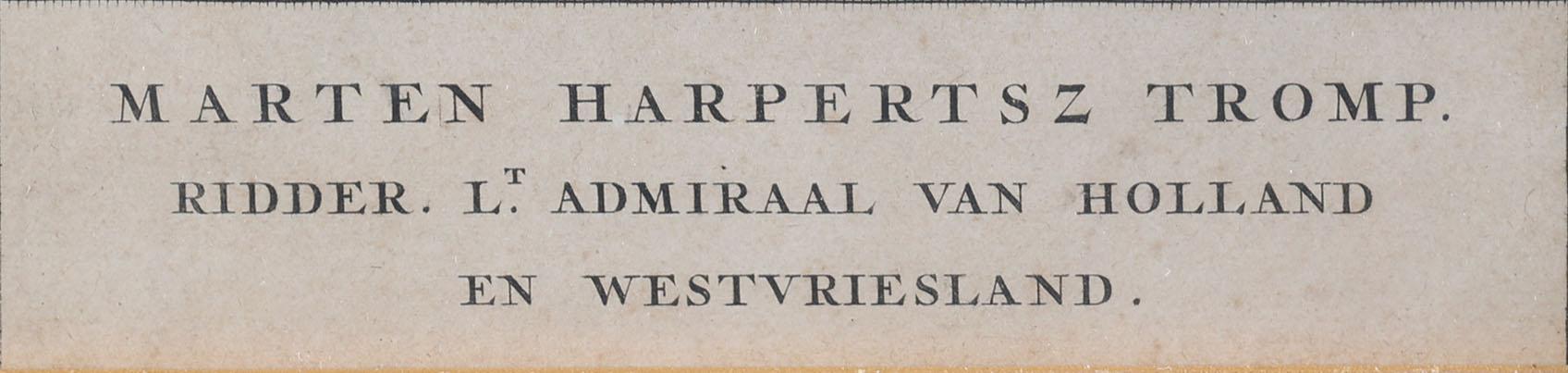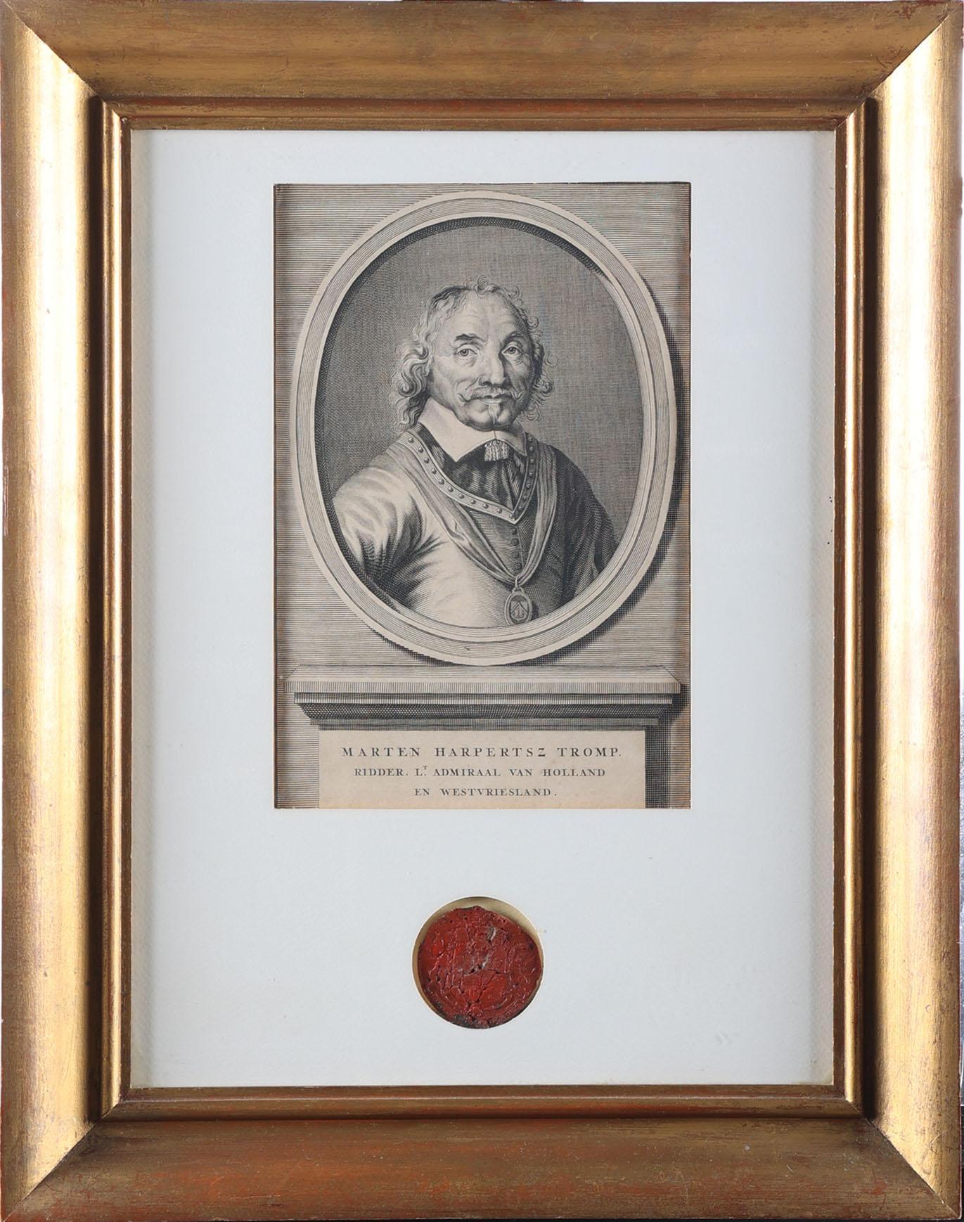 Gravure met afbeelding van 'Marten Harpertsz Tromp, Luitenant Admiraal van Holland en Westvriesland', hierbij een lakzegel, 25 x 17 cm.