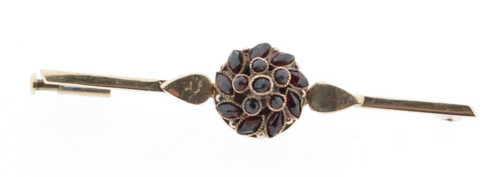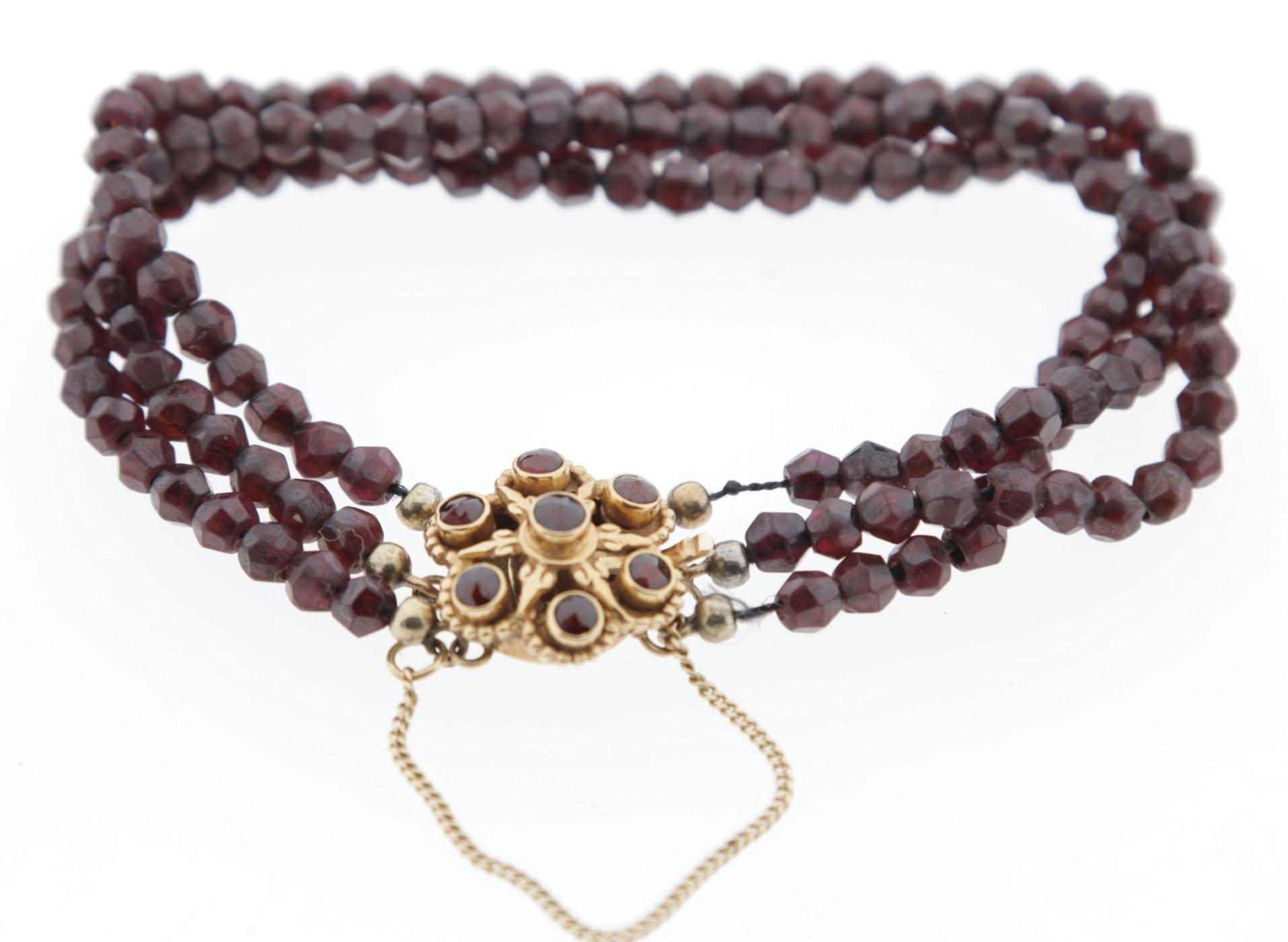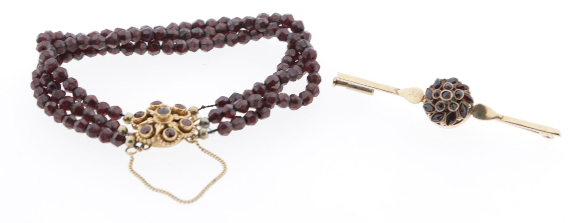 Granaten 3-strengs armband bezet met granaat en gouden broche bezet met granaat, 4,8 gram,