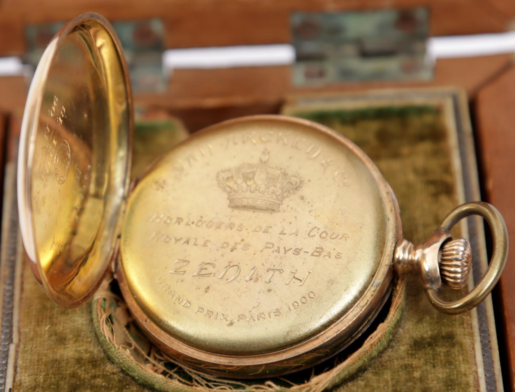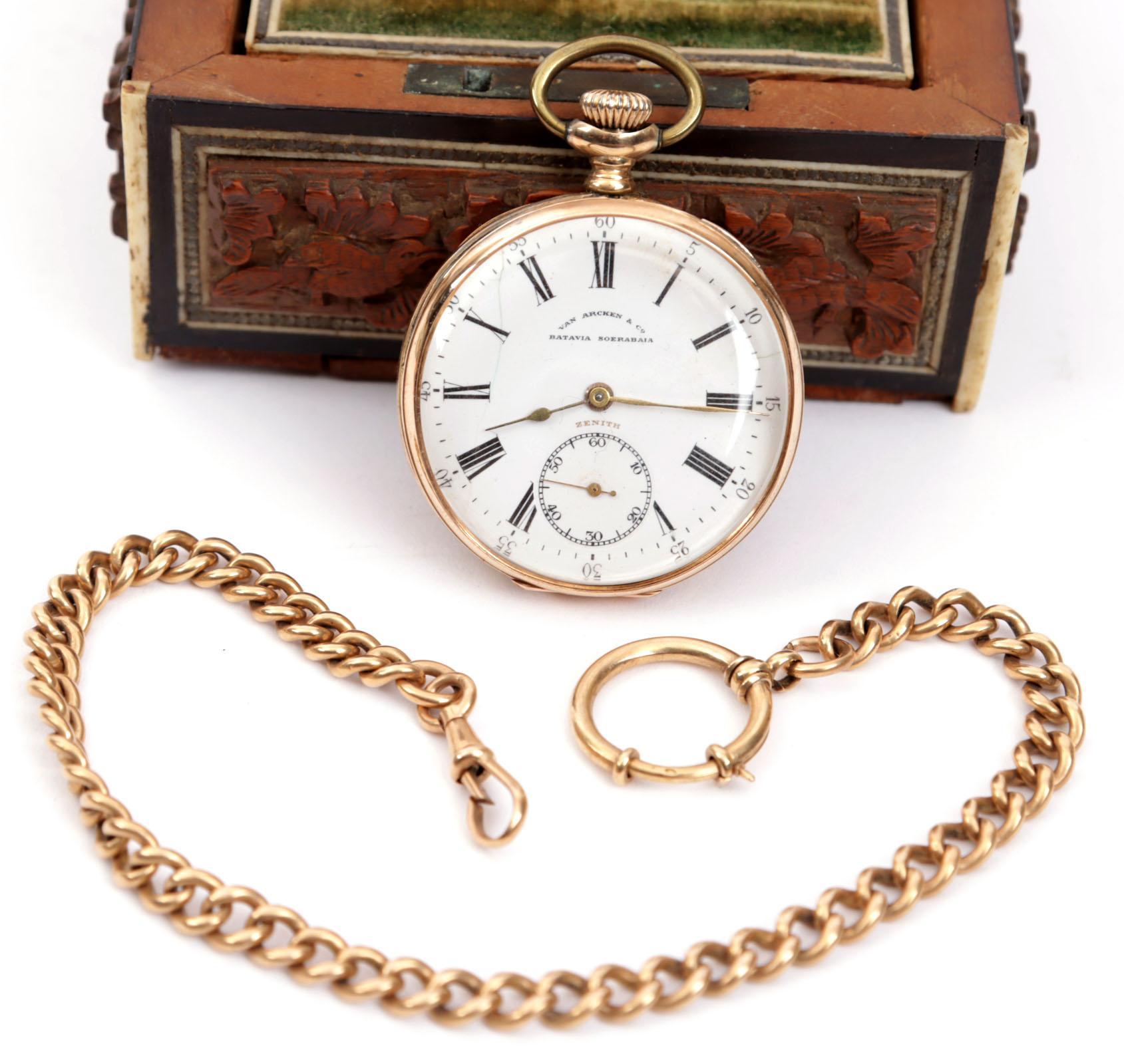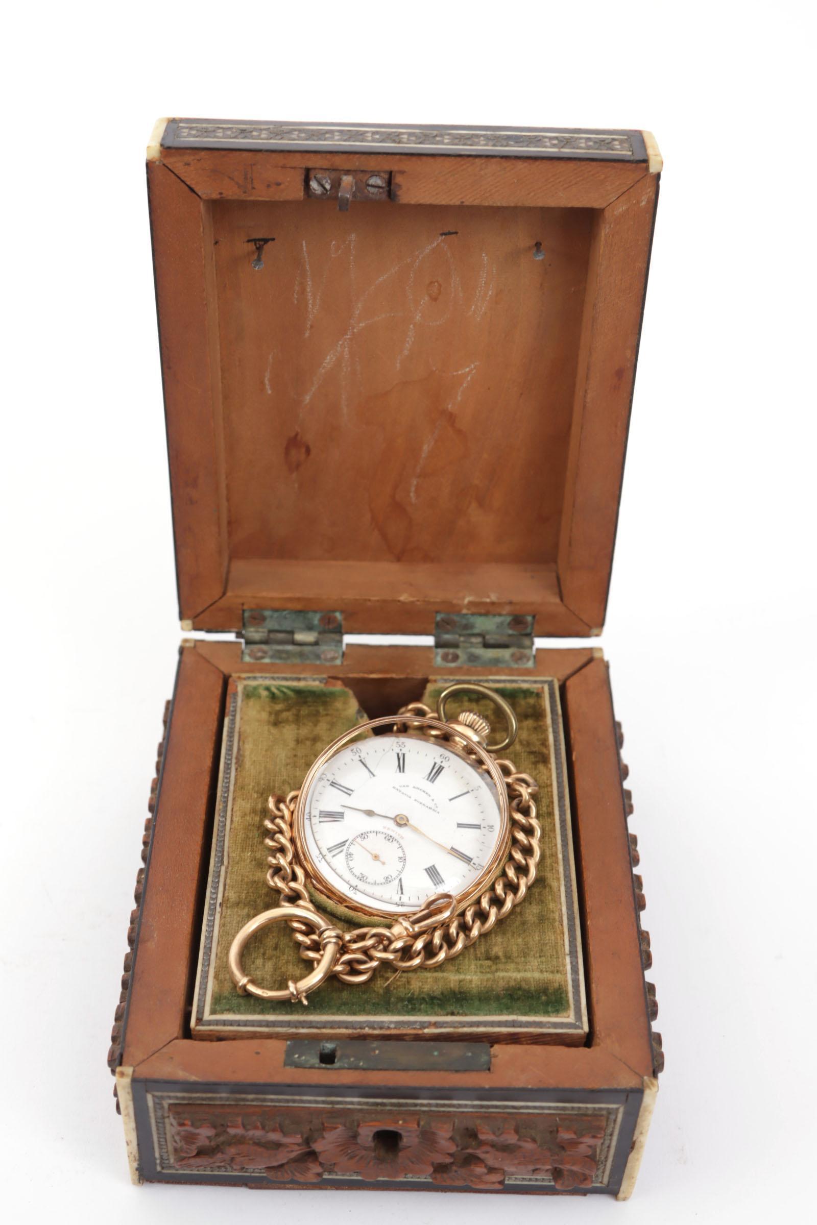 Antiek vestzakhorloge aan 14 kt. gouden ketting in bijpassende ingelegd houten opbergkistje, uurwerk gesigneerd van Arcen & Co, Batavia, Surabaya