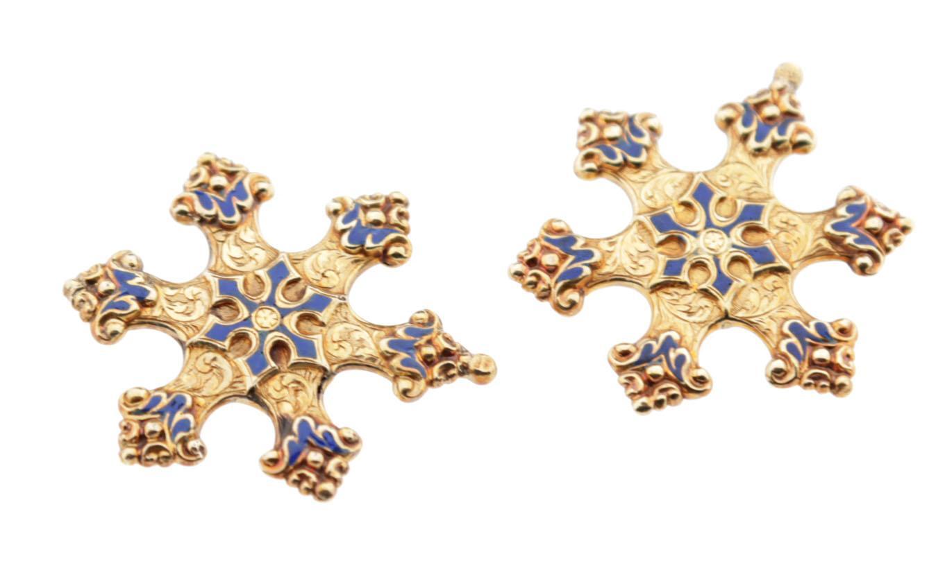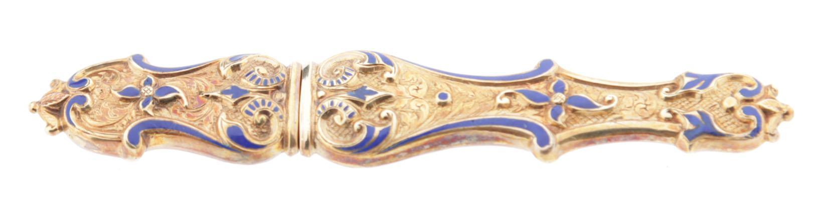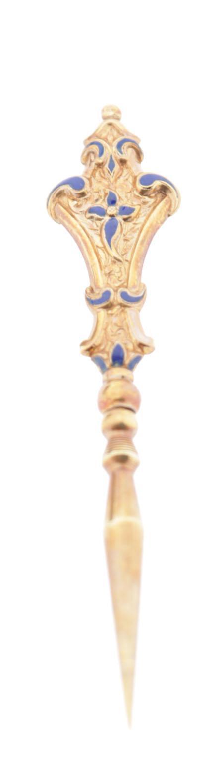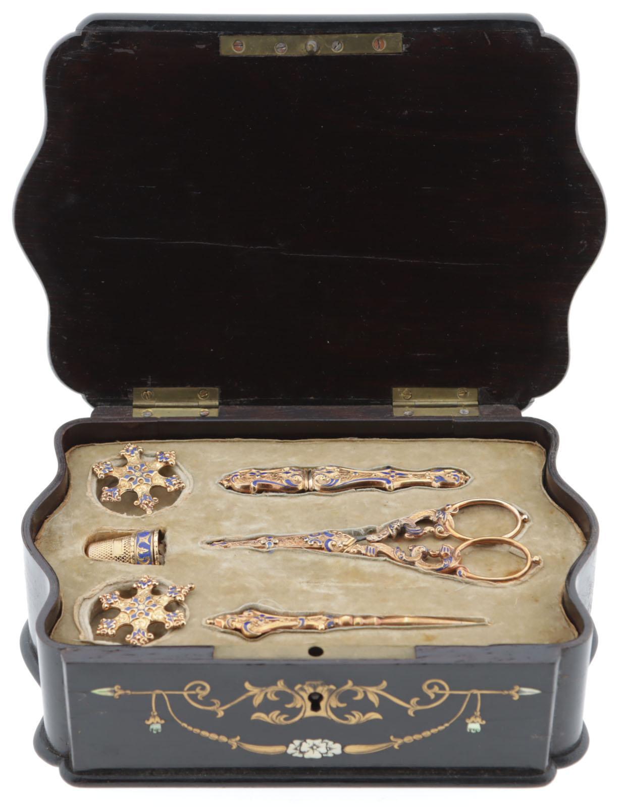 Antieke met parelmoer en messing ingelegde naaiganituurdoos met geëmailleerde gouden inhoud van w.o. schaar (klein defect), naaldenkoker, vingerhoed, prikpen en 2 kluwenwinders, goudgewicht totaal ca.29 gram
