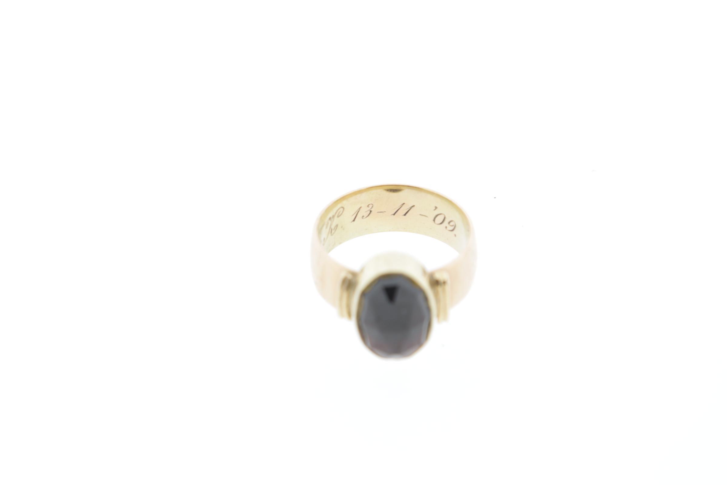 14 Kt. gouden ring bezet met gefacetteerde granaat, rm 18,75, 10,1 gram