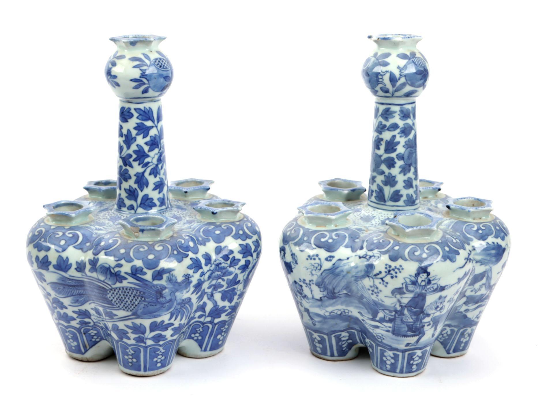 2 Antieke blauw/wit met krijgers in landschap gedecoreerde Chinees porseleinen tulpenvazen, h.25 cm.
